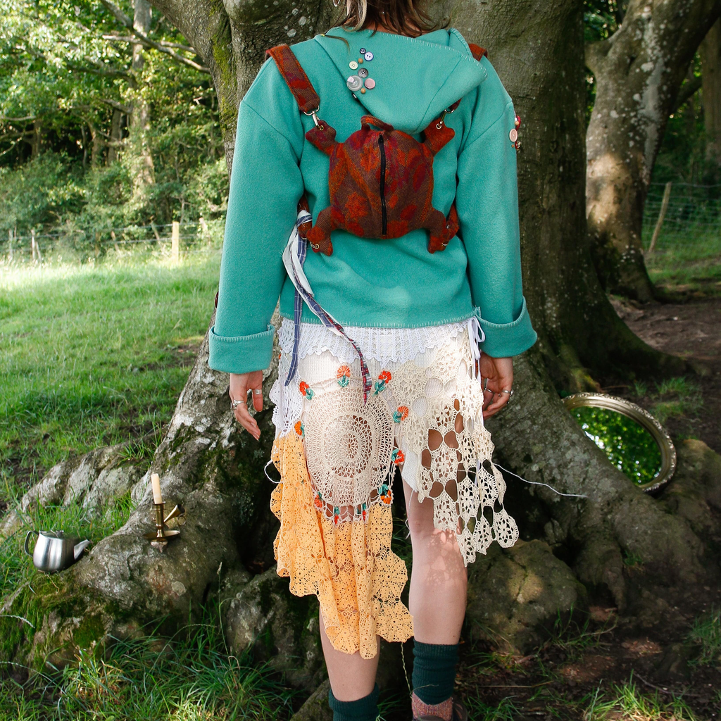 Rosie Evans is the eponymous ‘High Fantasy’ luxury fashion label creating one-off and small runs of anachronistic historically-inspired fashion, following the ethical practice of upcycling old textiles and materials. Rosie works solely using ‘Fabrics with a past’. 1950s hand-embroidered tablecloths, old silk curtains and patchwork scrap fabric make up the bulk of her collections. As well as working to save fabric waste, Rosie also collects plastic fruit packaging tape from the Cardiff food market to use as boning for her corsets and dresses.