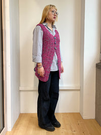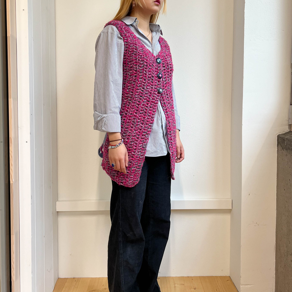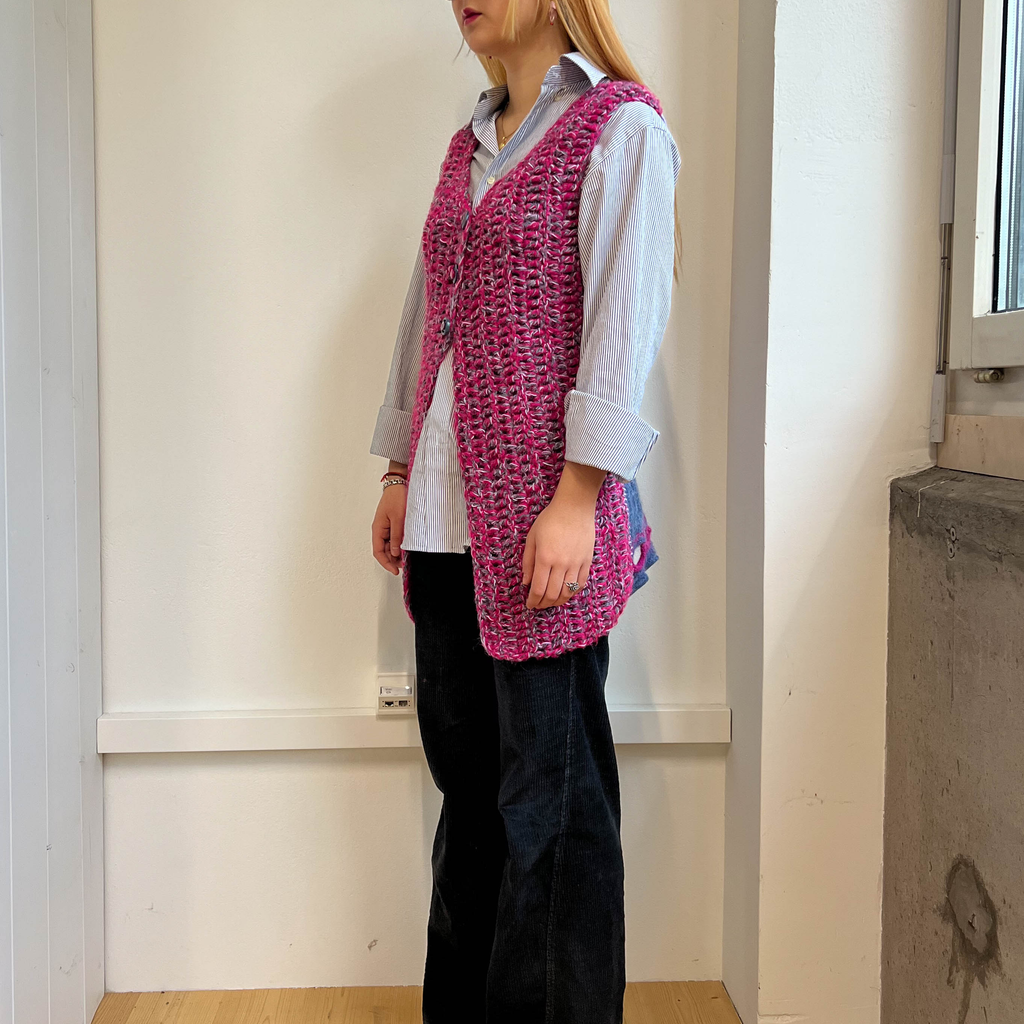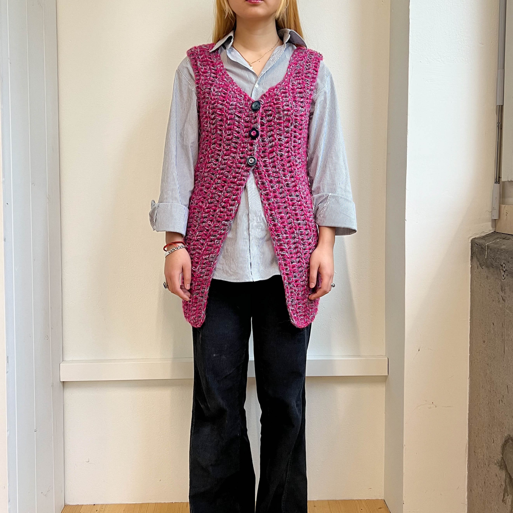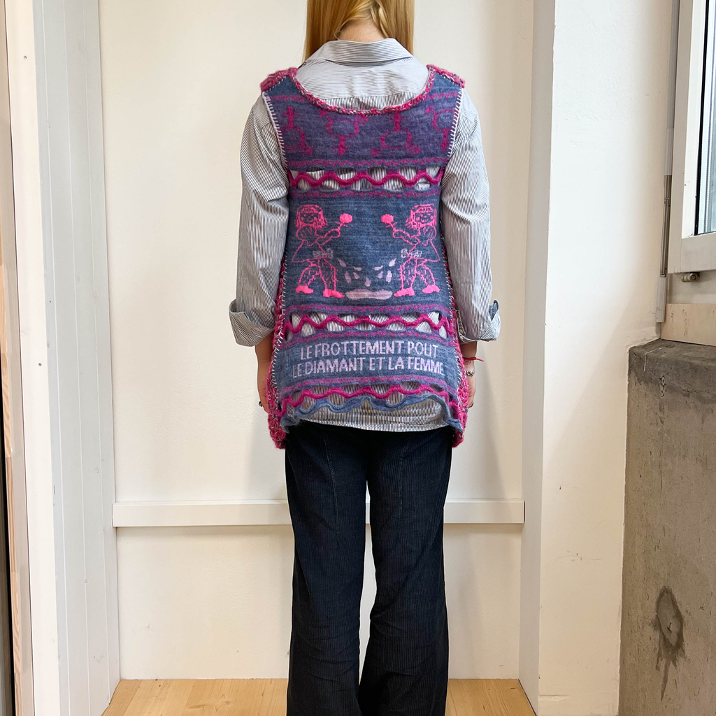 Crochet vest with machine knitted part of peeing girls graphic at the back. Standard fit.