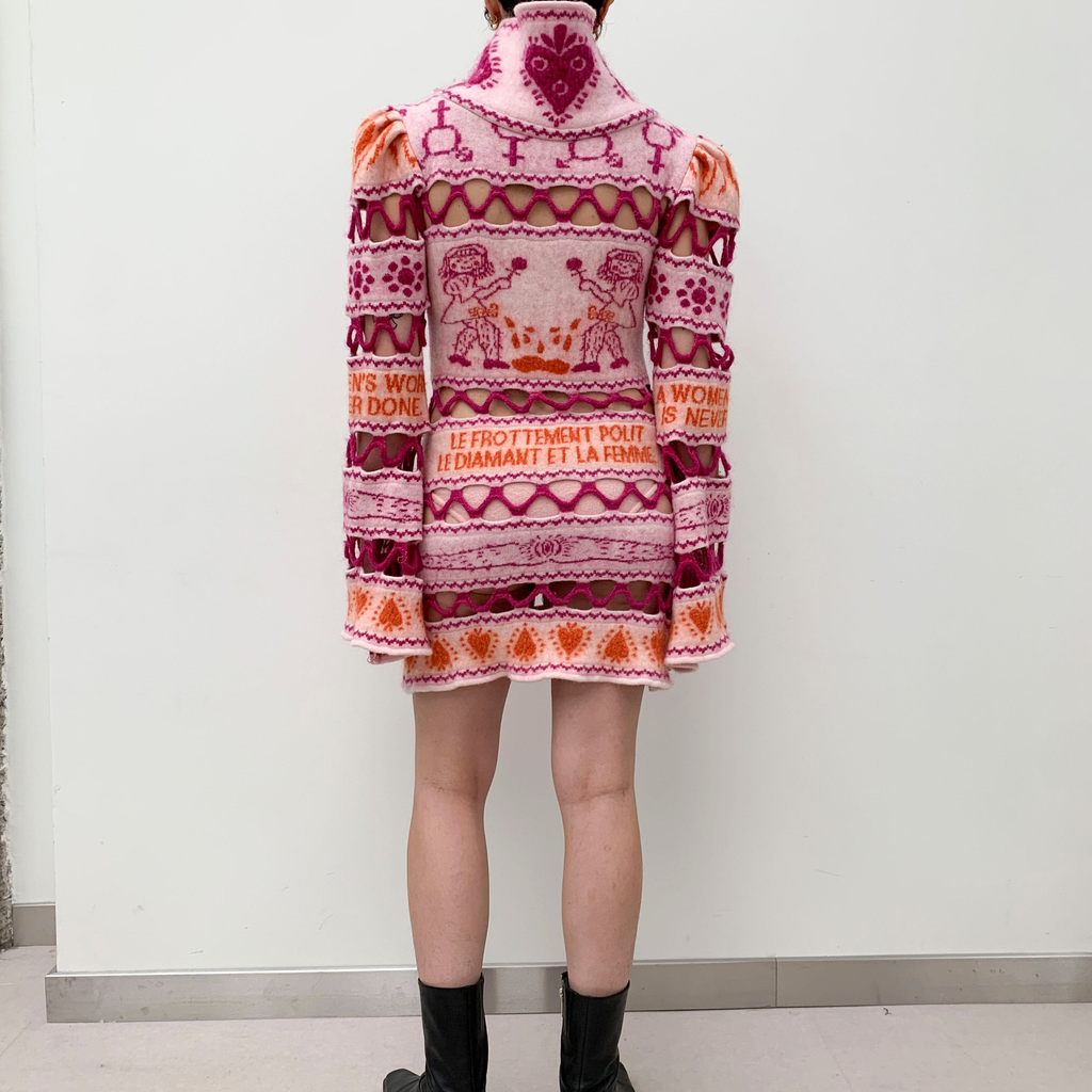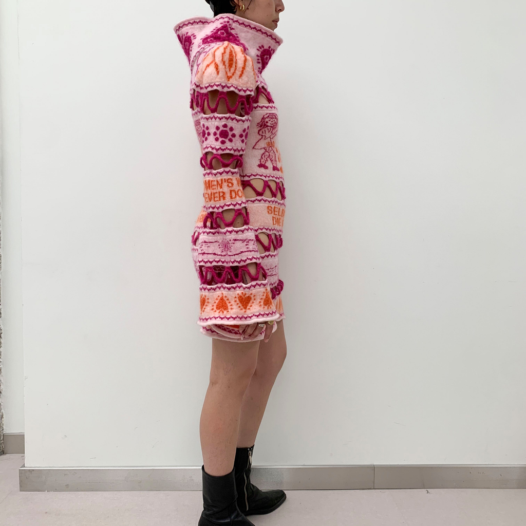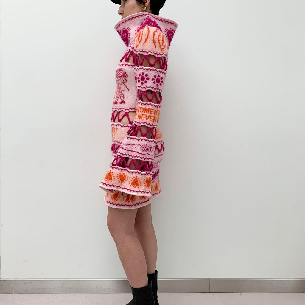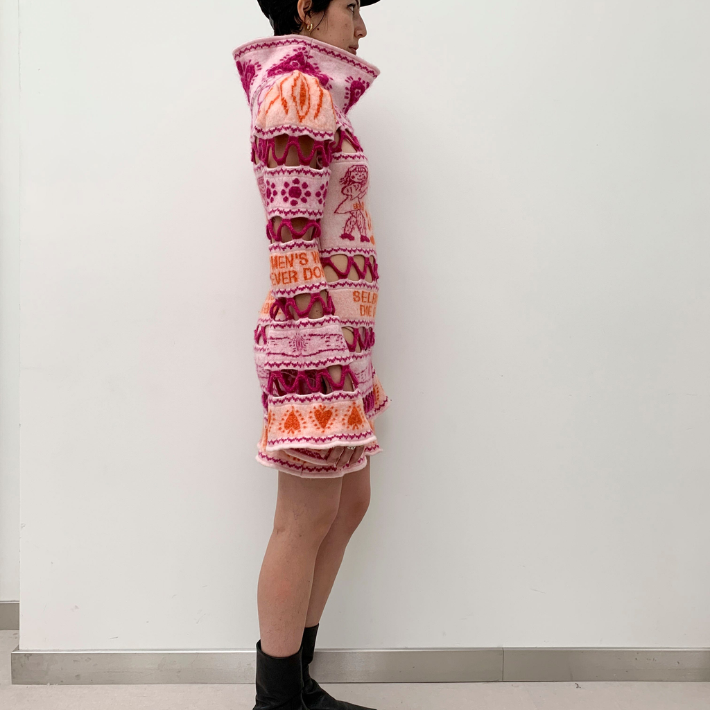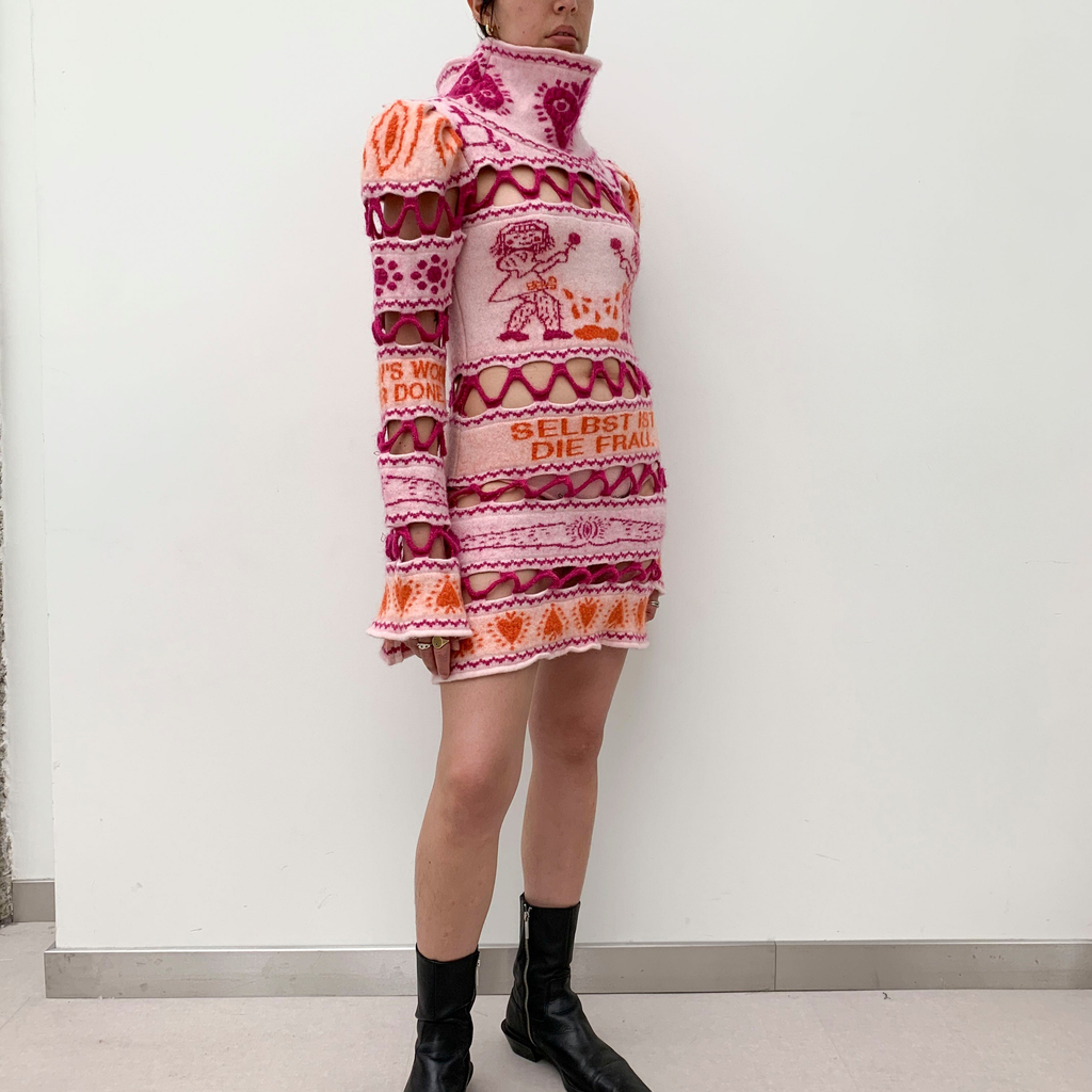 Knitwear dress machine knitted with graphics of peeing girls and different sayings.