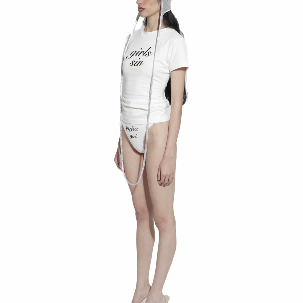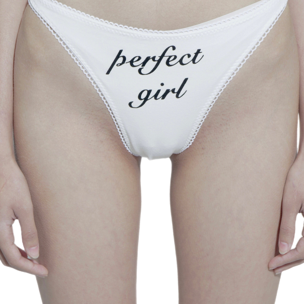 Cotton thong, finished with lace elastic, black flock print.