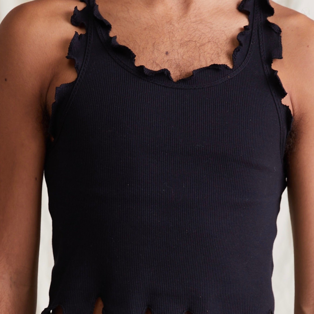 Classic tank top in black ribbed cotton jersey with petals details at the hem