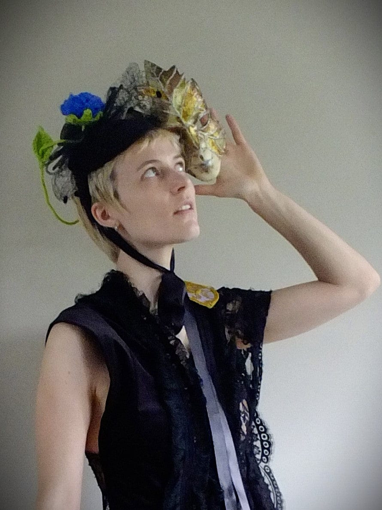 Headpiece from the Opera collection, featuring a found vintage mask, a crochet blue rose, a little tablet hat, and atlas ribbons. Each headpiece is unique and handmade in our atelier.