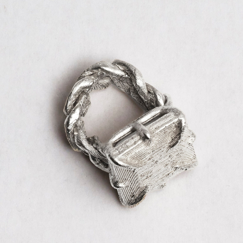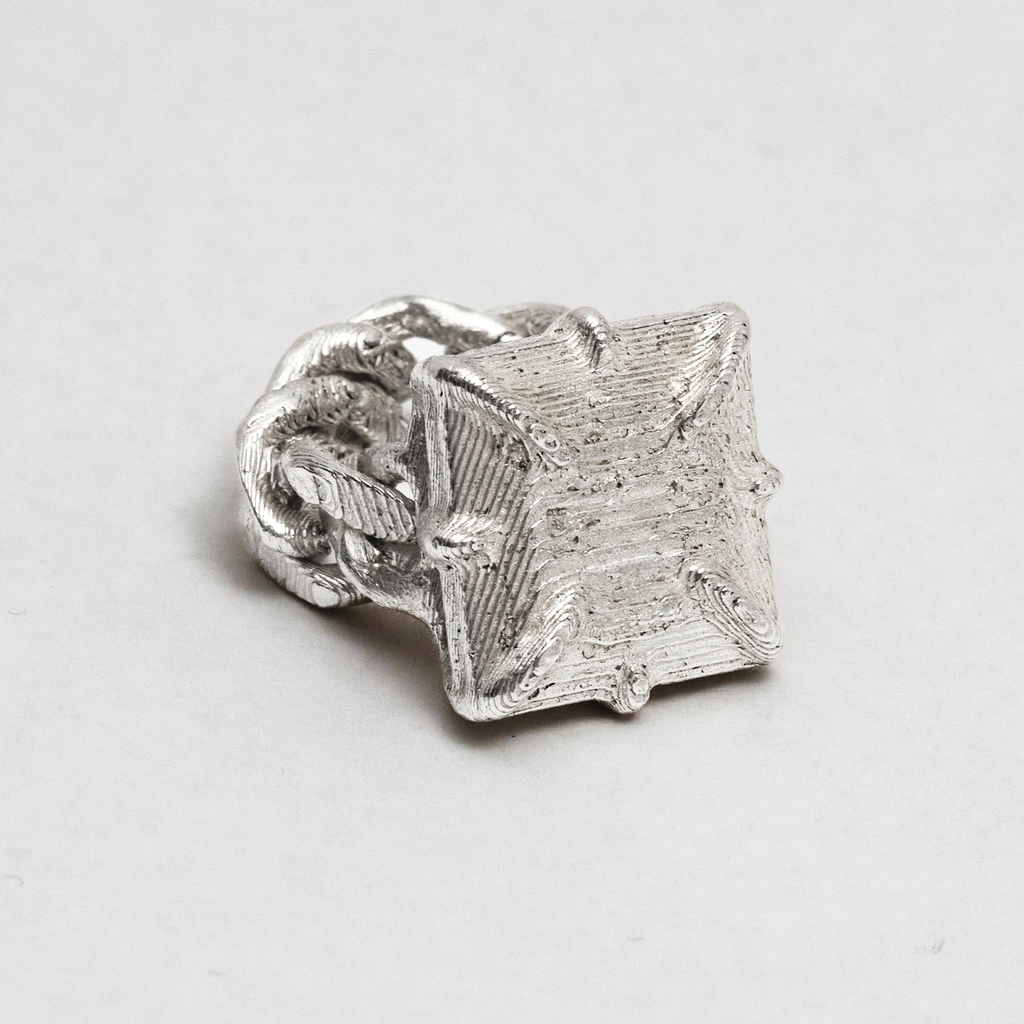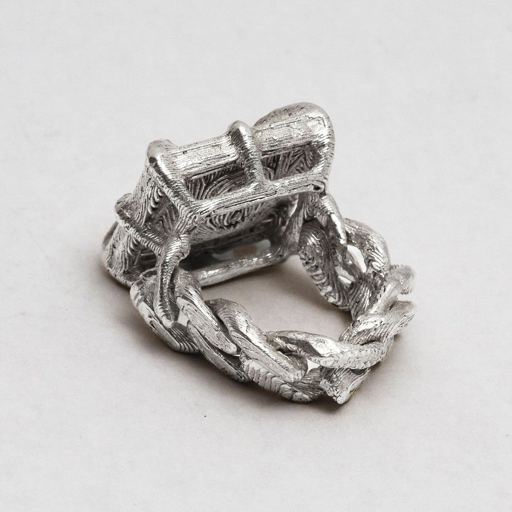 Big solid silver stone laced into a loose link cuban chain. Features unique topography textures. Each handmade and unique. Available in solid or loose-link chain styles.