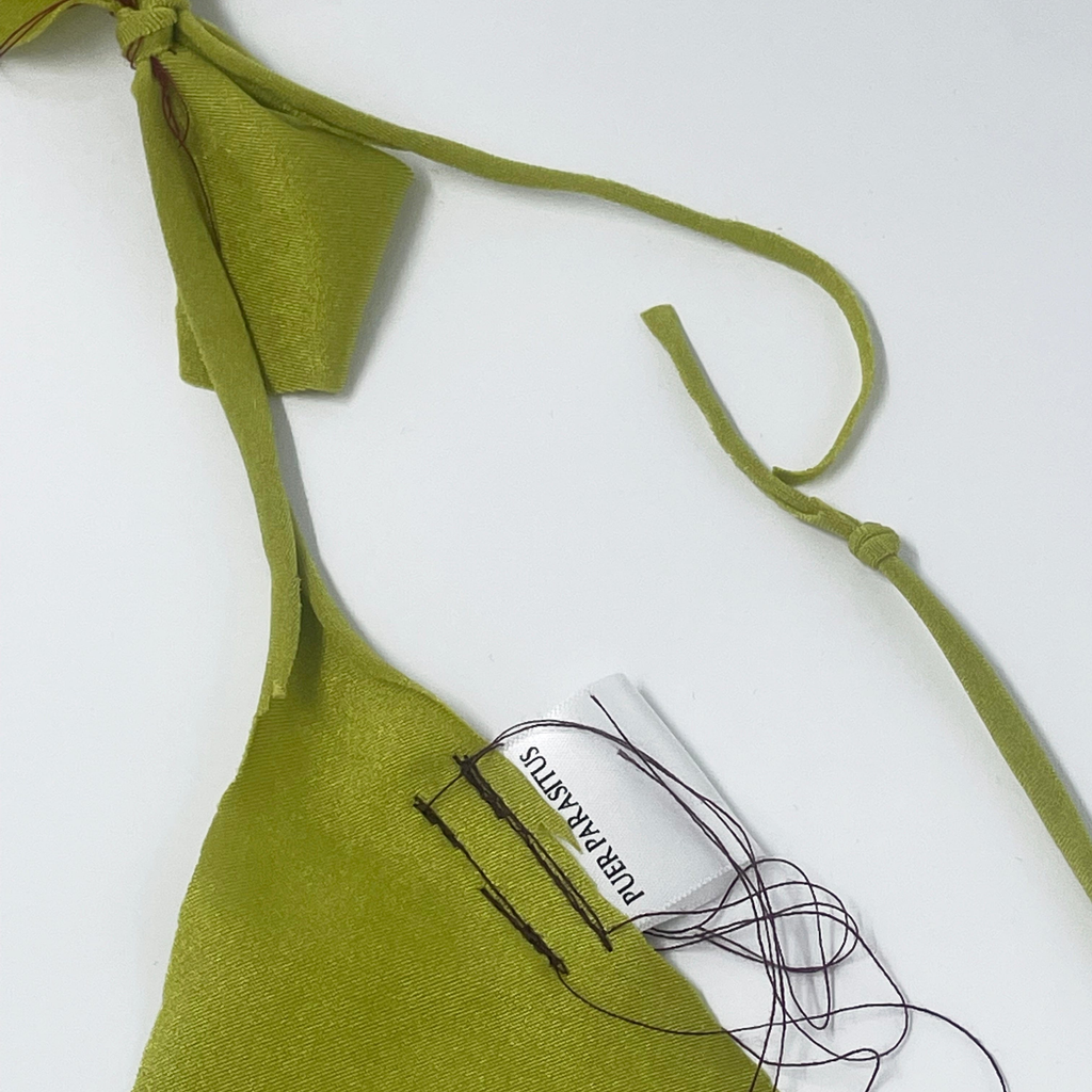 Founded in Copenhagen in 2021, Puer Parasitus works within the field of styling, costume design and commissioned pieces. The label creates sculptural pieces and unique objects within the field of art and explore themes linked to parenthood, sexuality, parasitical tendencies and the maternal bond. All works are unique and hand crafted from second hand sourced textiles by Puer Parasitus in their atelier in Copenhagen, DK.
