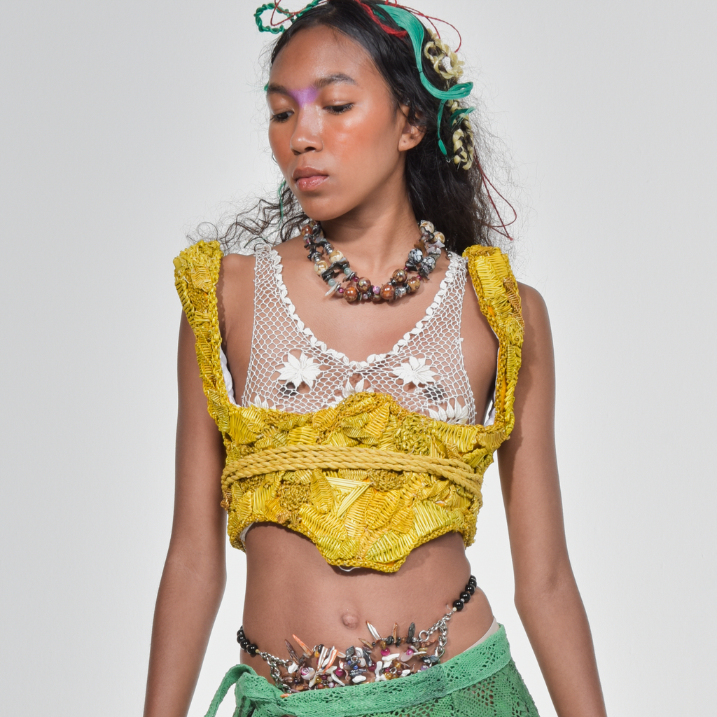 Embroidered corset in Colonião grass, handmade in partnership with master artisan Juão de Fibra.