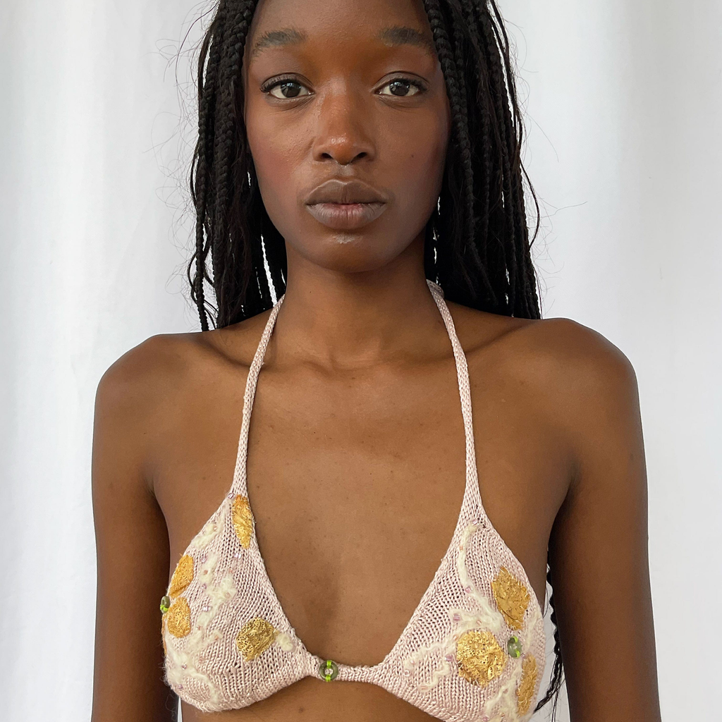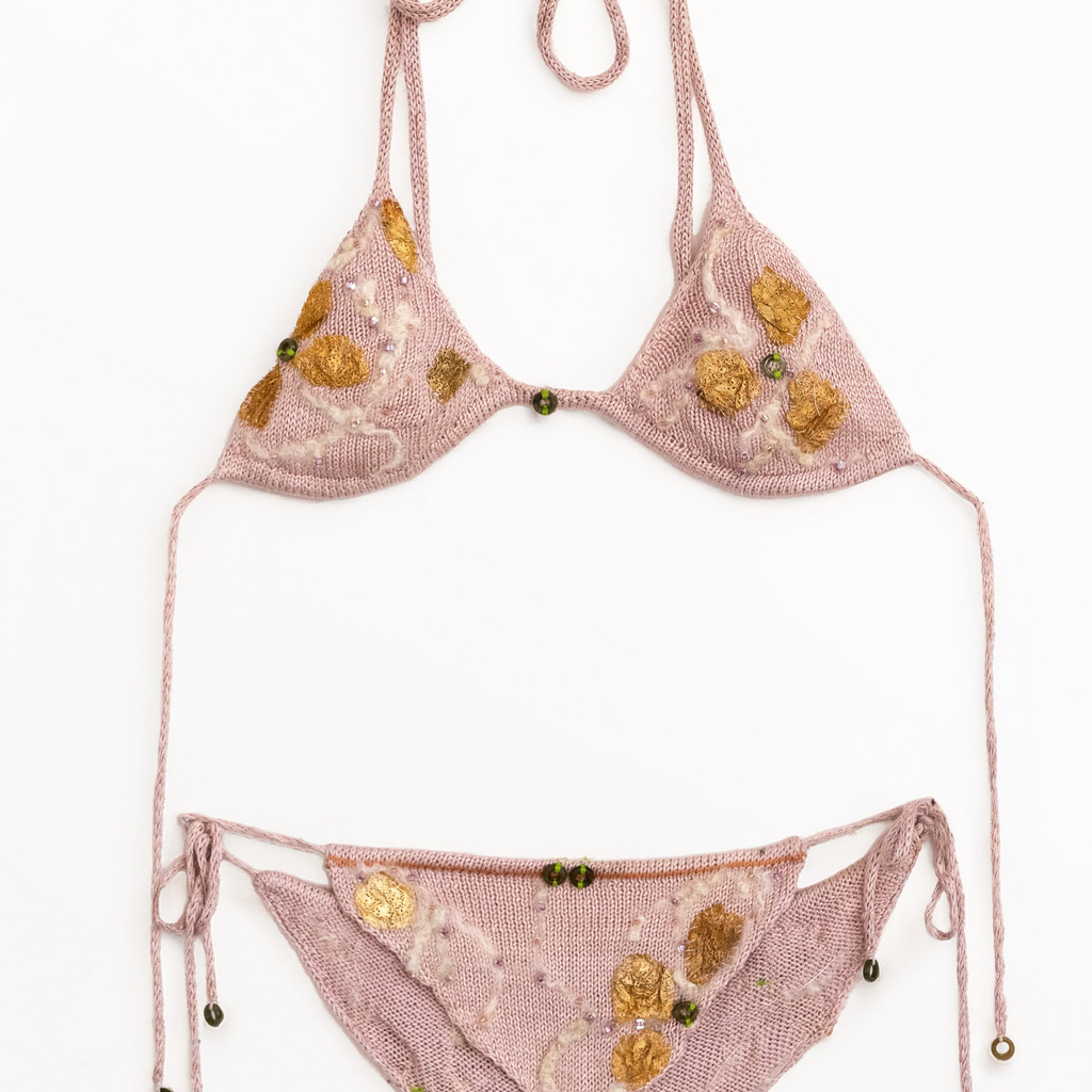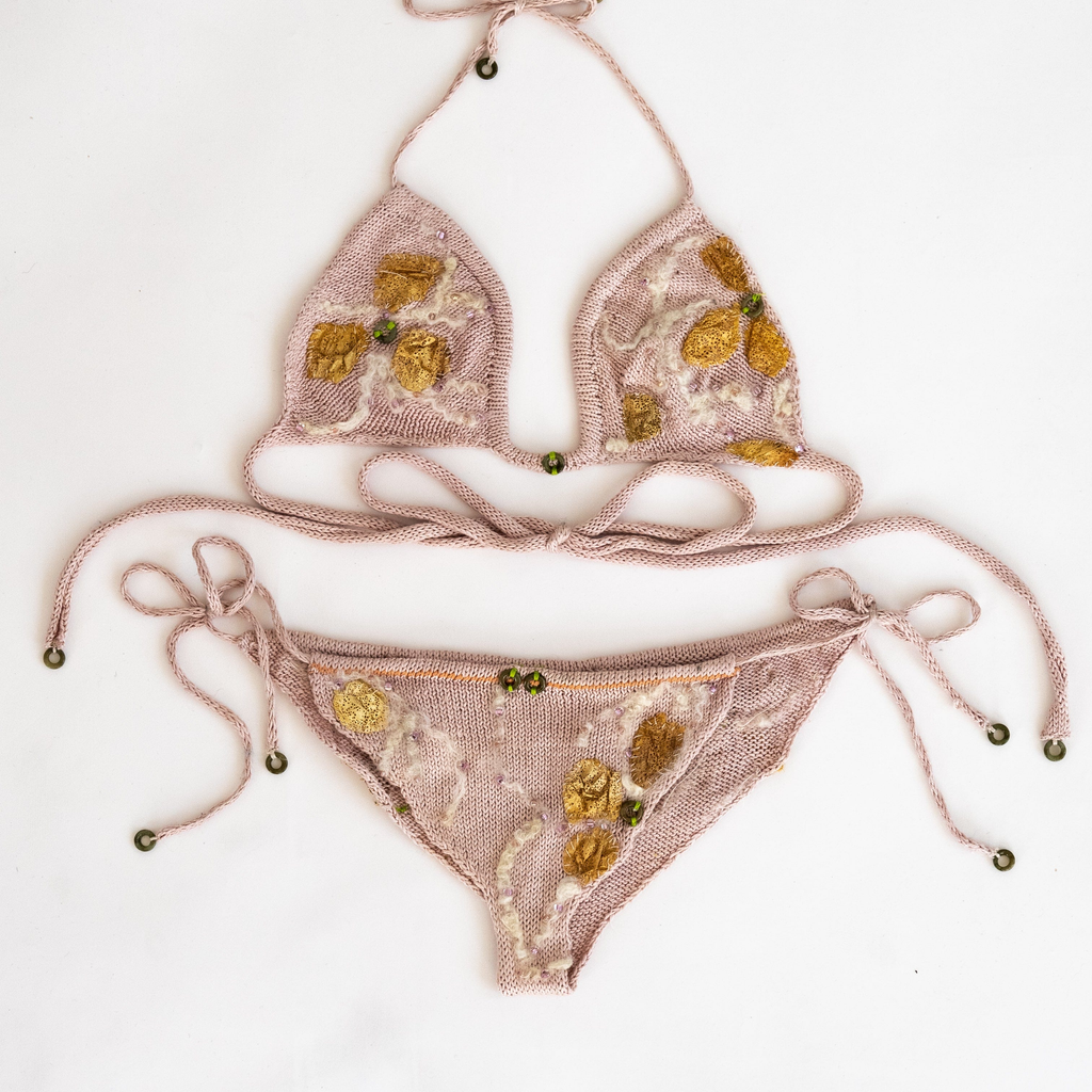 This Pink and Gold Daisy Bikini set by Grace Gui is knit with 100% Ahimsa Peace Silk sourced from North Carolina, embroidered with wild silk cocoons, genuine jade pendants, glass seed beads; the felting is wensleydale lamb locs from Pennsylvania.