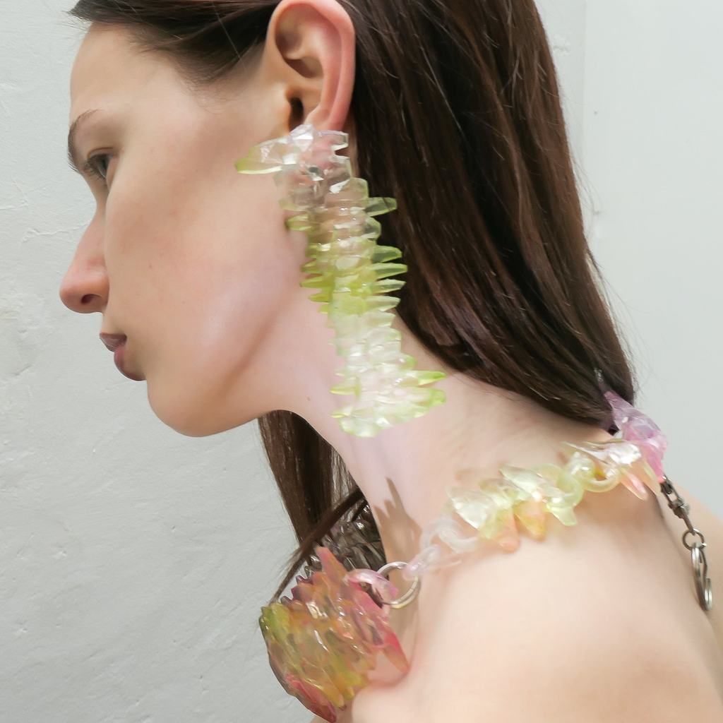 Bertie Garnett is an multidisciplinary artist who’s accessories combine patterns from ancient symbolism with digital software and interfaces. Garnett is interested in the parallels between digital and traditional crafts, and looks to depict ways in which 3D rendering and printing can embody a sense of organicism and enchantment.