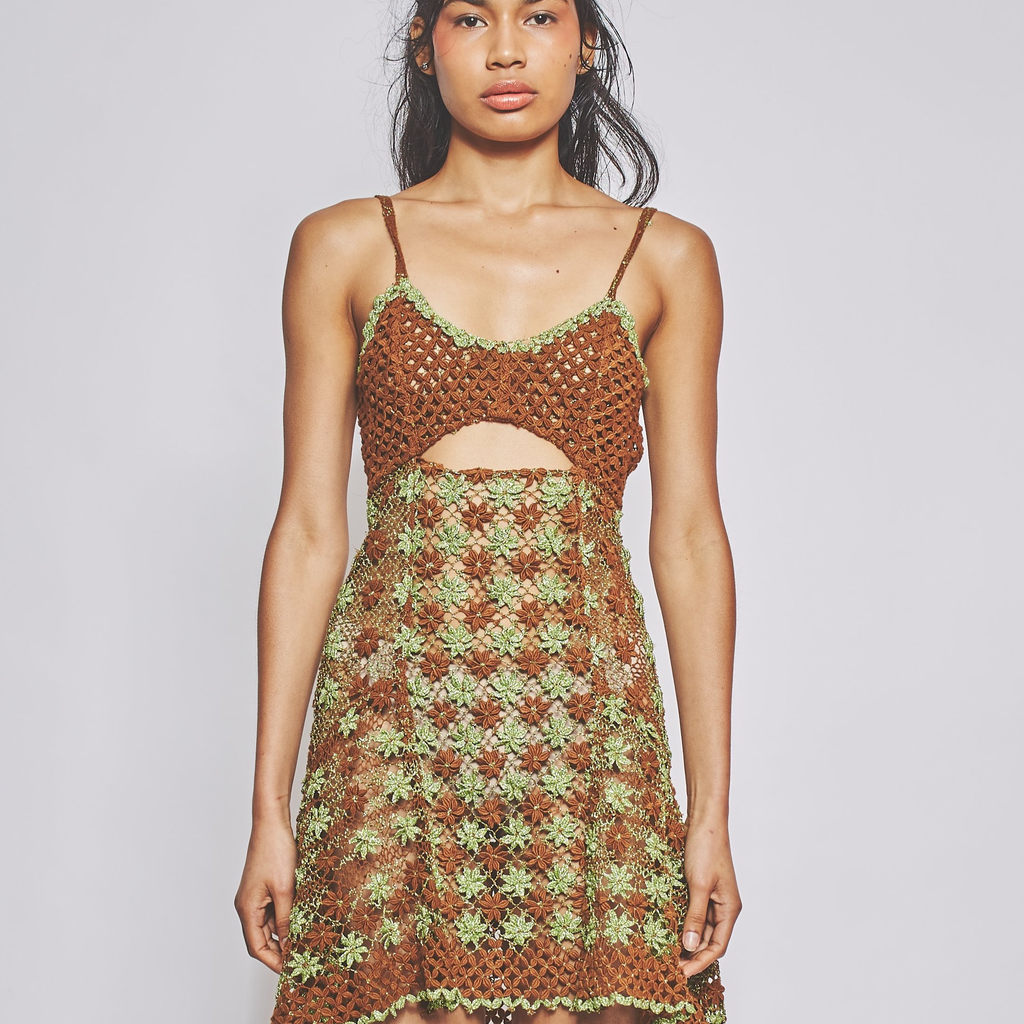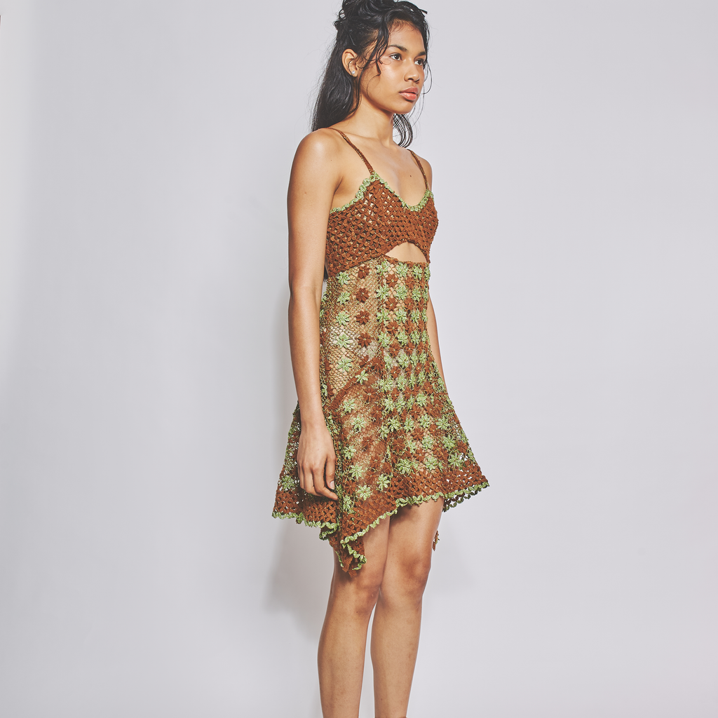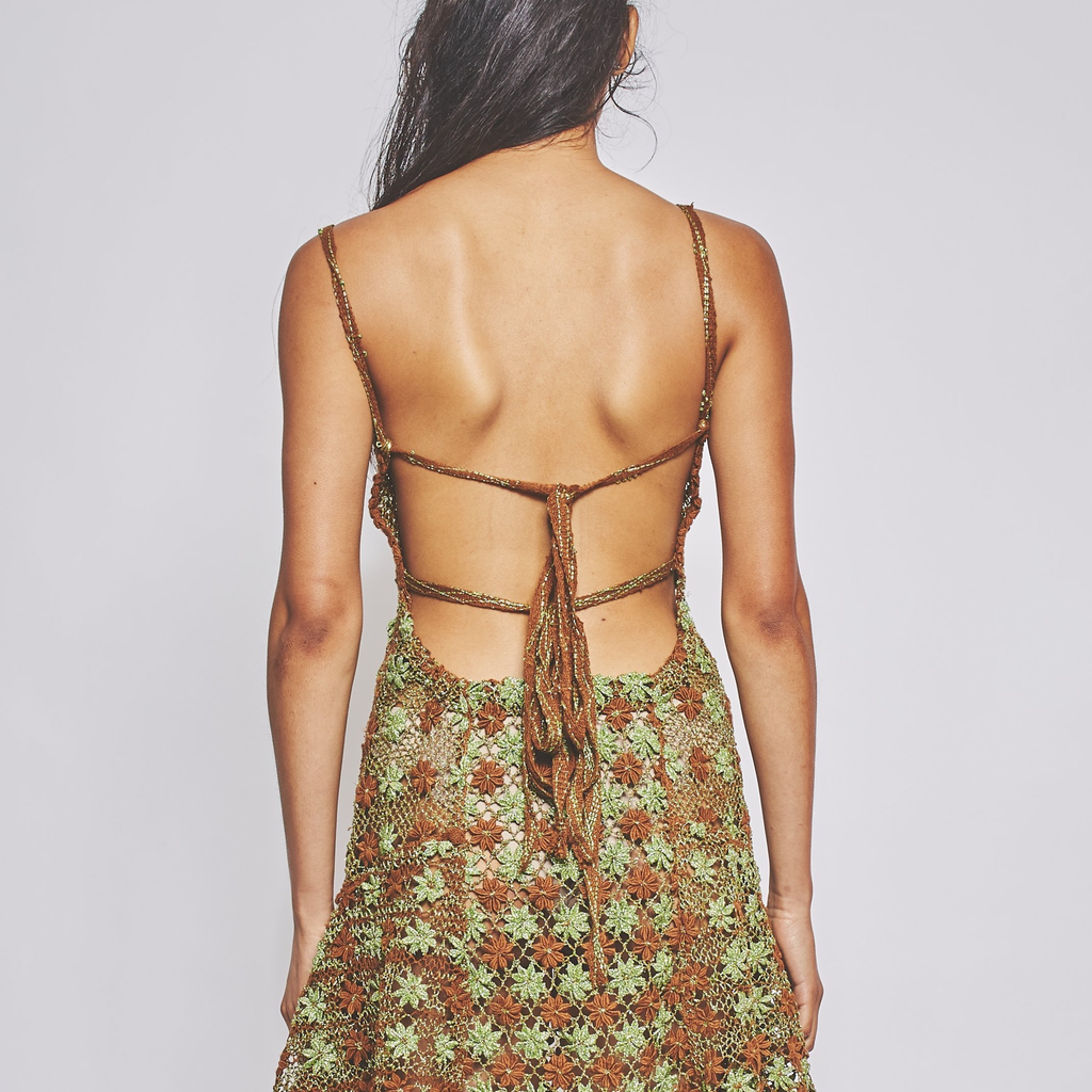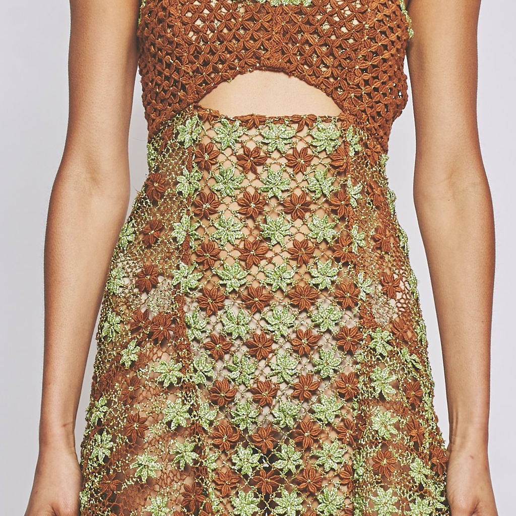 Handmade bobbin lace dress in bamboo and lurex fibres. Produced with lacemaker artisans in northern Brazil.
