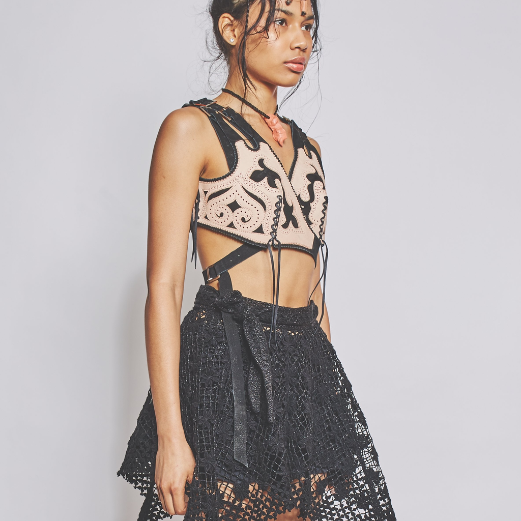Handmade bobbin lace skirt in bamboo and lurex fibres. Produced with lacemaker artisans in northern Brazil.