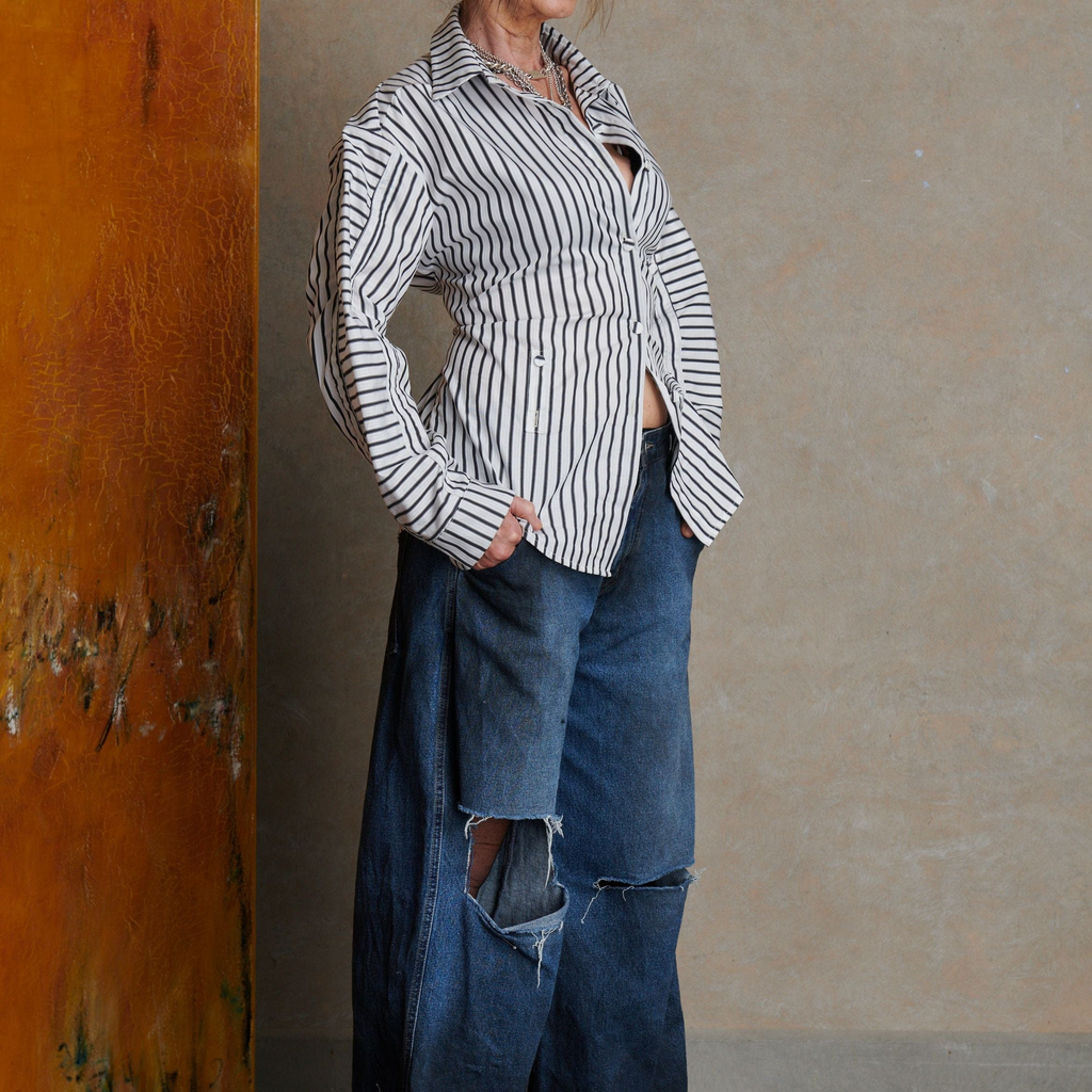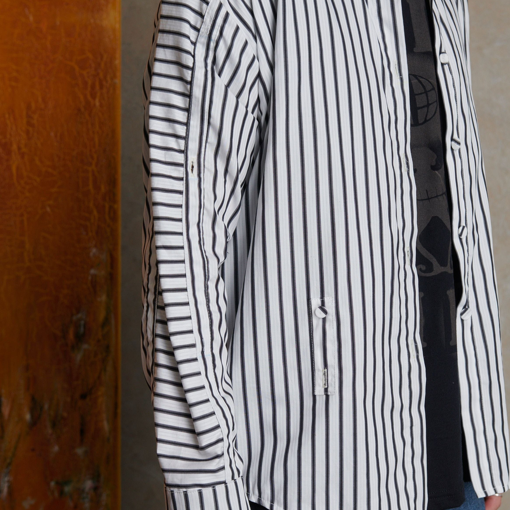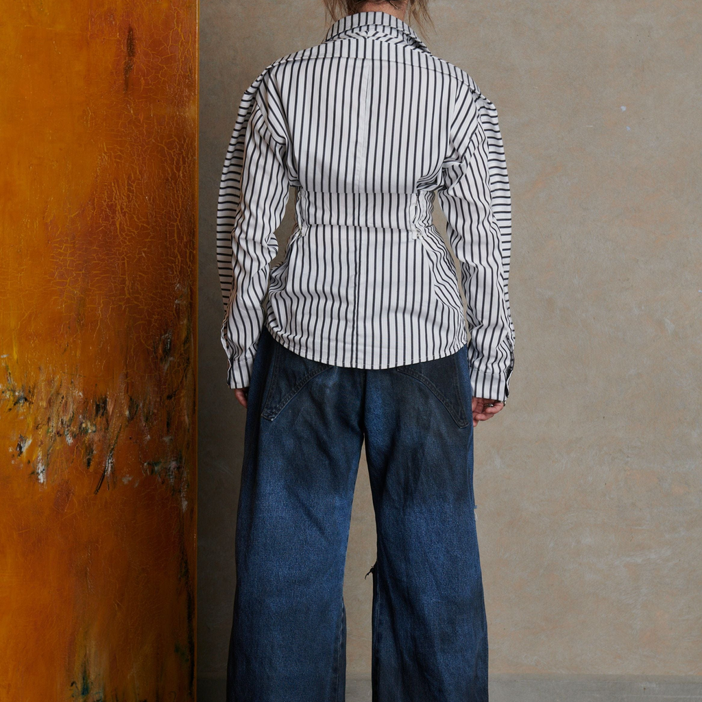 Button and buttonhole at elbow to make arm circumference smaller to emphasise the tuck that runs across the back and down the arm.