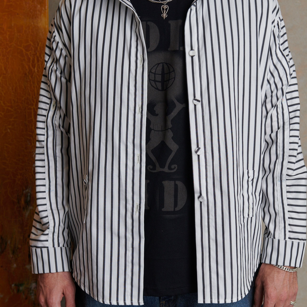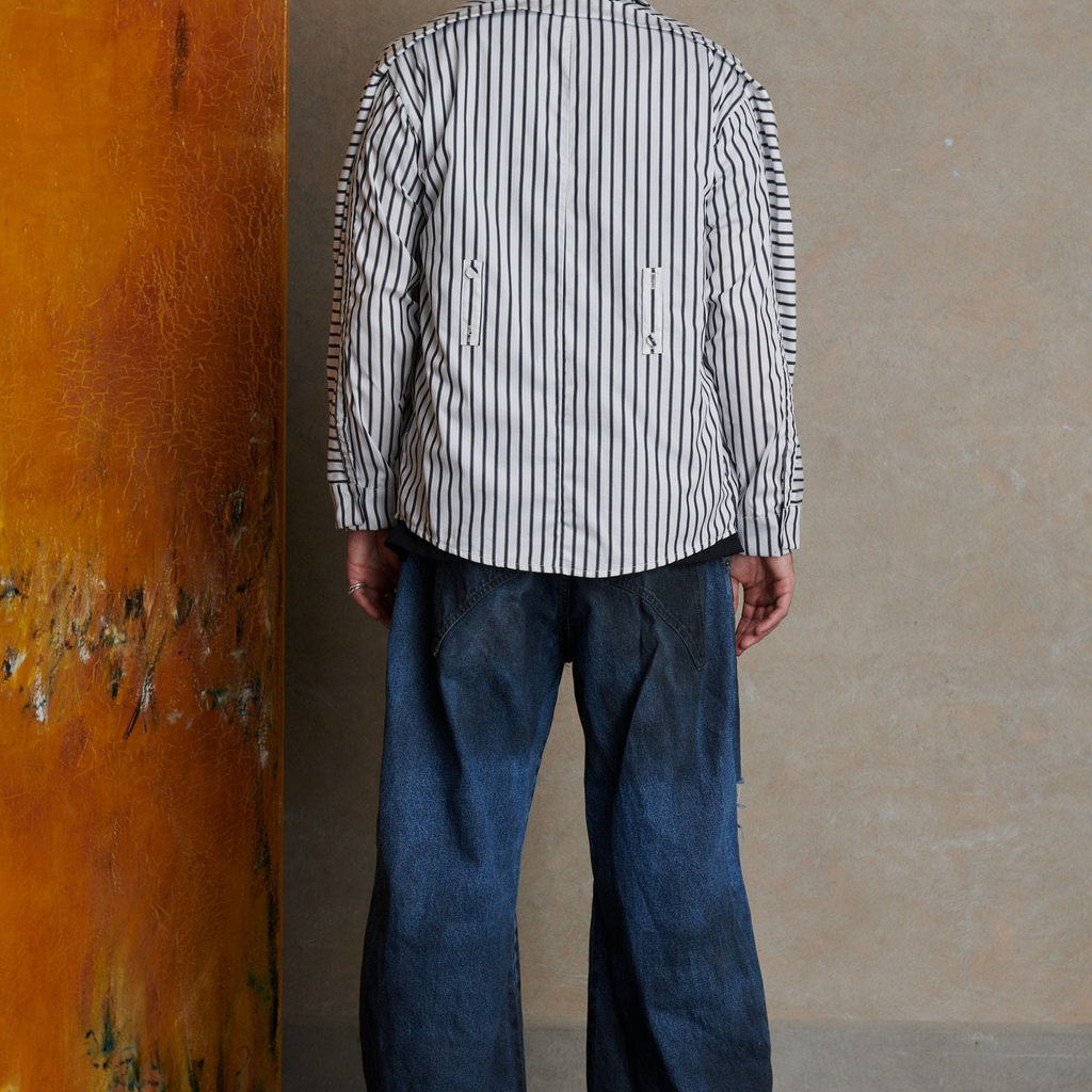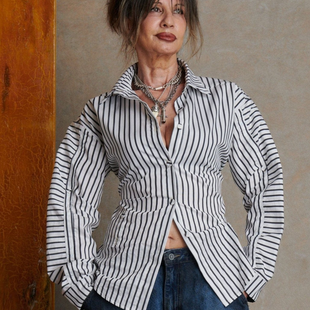 Button and buttonhole at elbow to make arm circumference smaller to emphasise the tuck that runs across the back and down the arm.