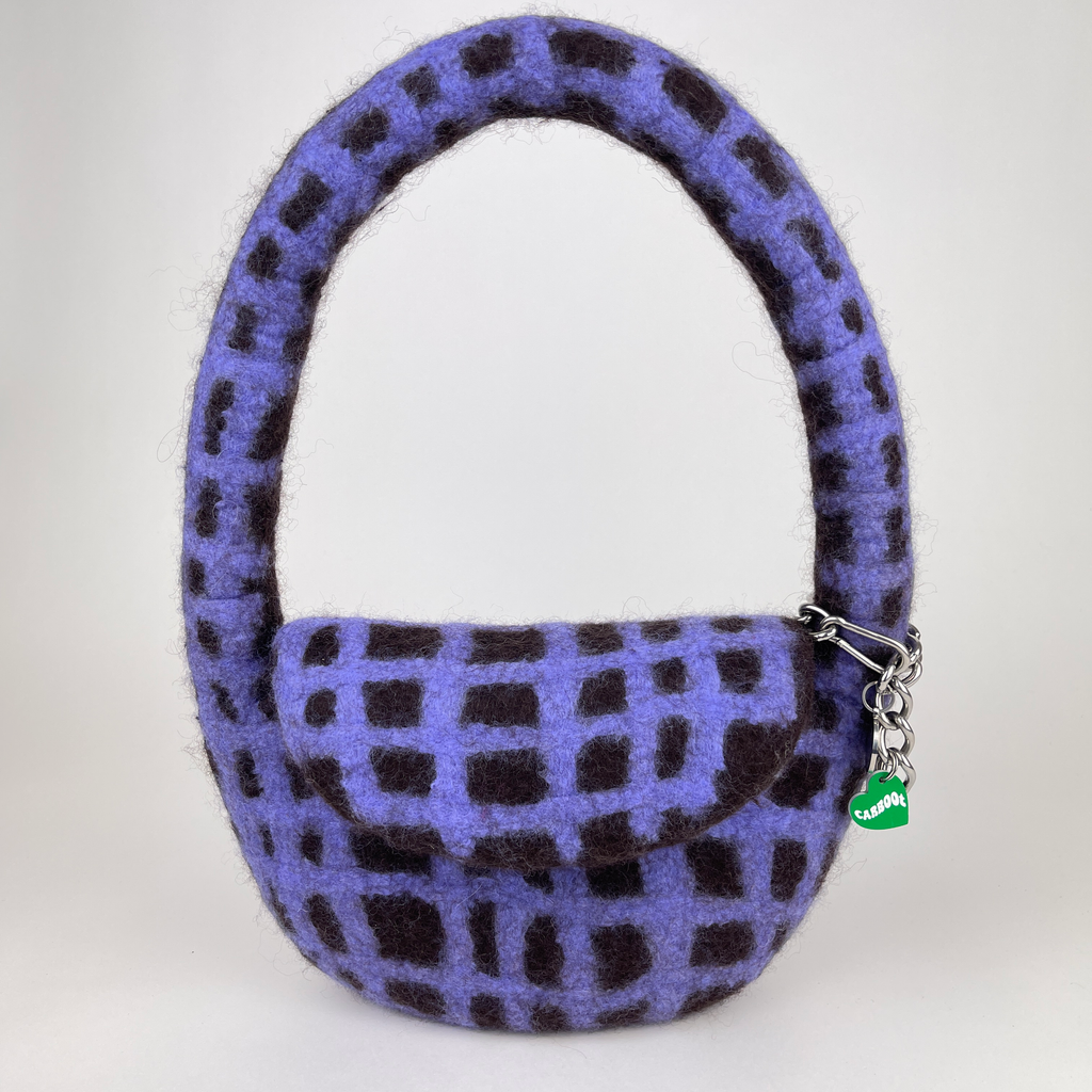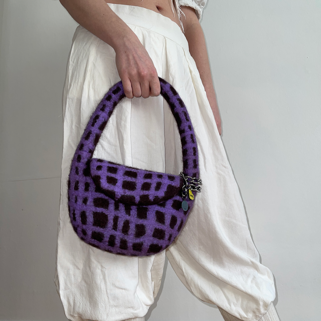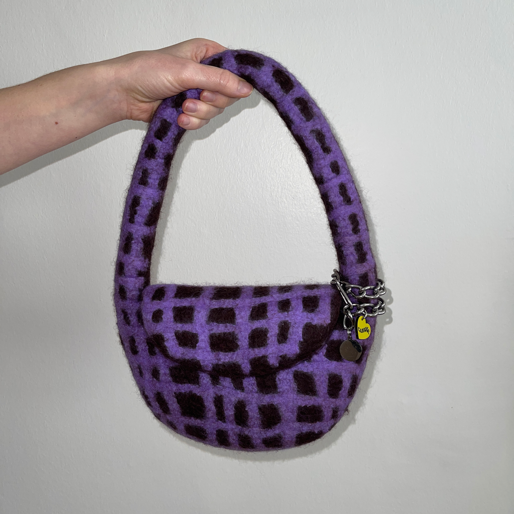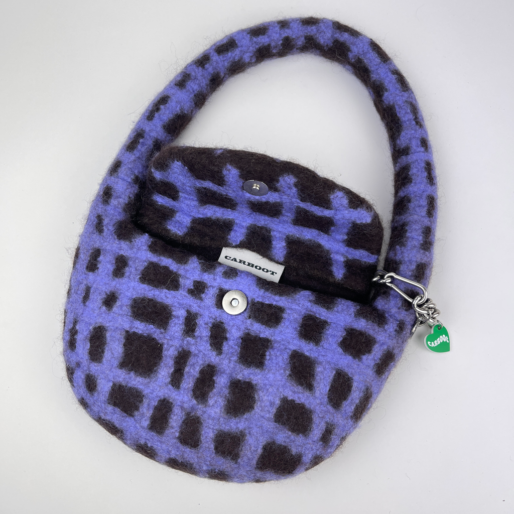 A slim, hand-felted round shoulder bag with an integrated plaid pattern. Fastened with a silver Riri zip and finished with a stainless steel chain & Carboot charms.