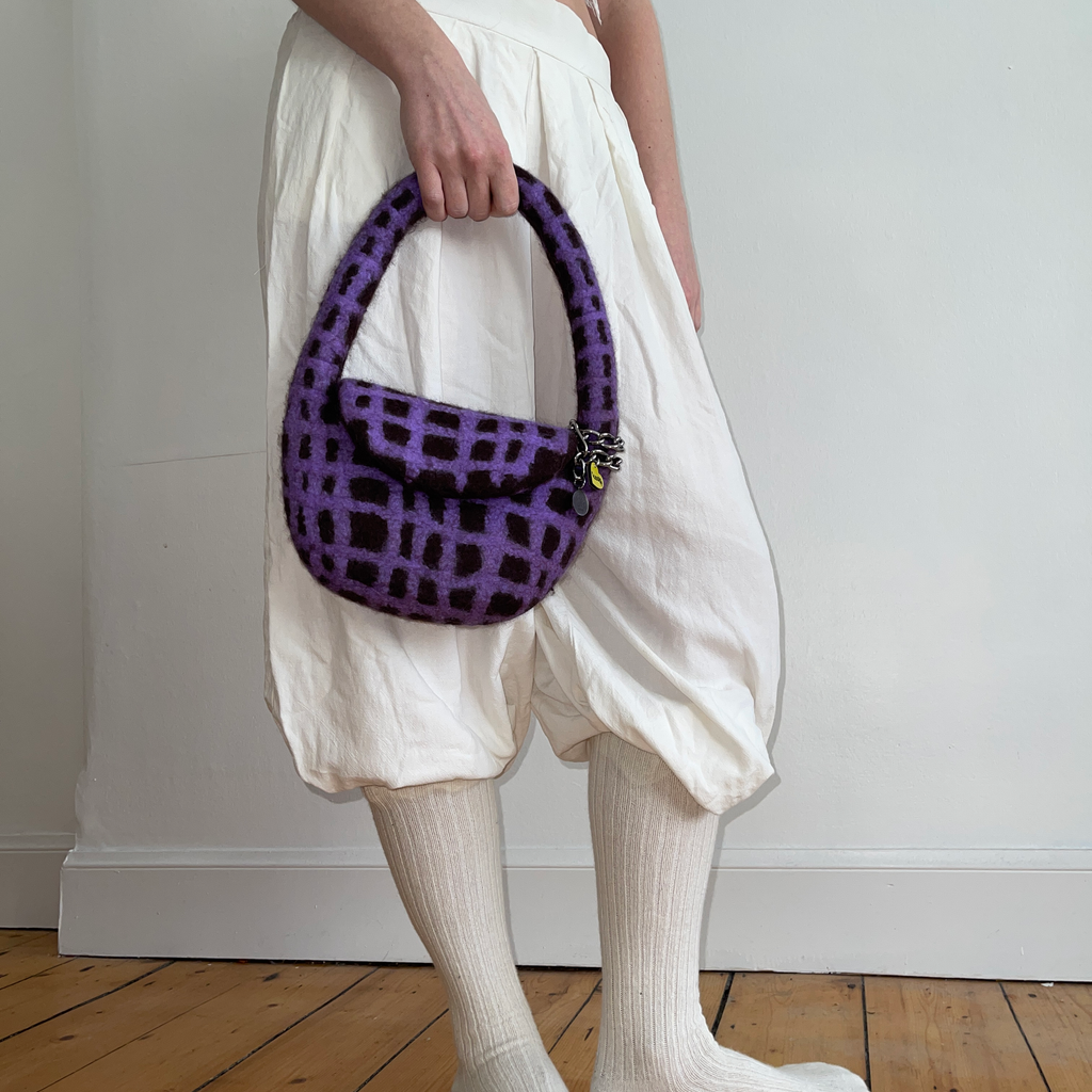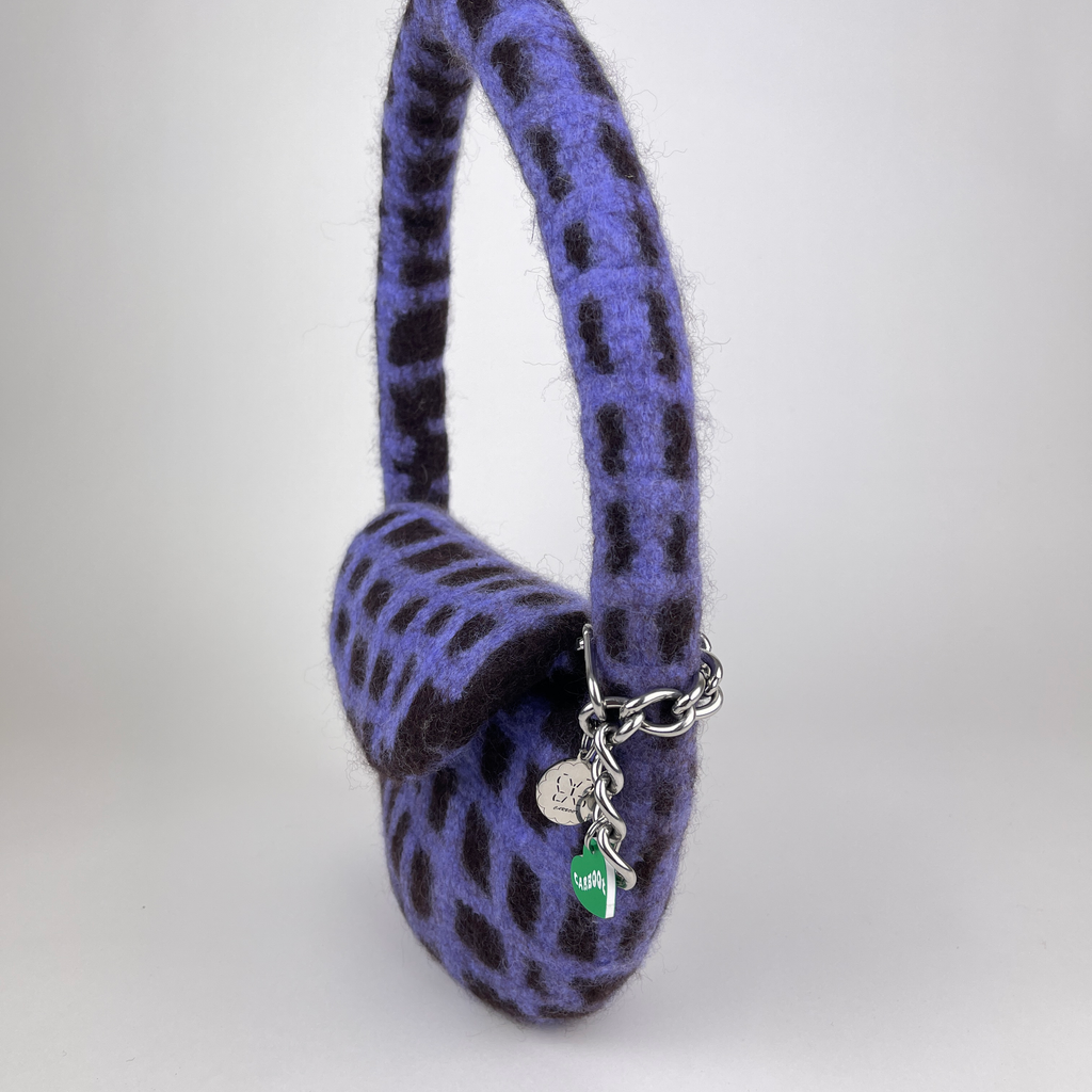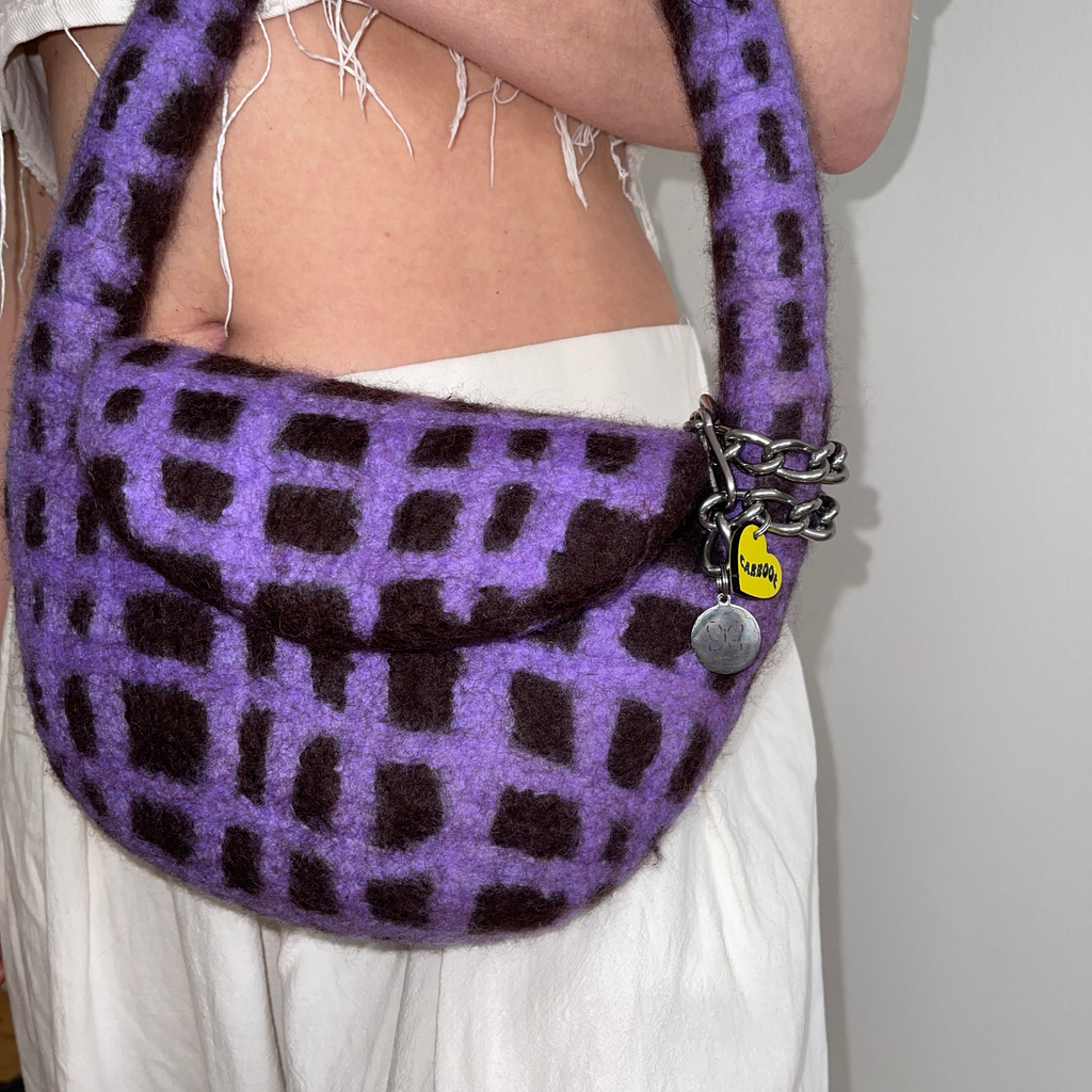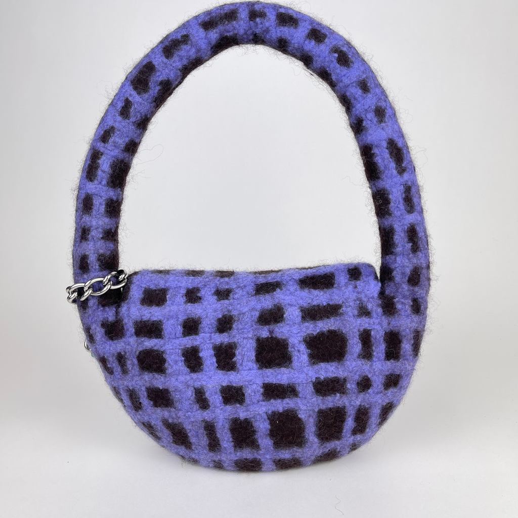 A slim, hand-felted round shoulder bag with an integrated plaid pattern. Fastened with a silver Riri zip and finished with a stainless steel chain & Carboot charms.