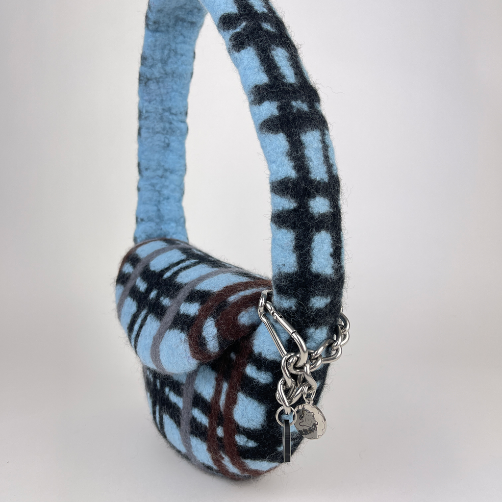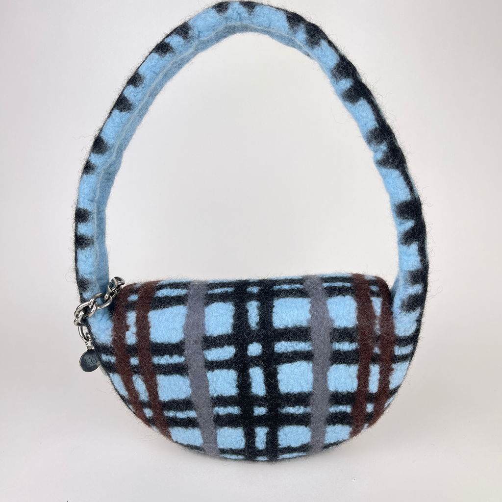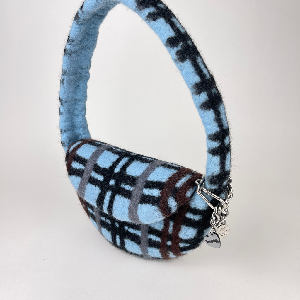 A solid, hand-felted rounded shoulder bag with an integrated plaid pattern. Fastened with a flap closure with a snap fastener. Finished with a stainless steel chain & Carboot charms.