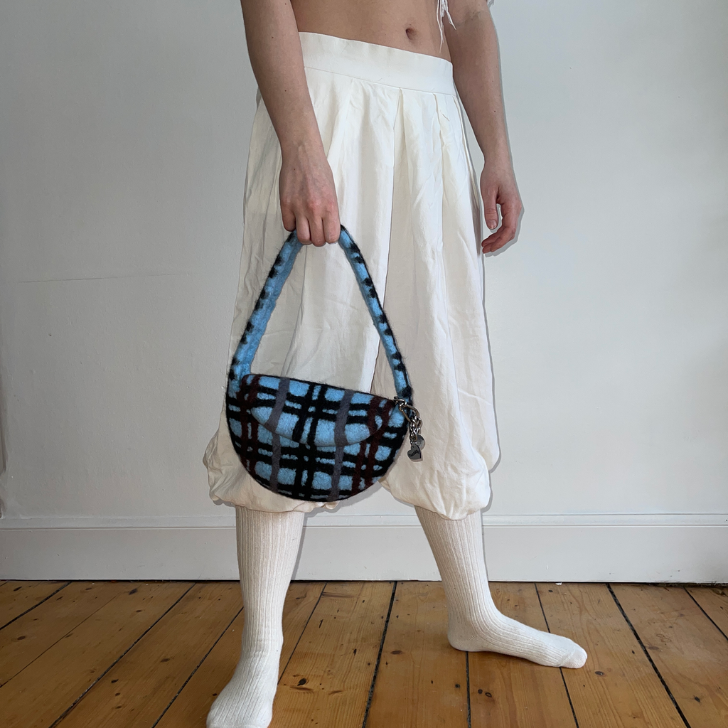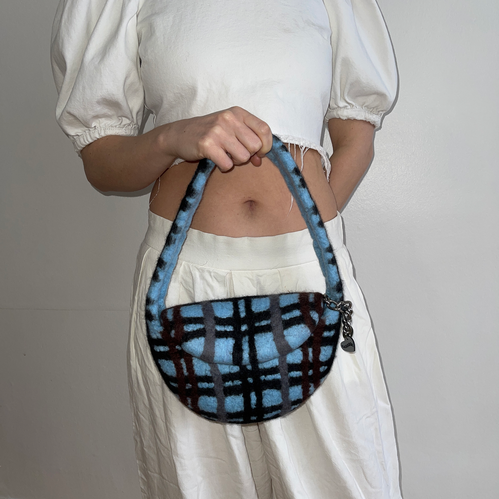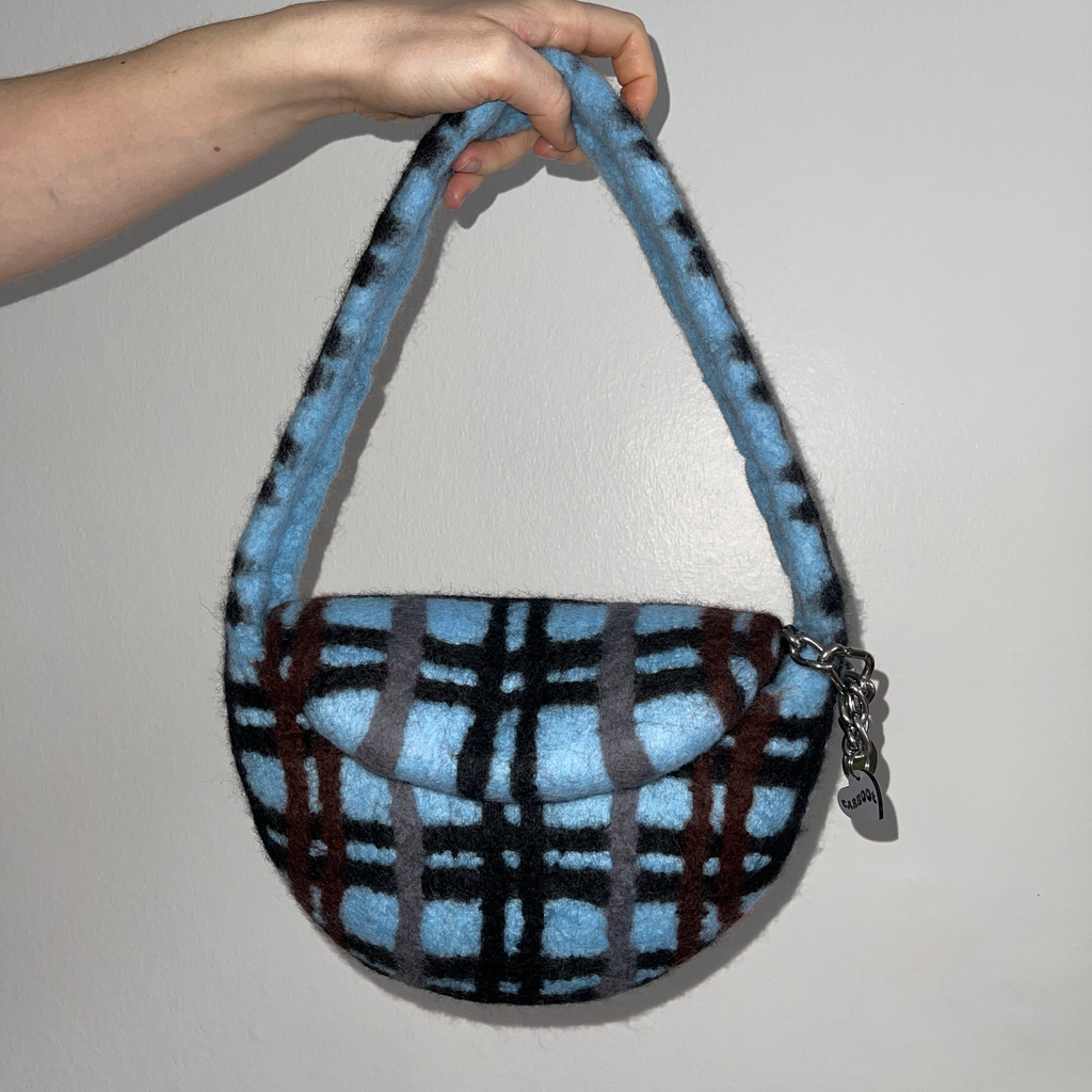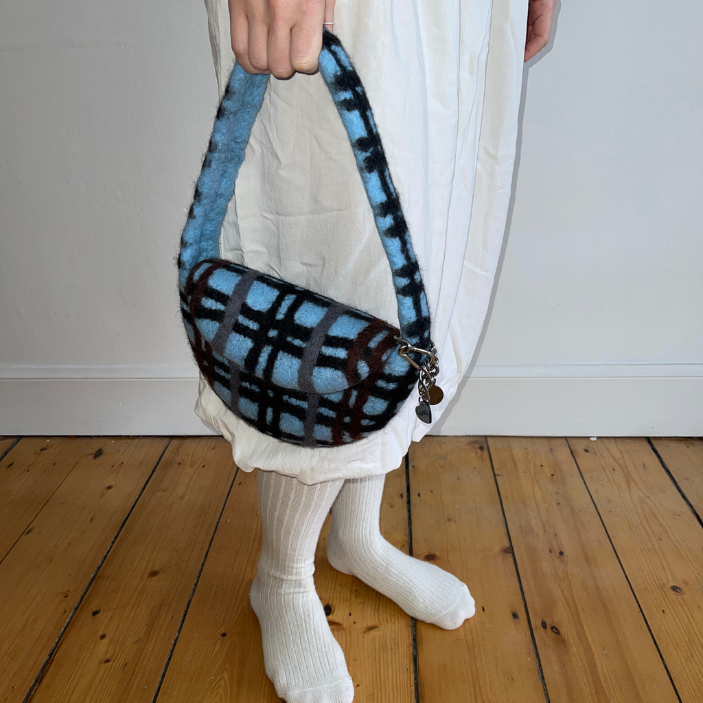 A solid, hand-felted rounded shoulder bag with an integrated plaid pattern. Fastened with a flap closure with a snap fastener. Finished with a stainless steel chain & Carboot charms.