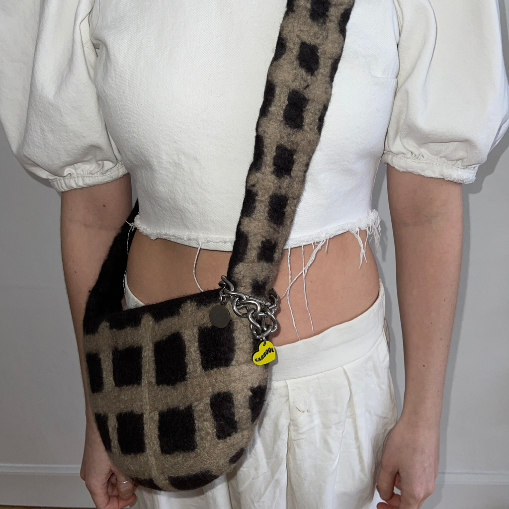 A solid, hand-felted rounded crossbody bag with an integrated plaid pattern. Fastened with a silver Riri zip and finished with a stainless steel chain & Carboot charms.