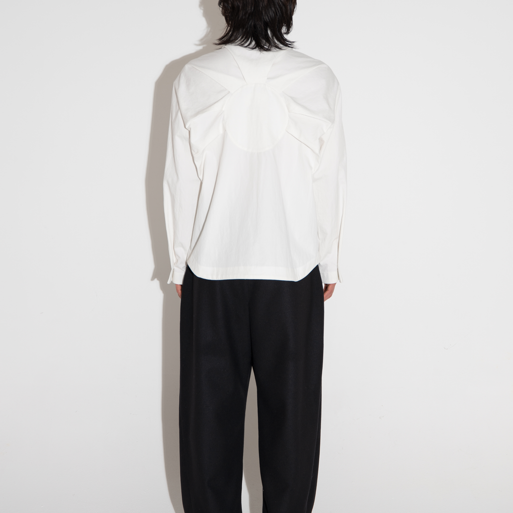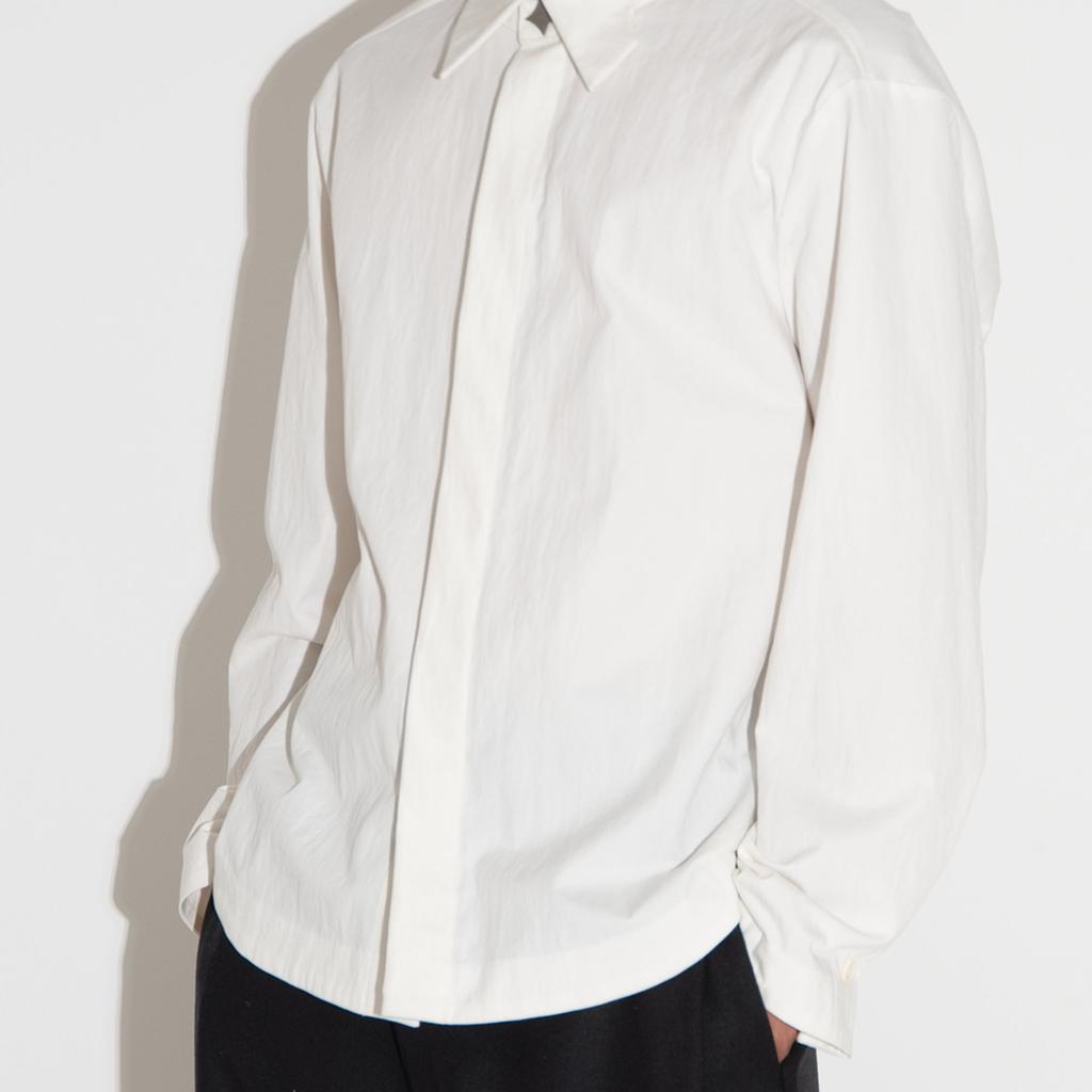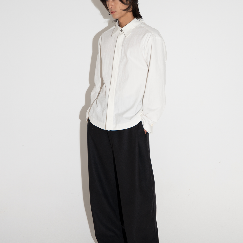 Semicircular collar, plating logo button, pleated cuff, hidden button, and pleated back side.