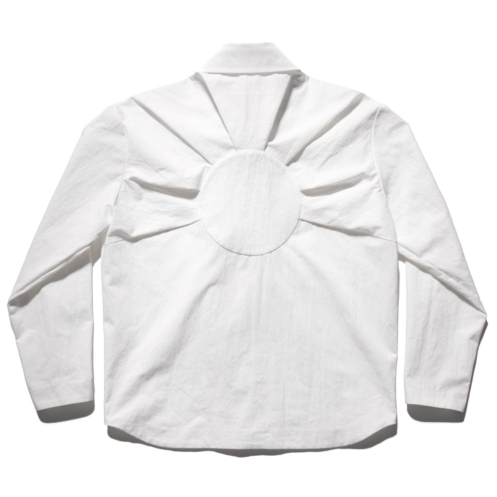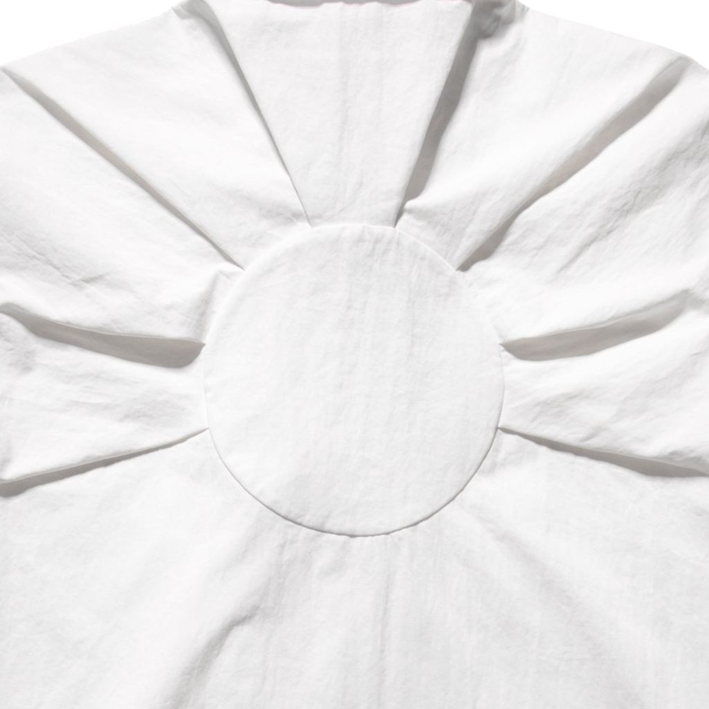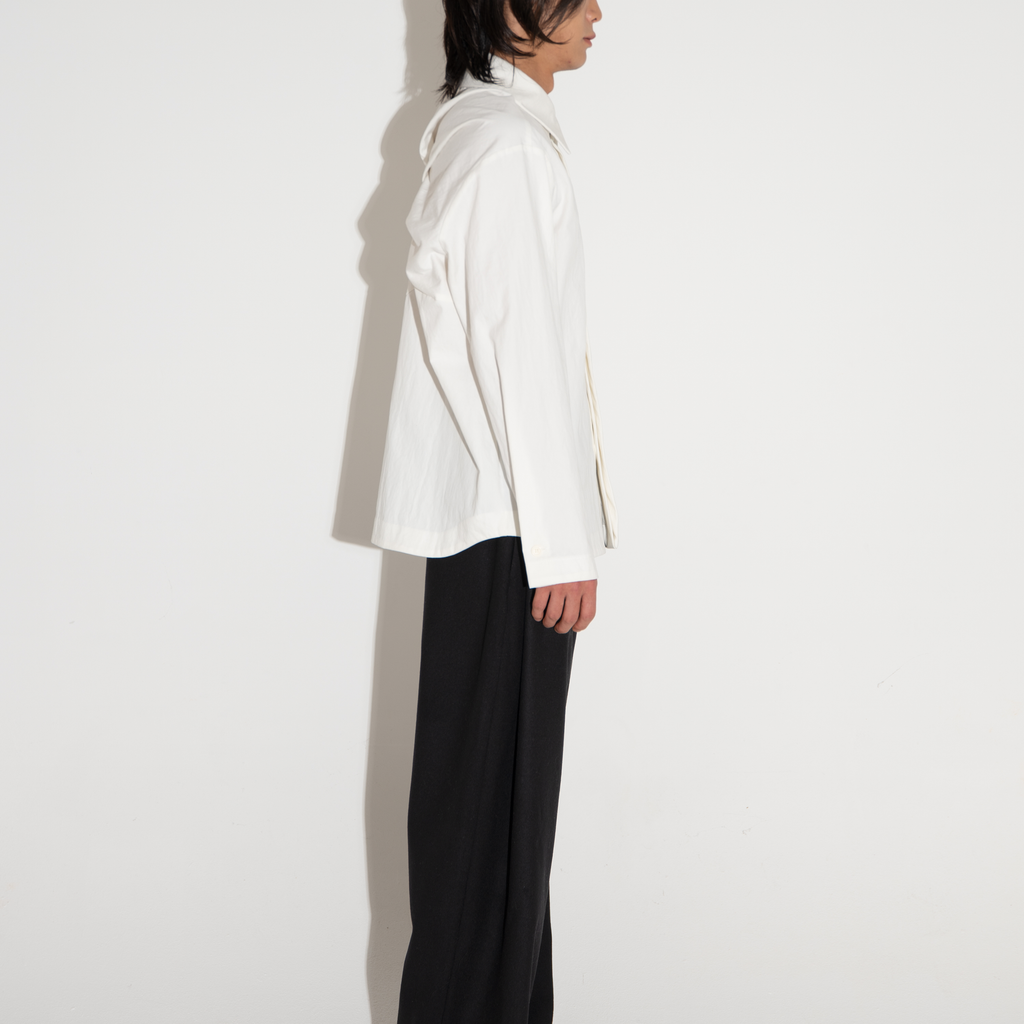 Semicircular collar, plating logo button, pleated cuff, hidden button, and pleated back side.