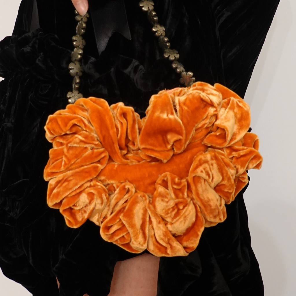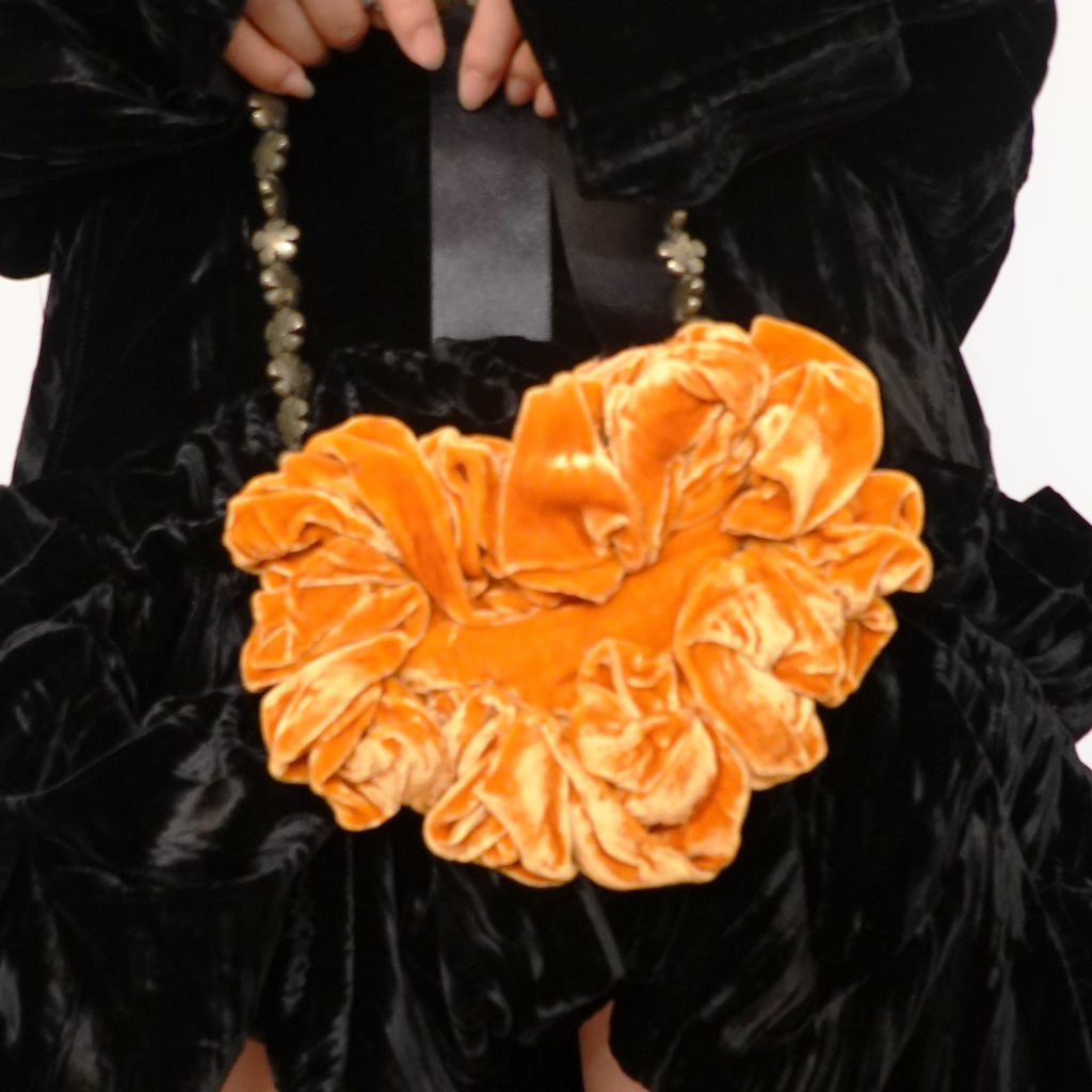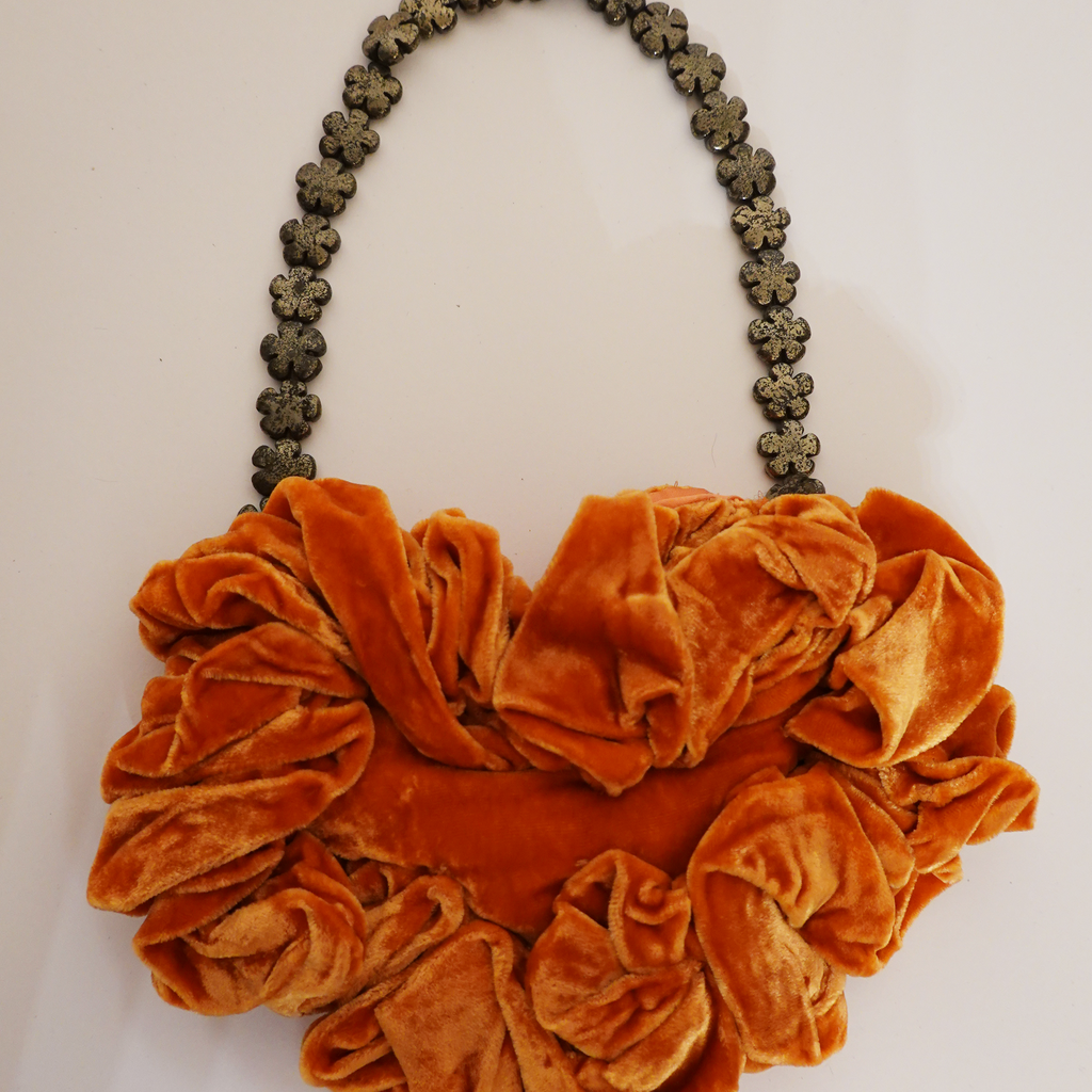 Ruffle handbag, velvet texture with the shape of heart. The chain is made of series of floral metals.Made with66% Polyester, 34% Silk; Lining: 100% Polyester