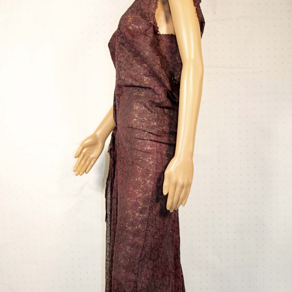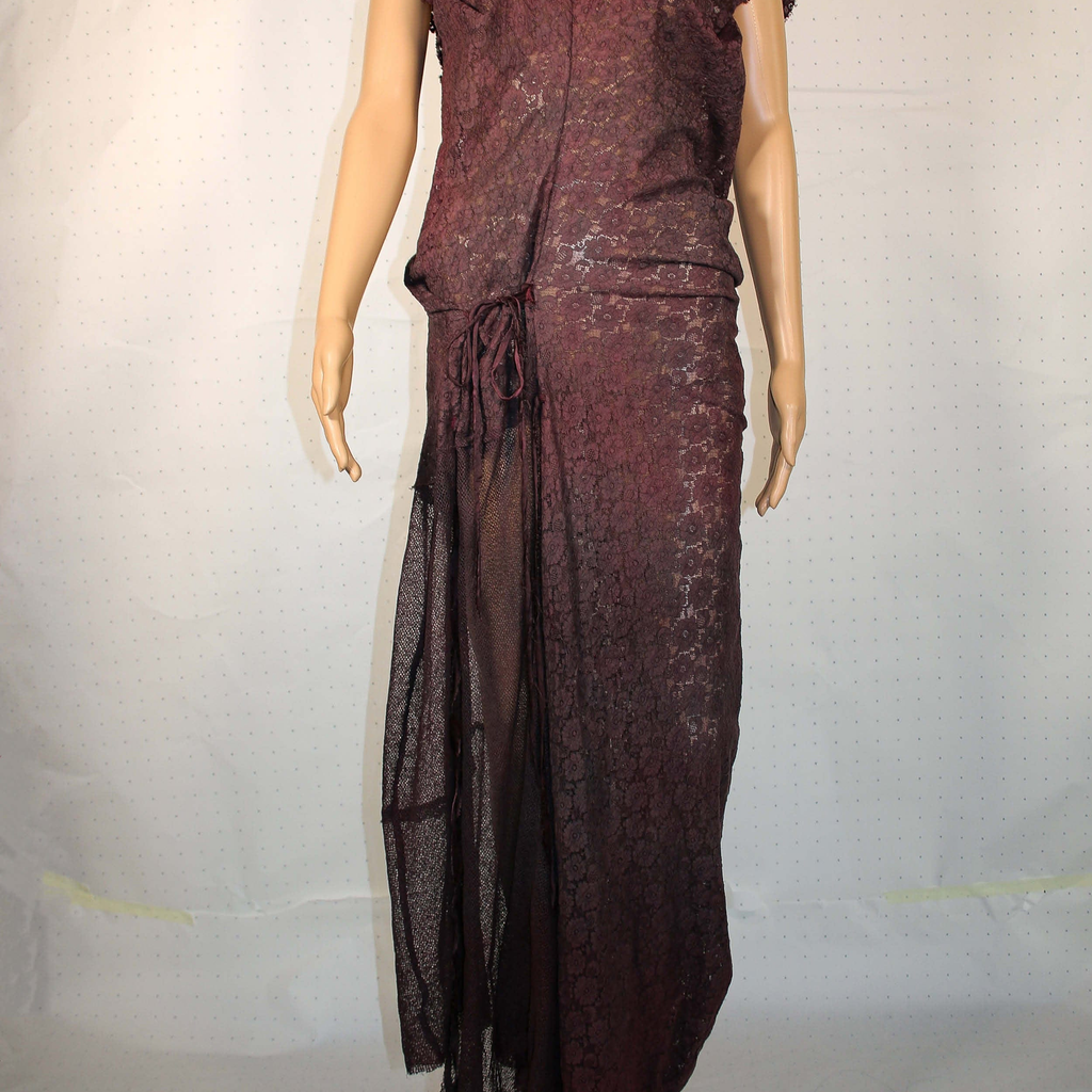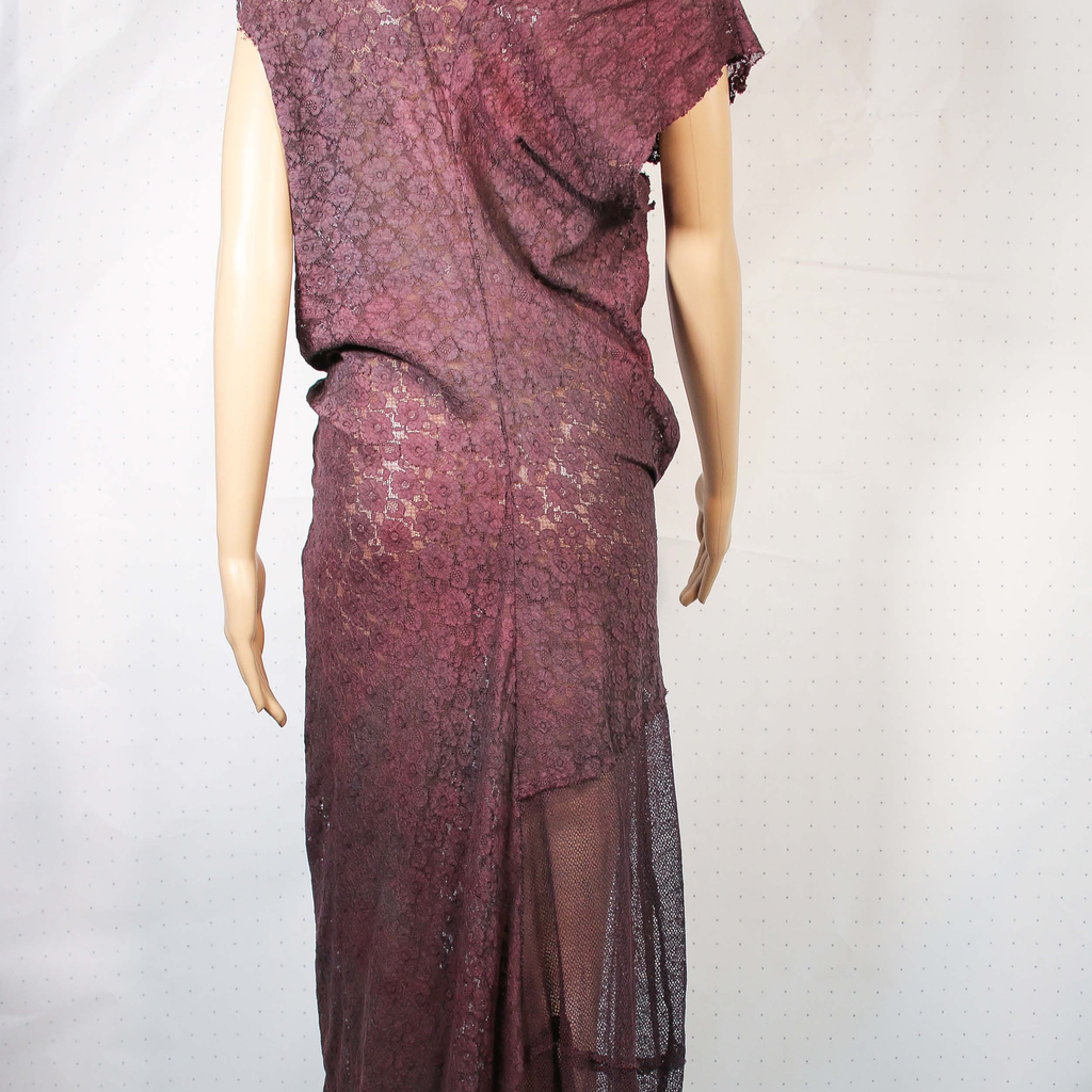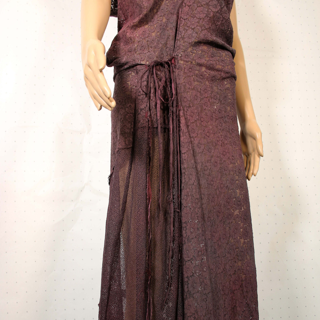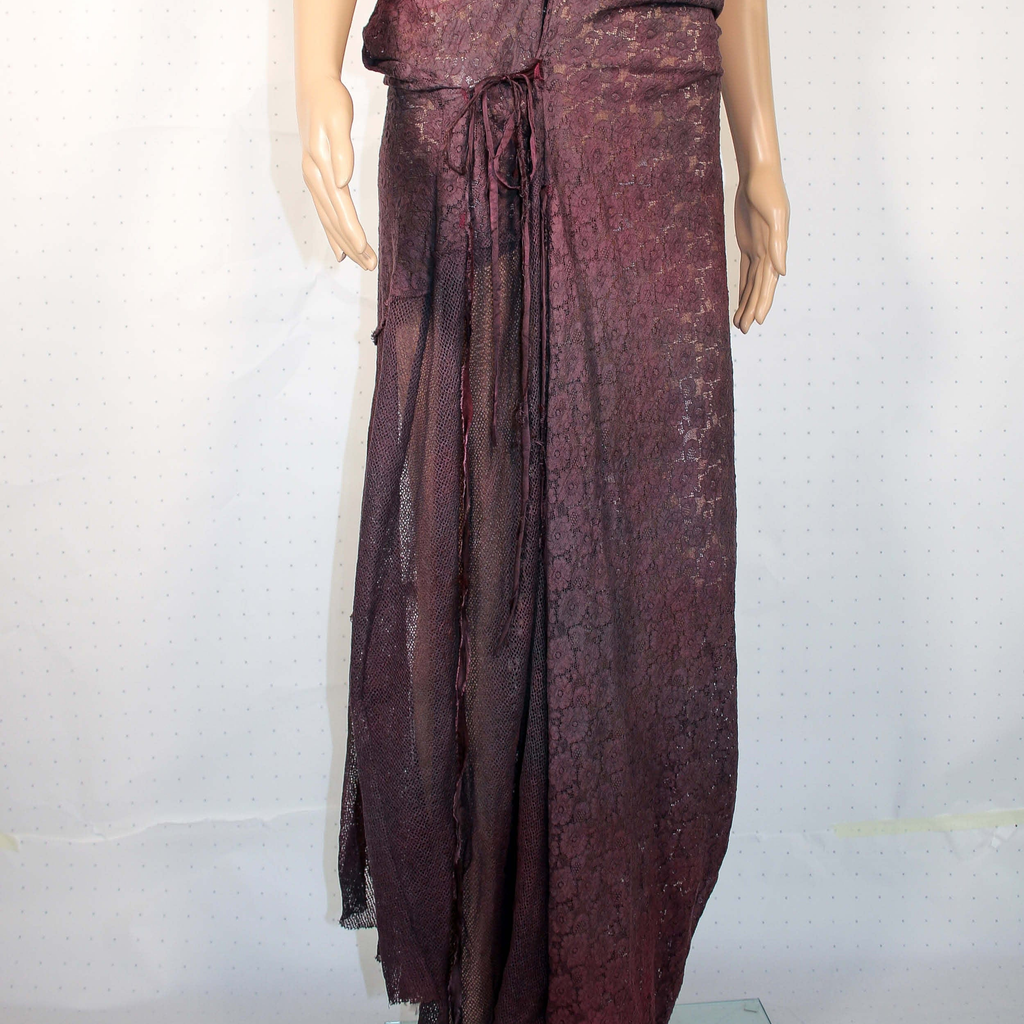 Crafted by AJiltedButtplug, the Cluny Lace Dress features a rich dark purple hue and is constructed from traditional Cluny lace. Each piece is hand-dyed and includes a comfortable hip fastening.