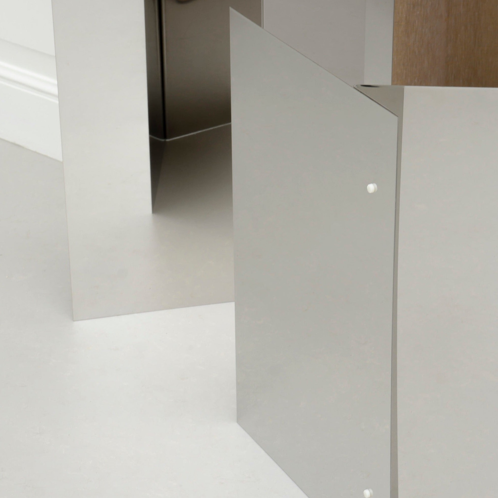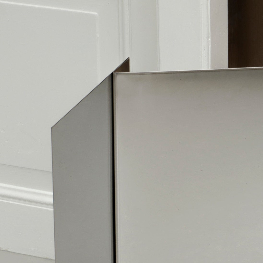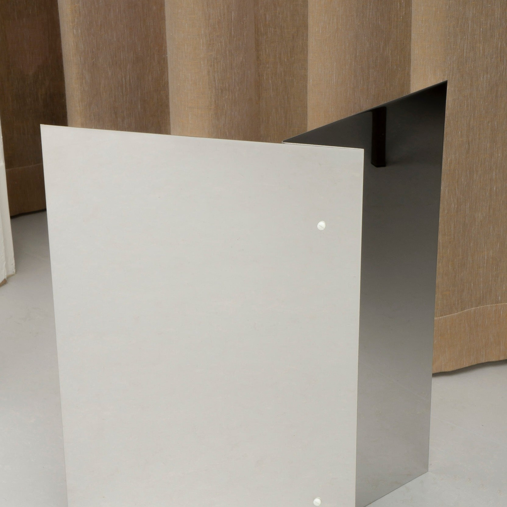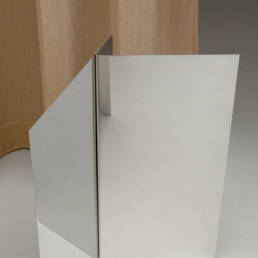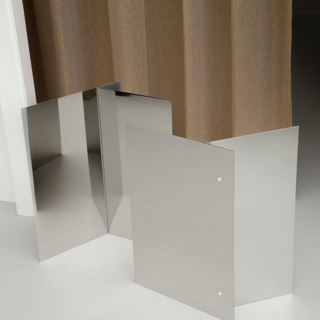 Polished stainless steel turned into a 3-dimensional shape by folding only one plate.