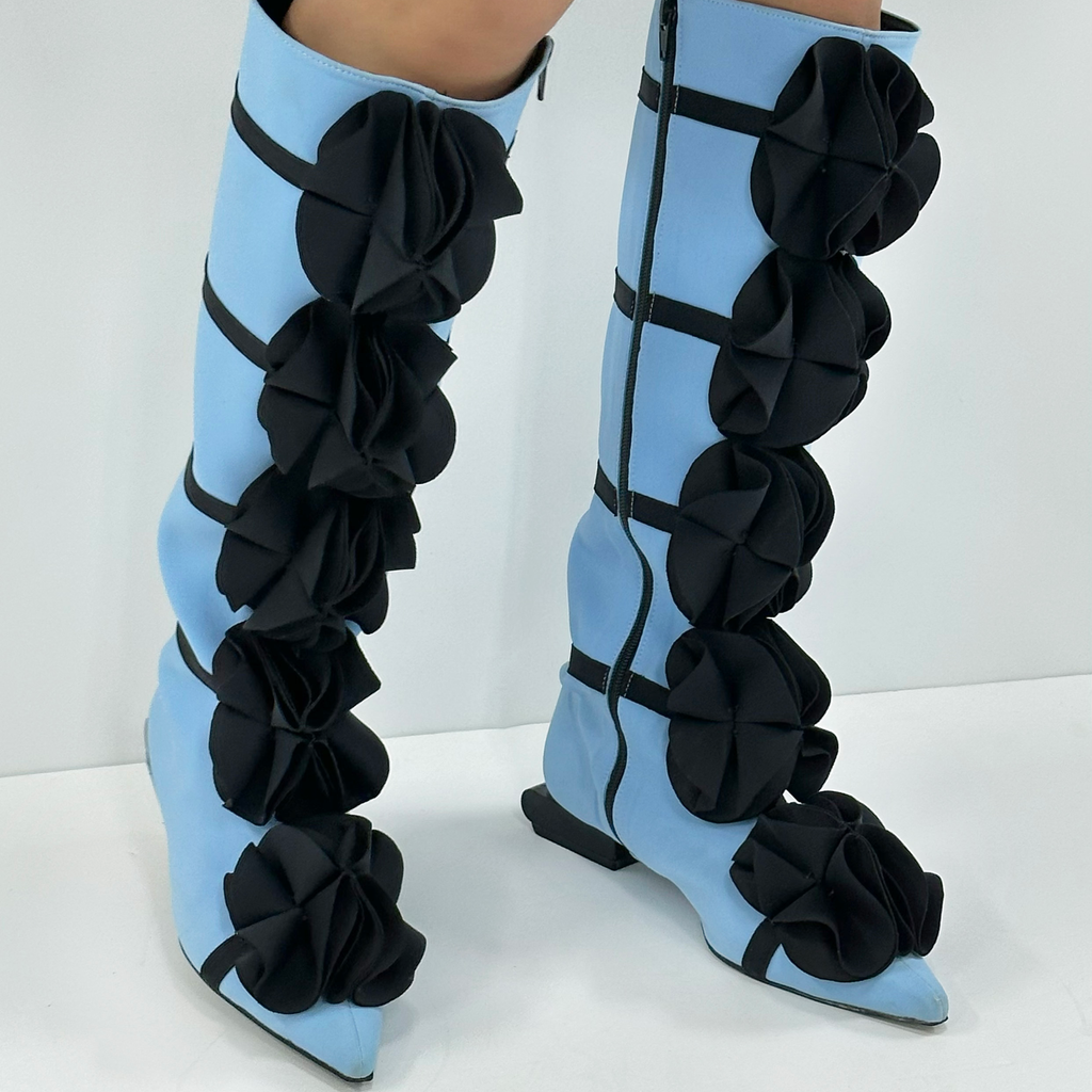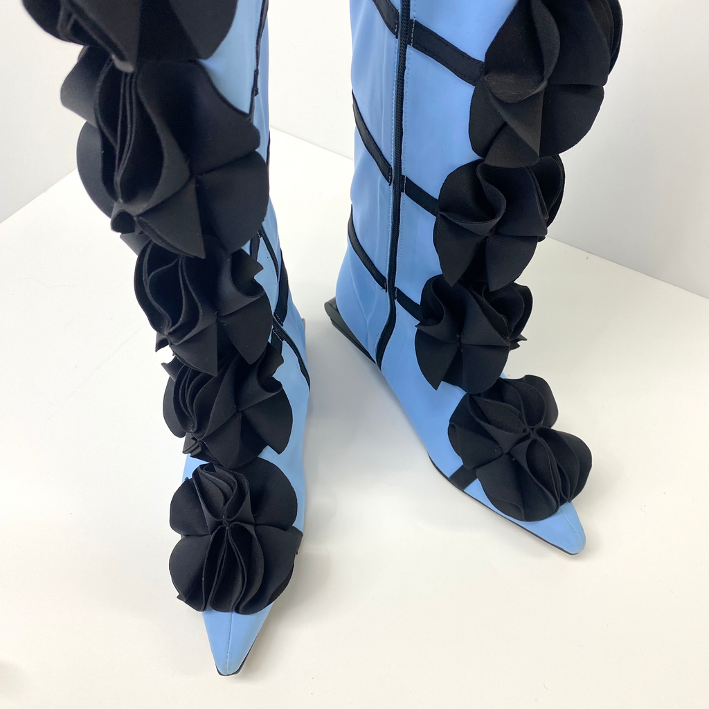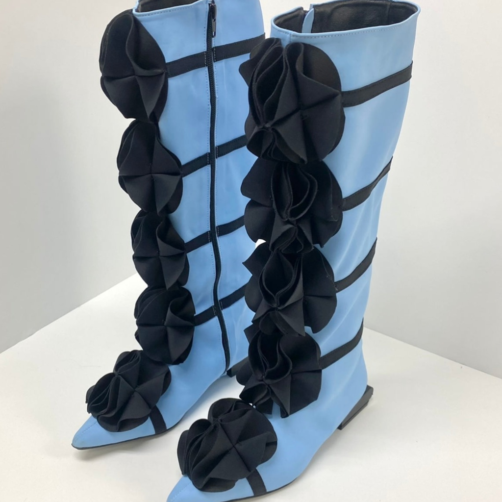 Hand-crafted flower details attached all the way through the centre front. Pointed toe. Leather lining. Rubber sole.