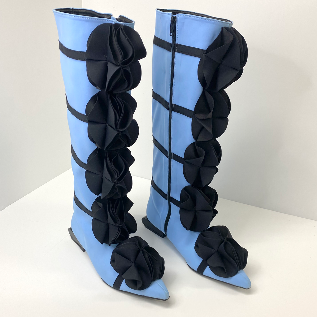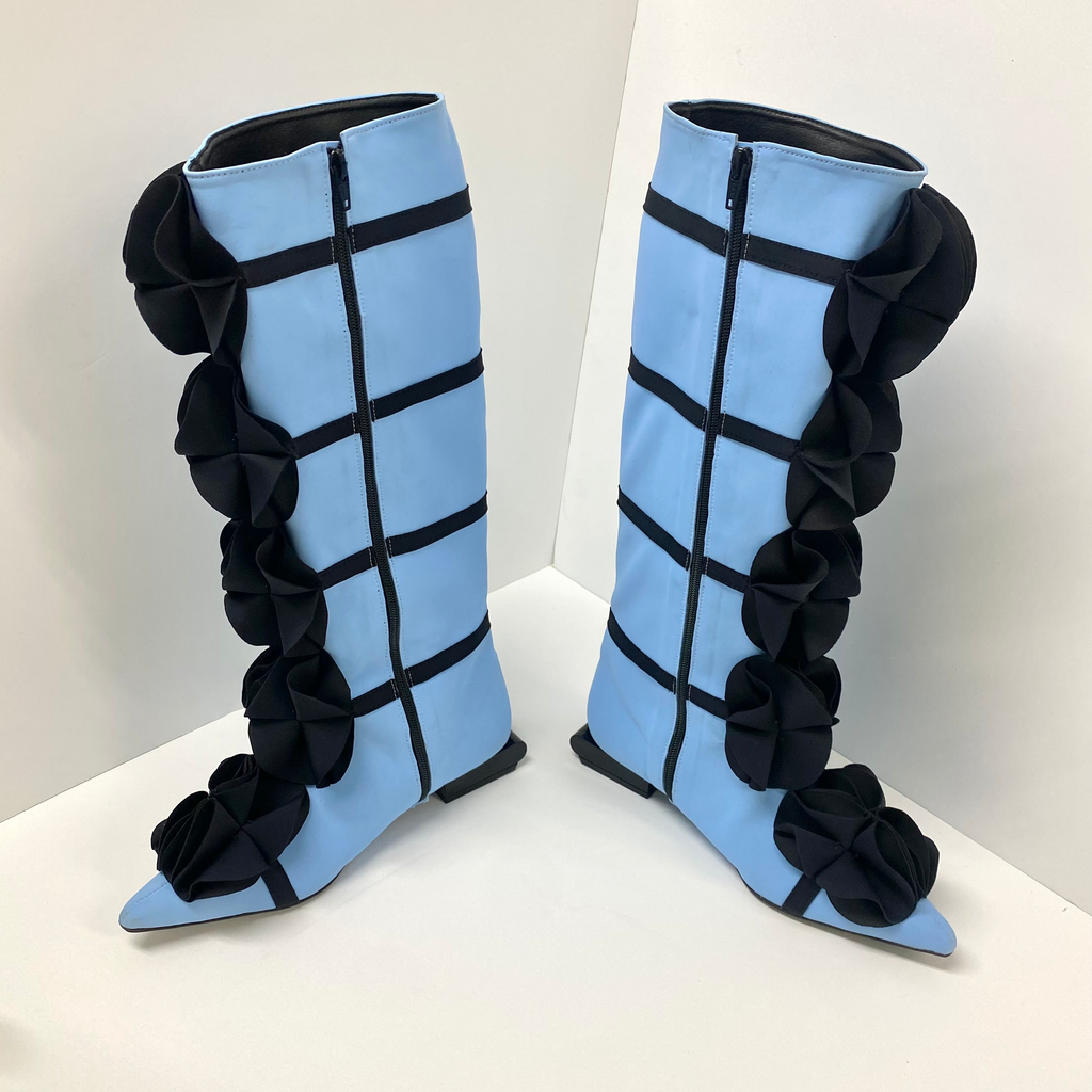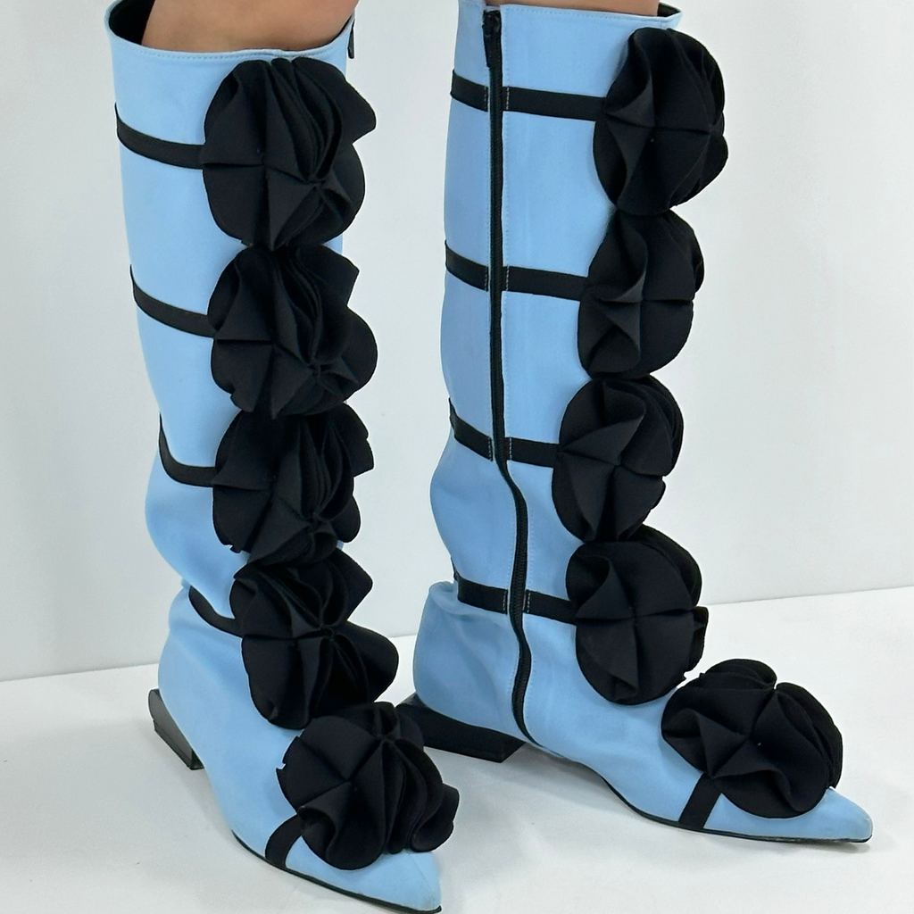 Hand-crafted flower details attached all the way through the centre front. Pointed toe. Leather lining. Rubber sole.