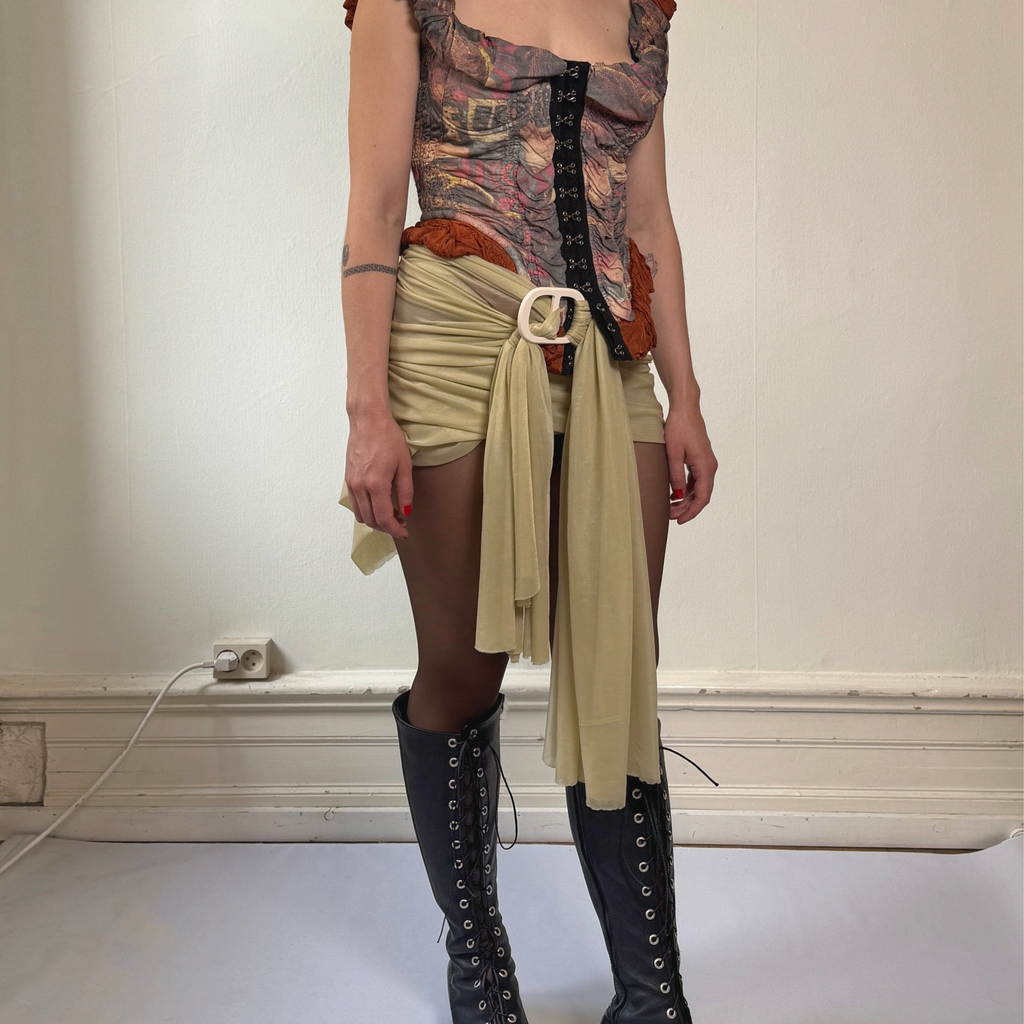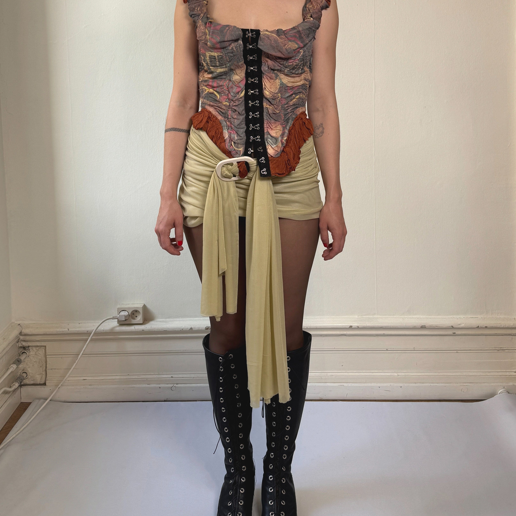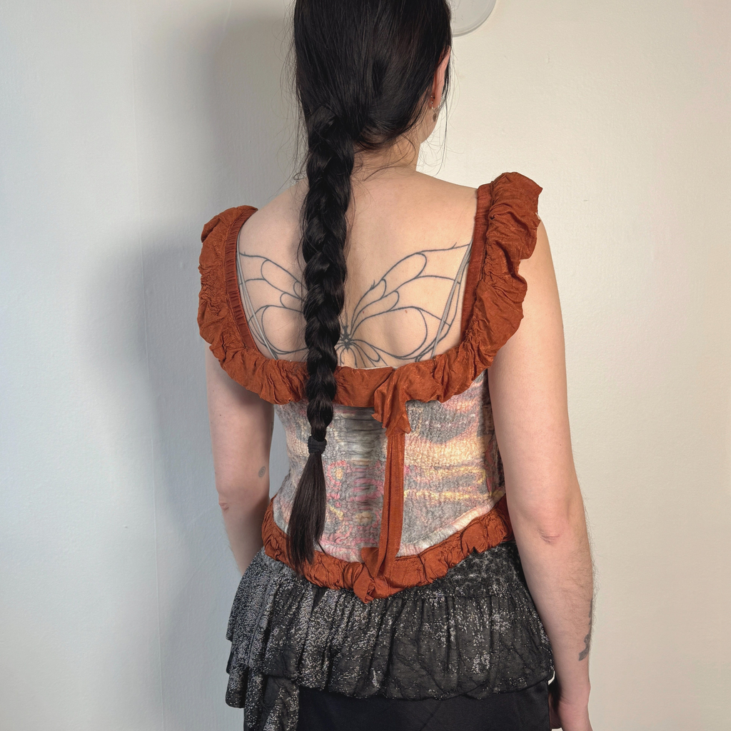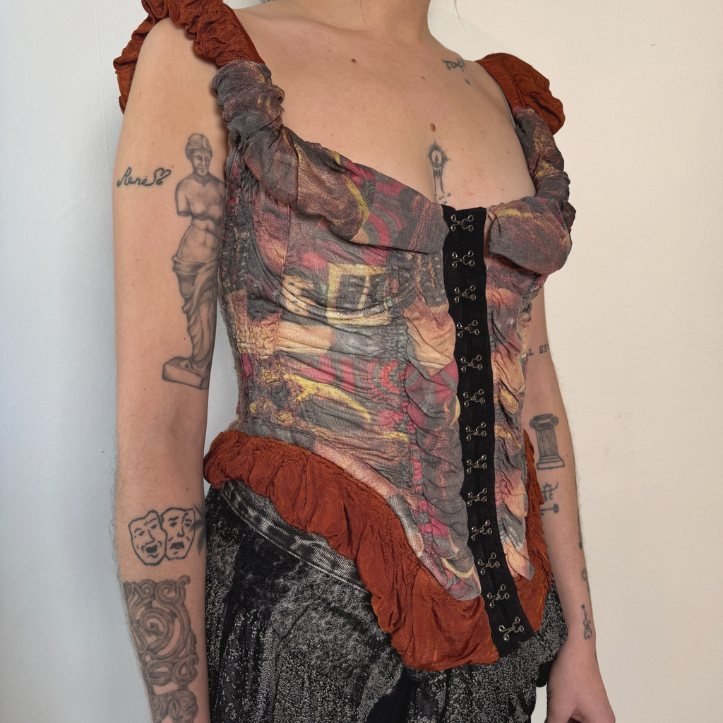 A one-of-a-kind corset top made from digitally printed viscose jersey and shrunken wool. It closes at the front with a full row of metal hook-and-eye fasteners. Handmade in Sweden