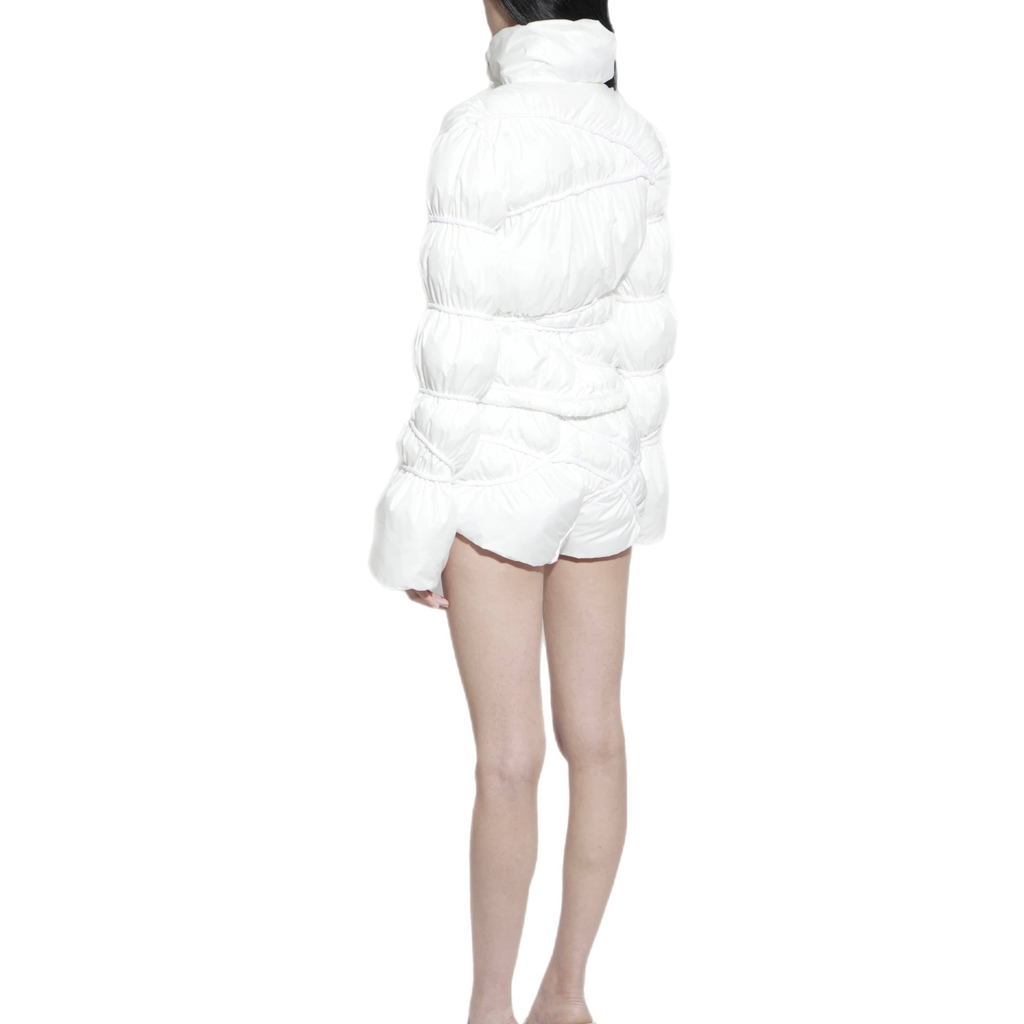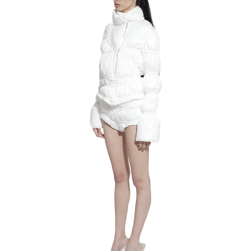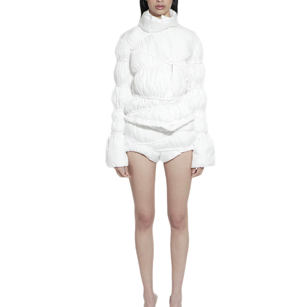 Puffy shorts with ruching and rope detailing throughout, satin lining, invisible zipper side opening.