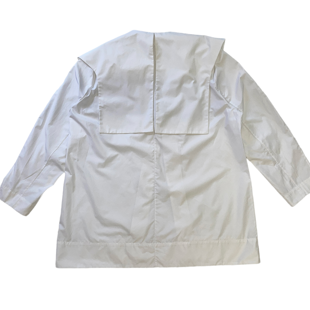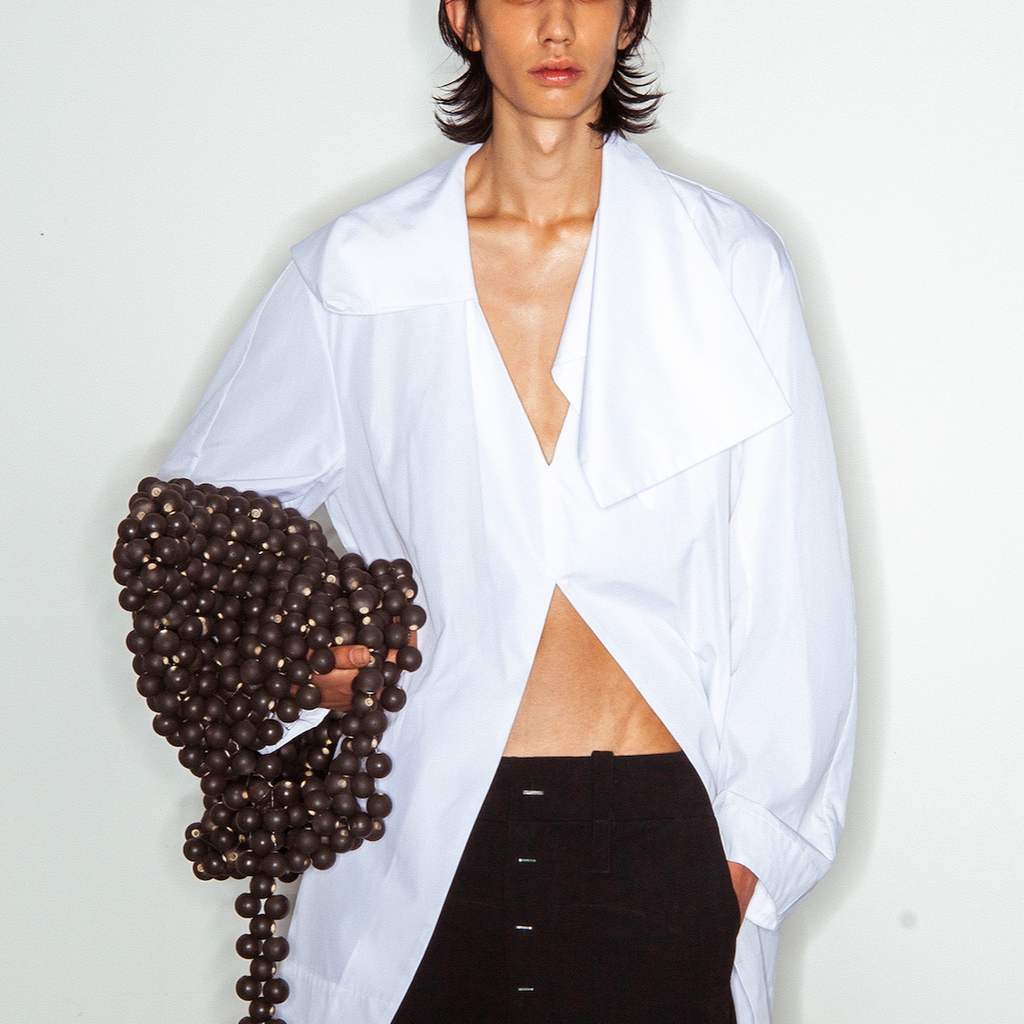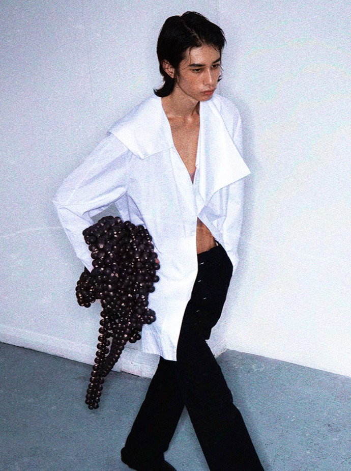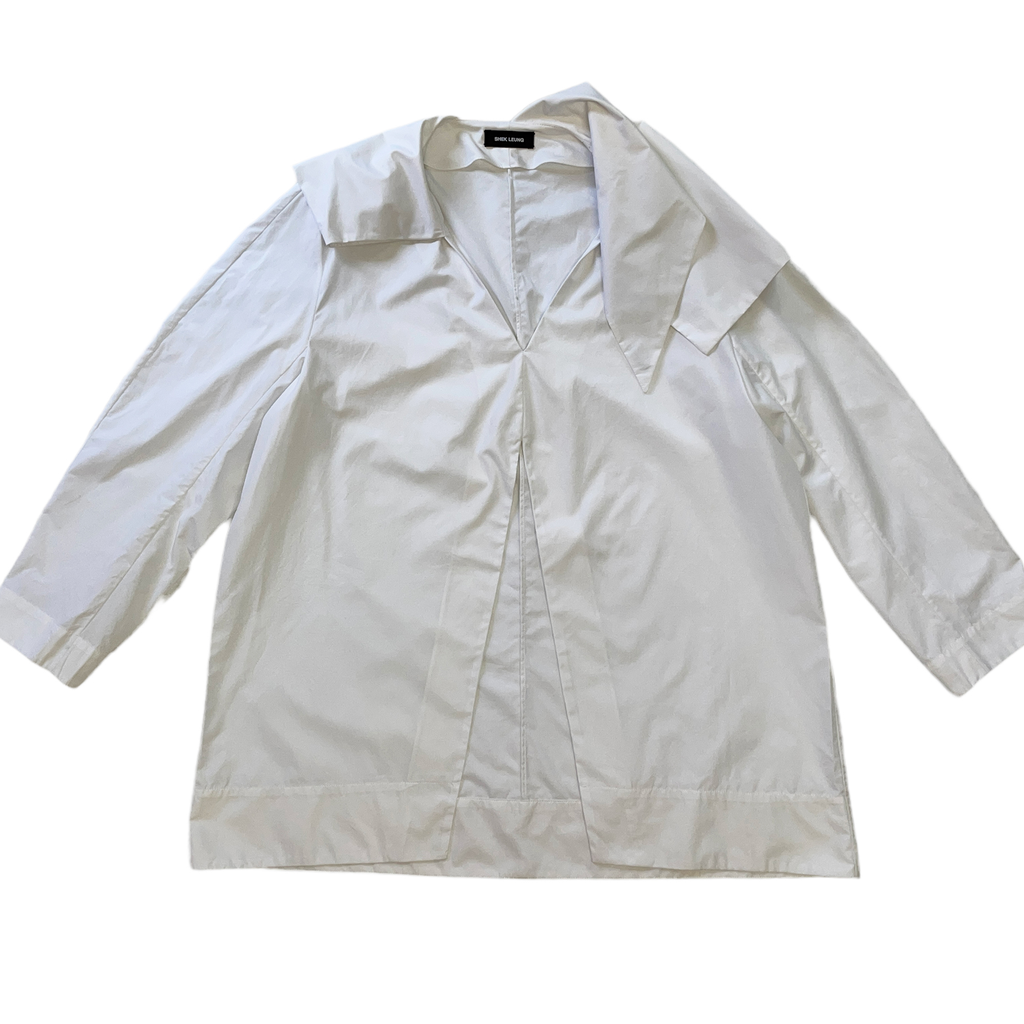 This oversize crisp cotton shirt features X-shaped front design creates a mesmerising V-shaped neckline, subtly exposing a glimpse of your waist for a seductive allure. The wide folded collar adds an alluring touch, as it expands with concealed magnets inside. Pull the yoke over your shoulder, evoking the image of a towel draped sensuously around the neck, reminiscent of a workman’s style.