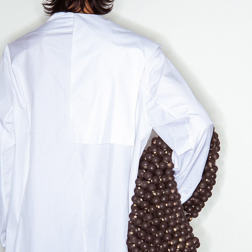 This oversize crisp cotton shirt features X-shaped front design creates a mesmerising V-shaped neckline, subtly exposing a glimpse of your waist for a seductive allure. The wide folded collar adds an alluring touch, as it expands with concealed magnets inside. Pull the yoke over your shoulder, evoking the image of a towel draped sensuously around the neck, reminiscent of a workman’s style. 100% cotton Recommend to dry clean. Machine wash at max 30°C with short spin cycle - delicate.