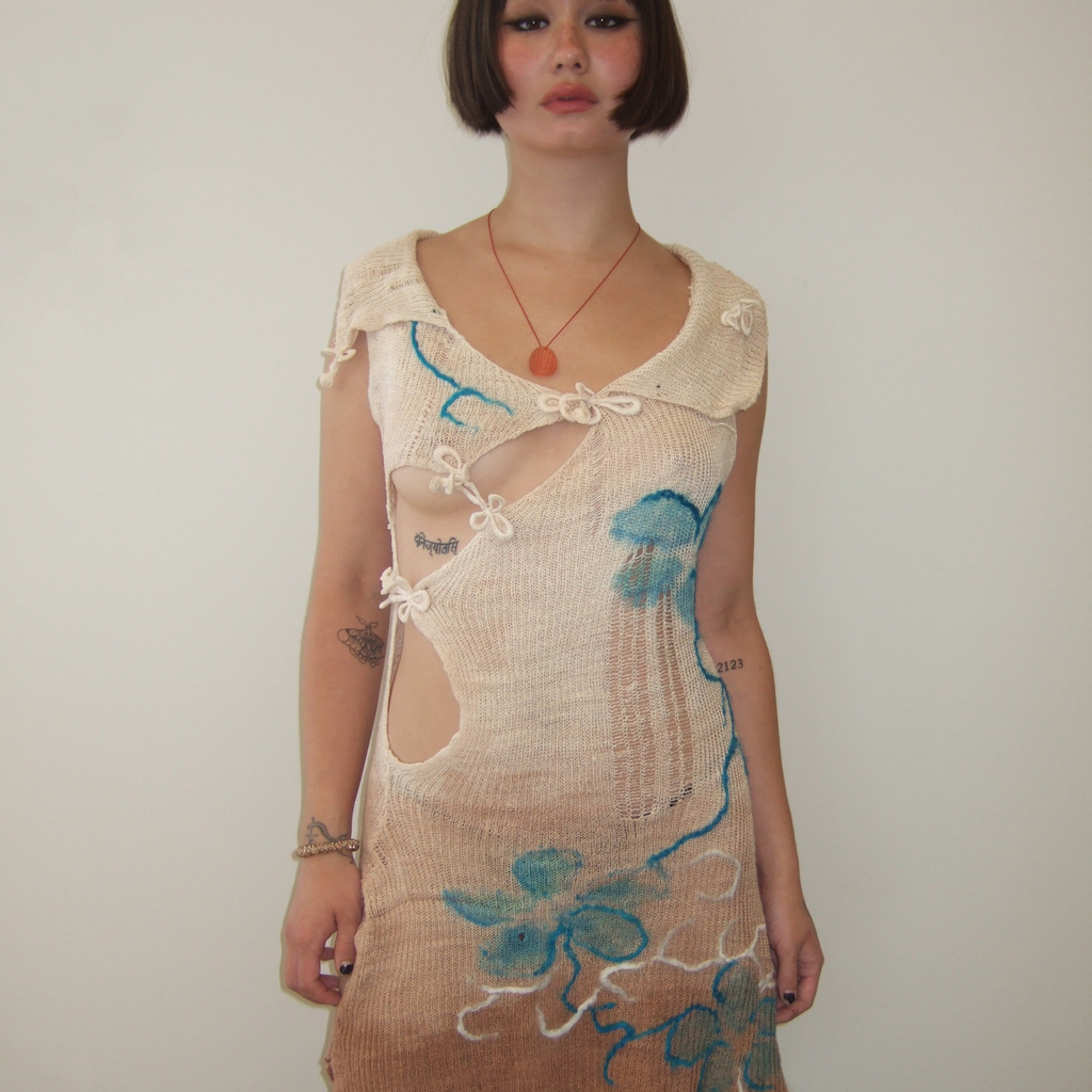 This Qi Pao Dress is hand knit with two strands of artisanal handspun 50/50 cotton silk from Japan.