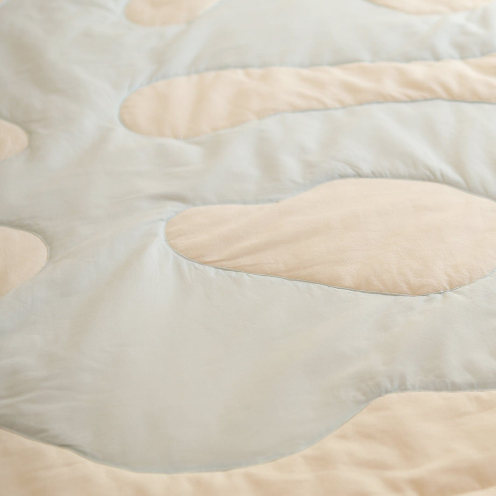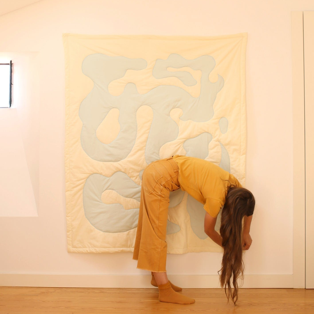 Handmade off white and pale blue soft wall piece or bedspread by Claire Duport.