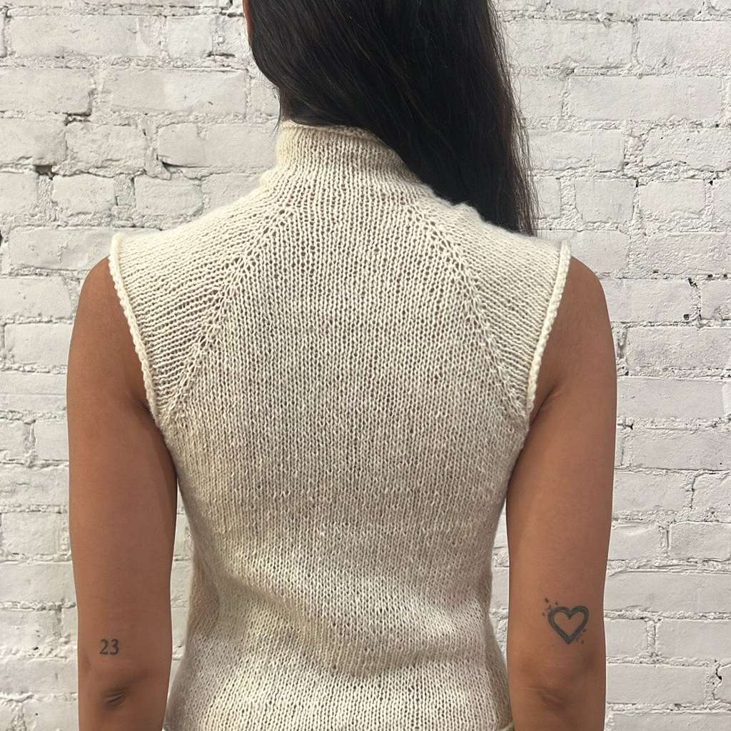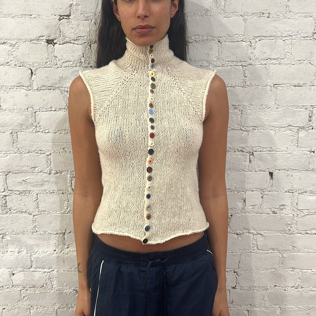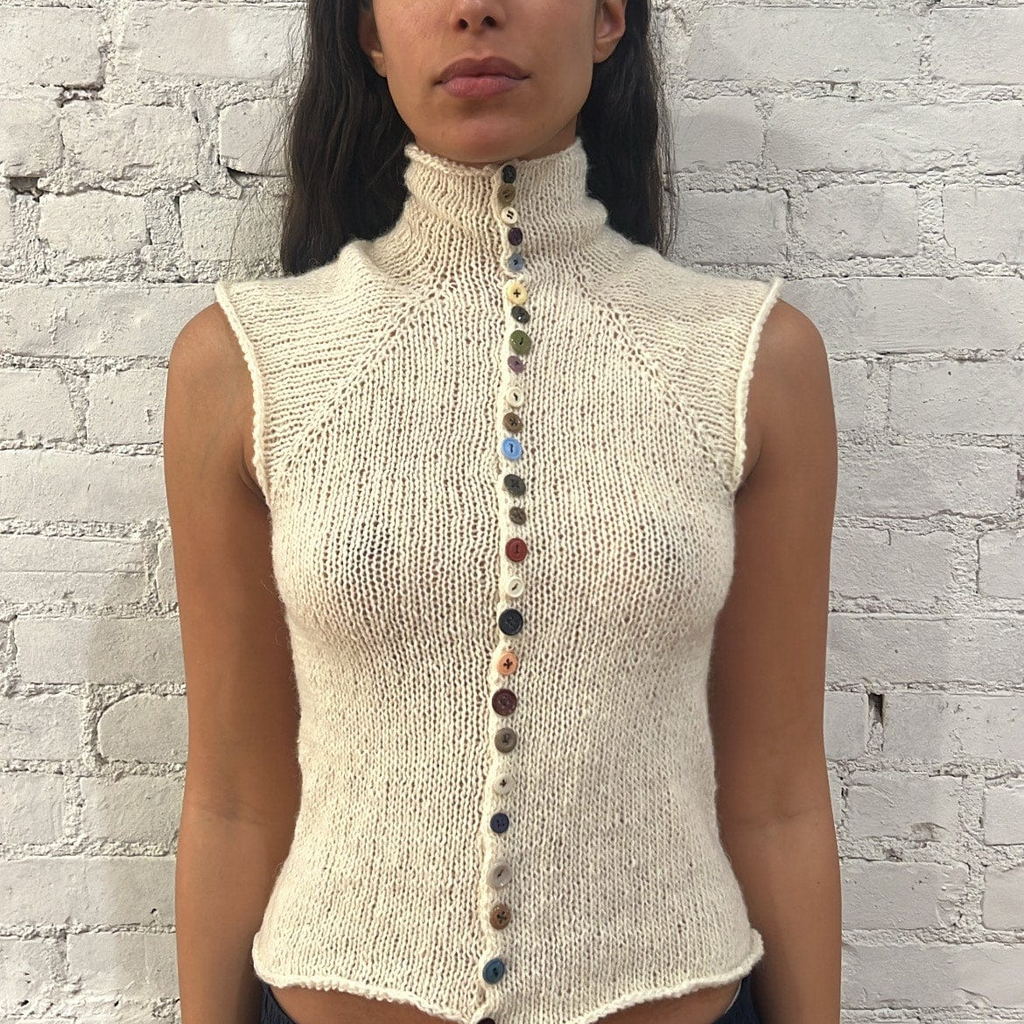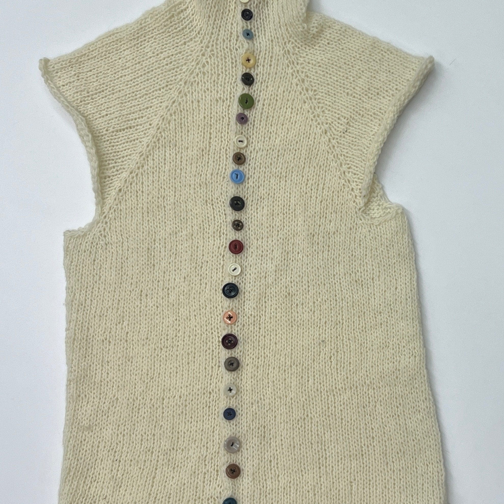 Hand-knit with natural wool, with 26 vintage sourced functional buttons.