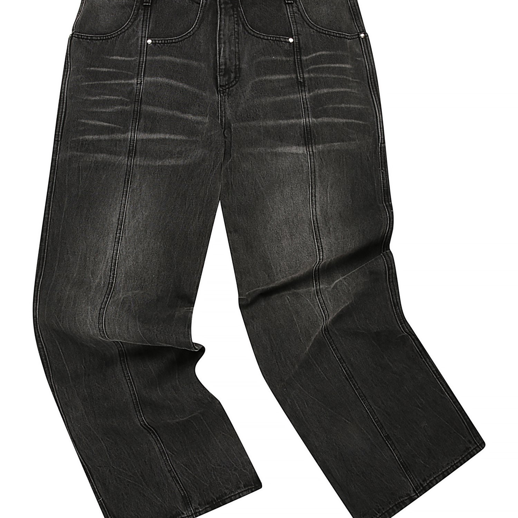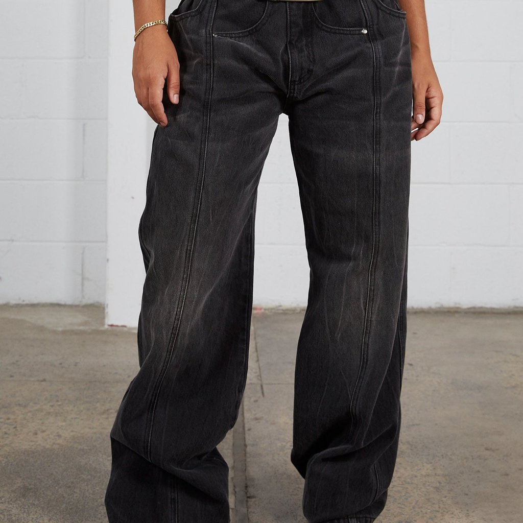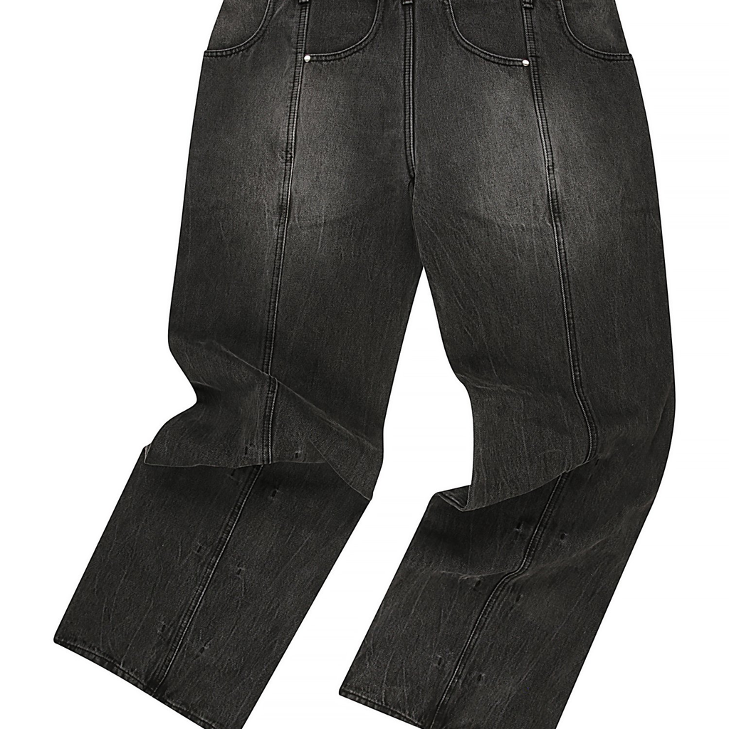 Our Ramp Tramp jeans have 8 pockets with a scalloped effect and a straight loose fit. They have adjustable long hems, centre seams, and a vintage wash on charcoal denim.