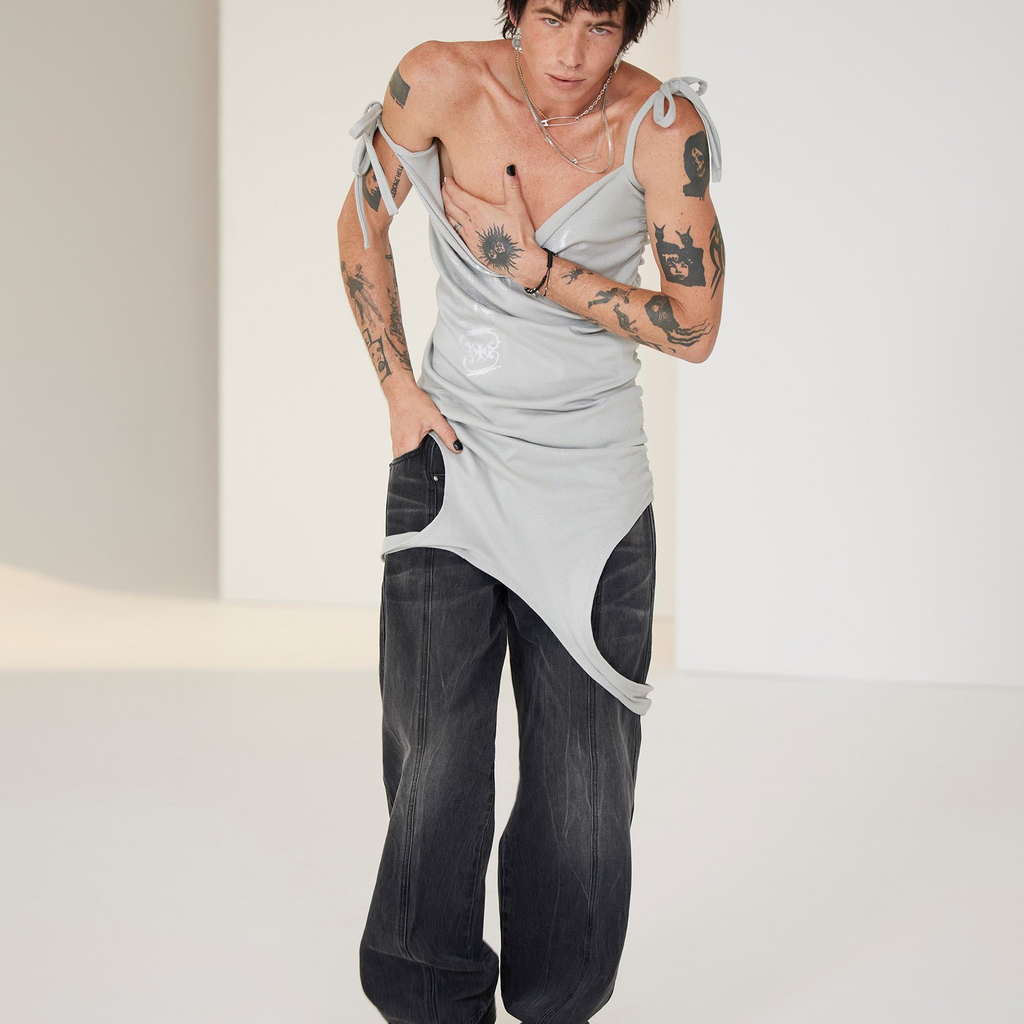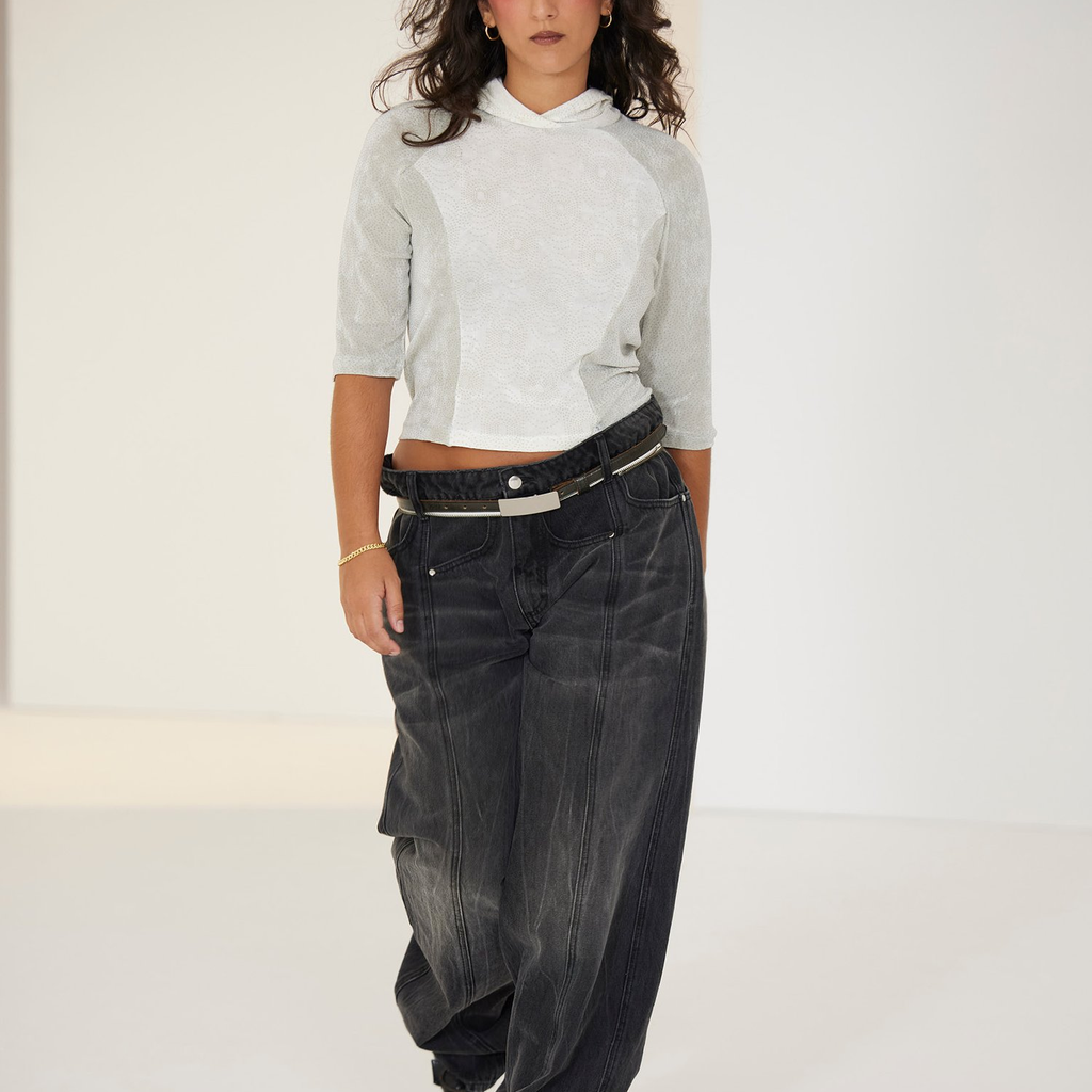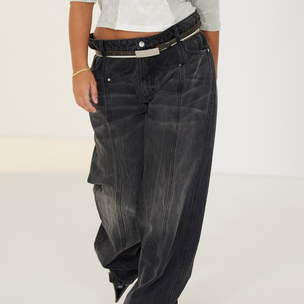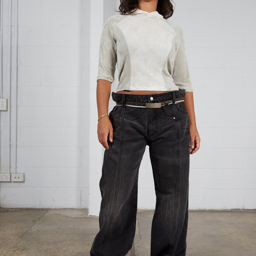 Our Ramp Tramp jeans have 8 pockets with a scalloped effect and a straight loose fit. They have adjustable long hems, centre seams, and a vintage wash on charcoal denim.