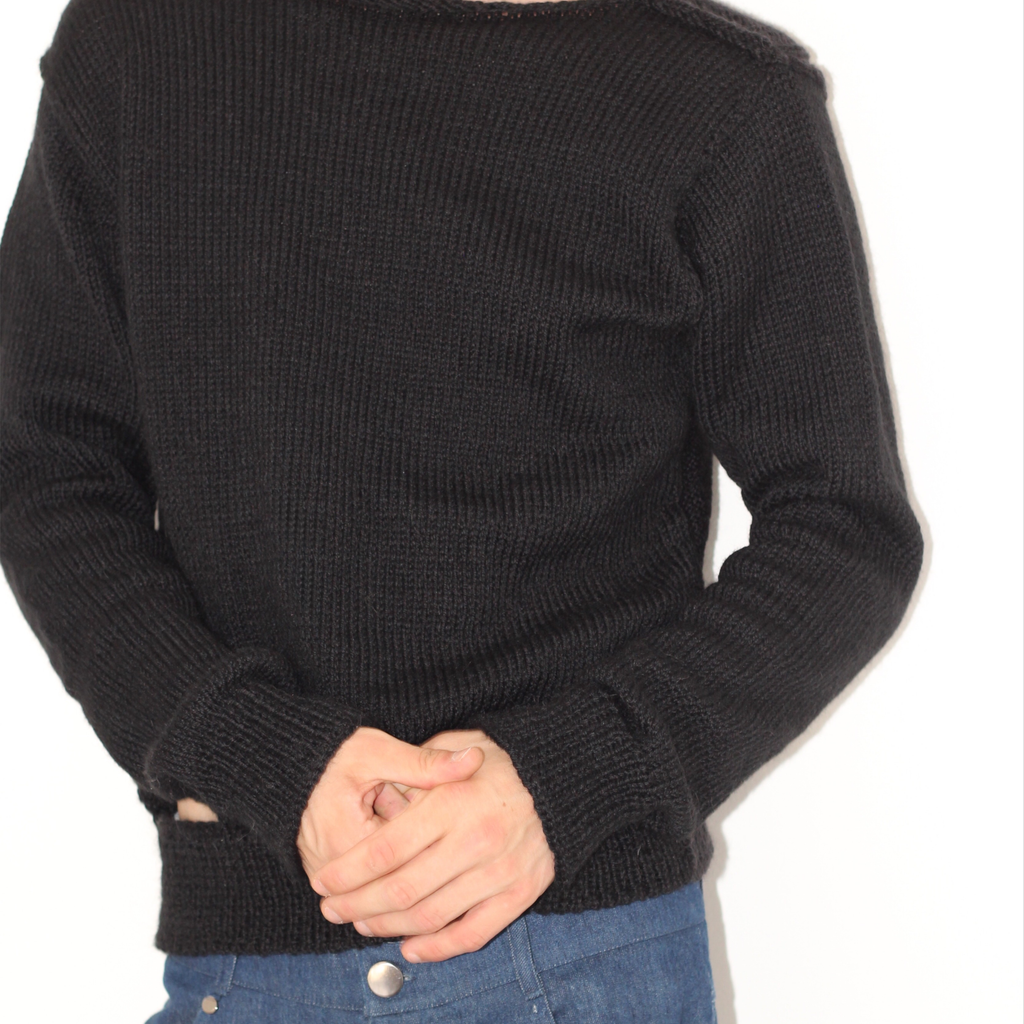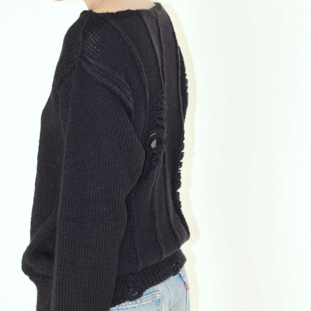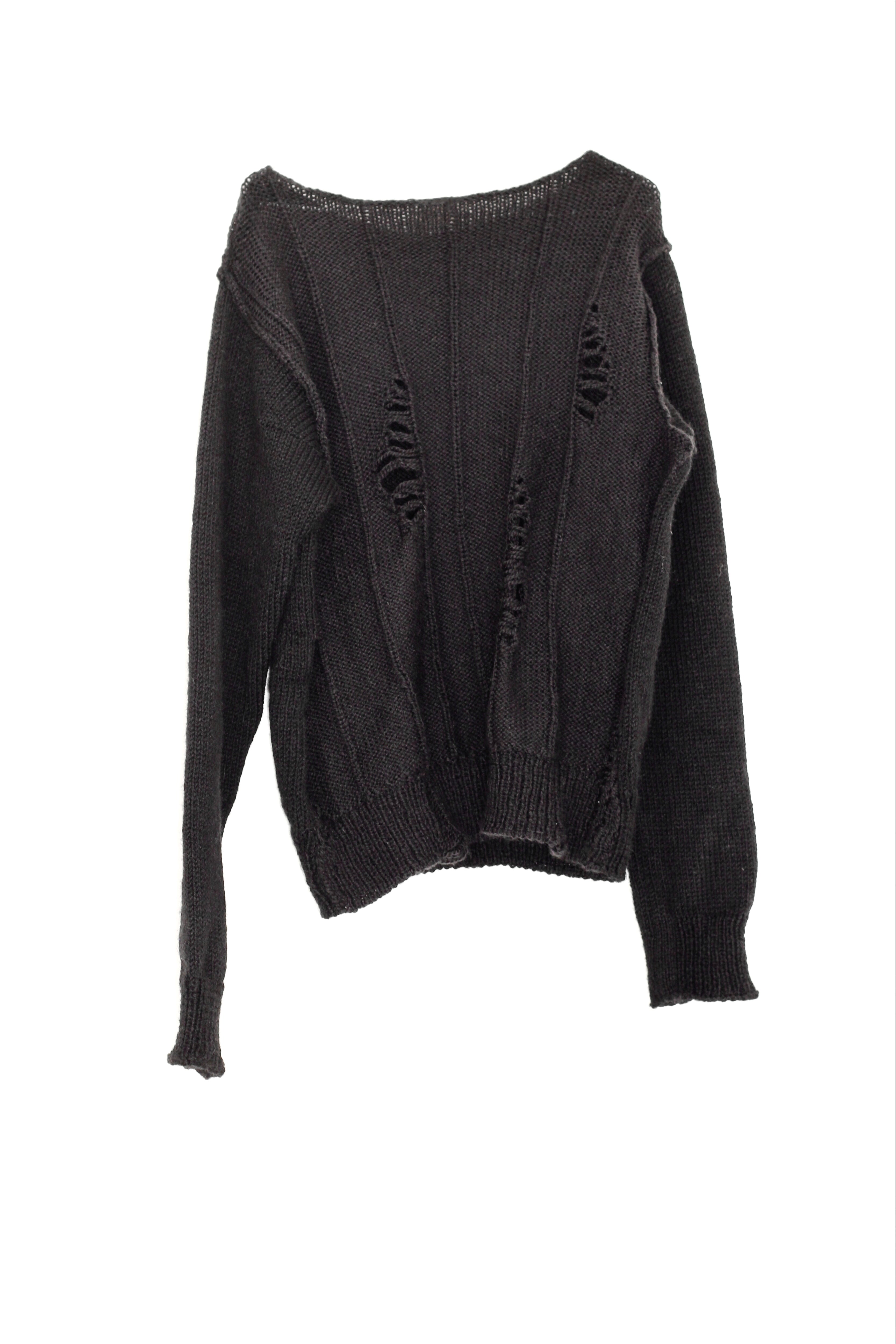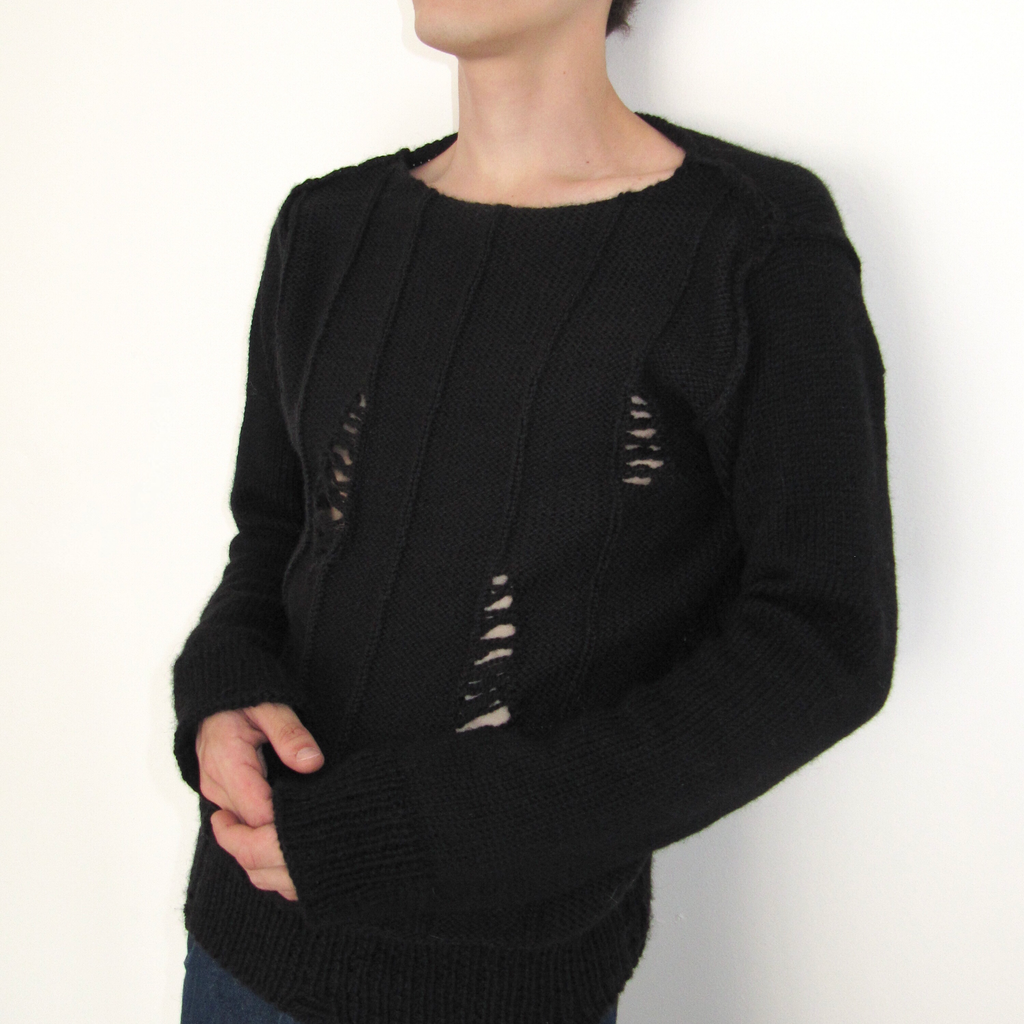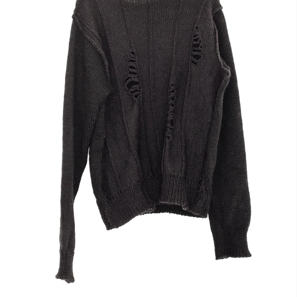 Unisex sweater crafted in a classic silhouette with a deep neckline. Featuring exposed seams and distressed detailing, all hand-finished for a unique, artisanal touch. Warm and cozy.Sweater has different sides that you can change depending on your mood. The traditional cut adds structure and sophistication, while the aged knit elements introduce a grunge-inspired edge.