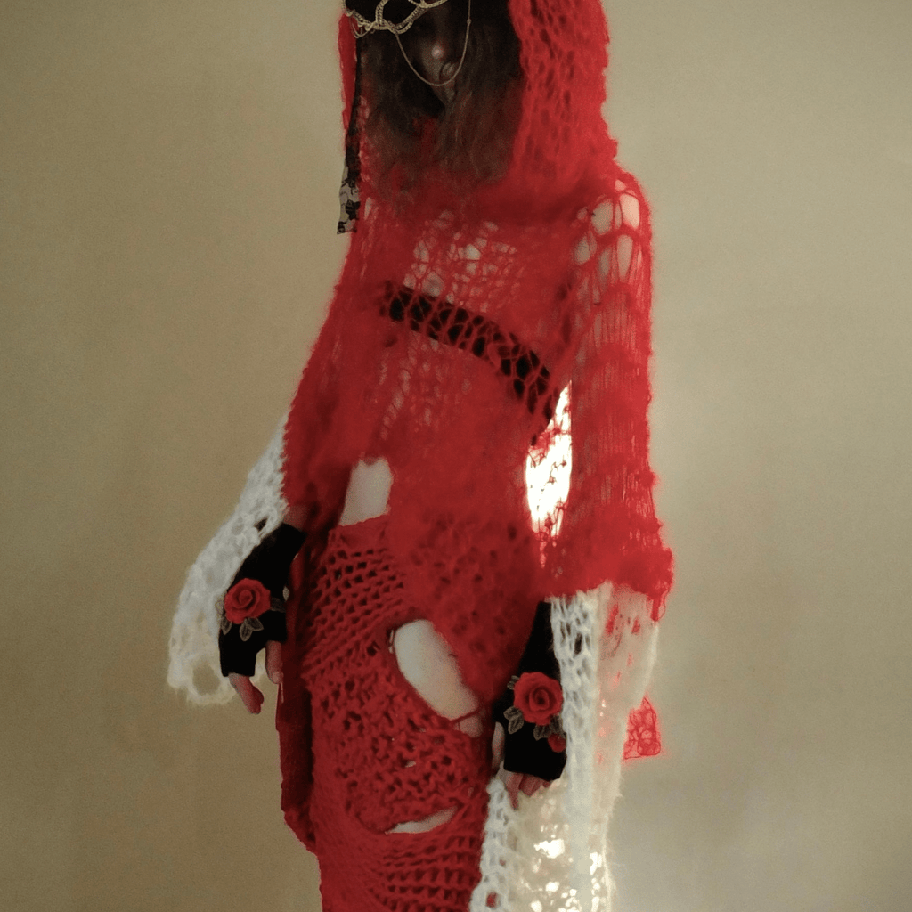 Hand-knitted contrast hooded top made of two types of wool and merino yarn.