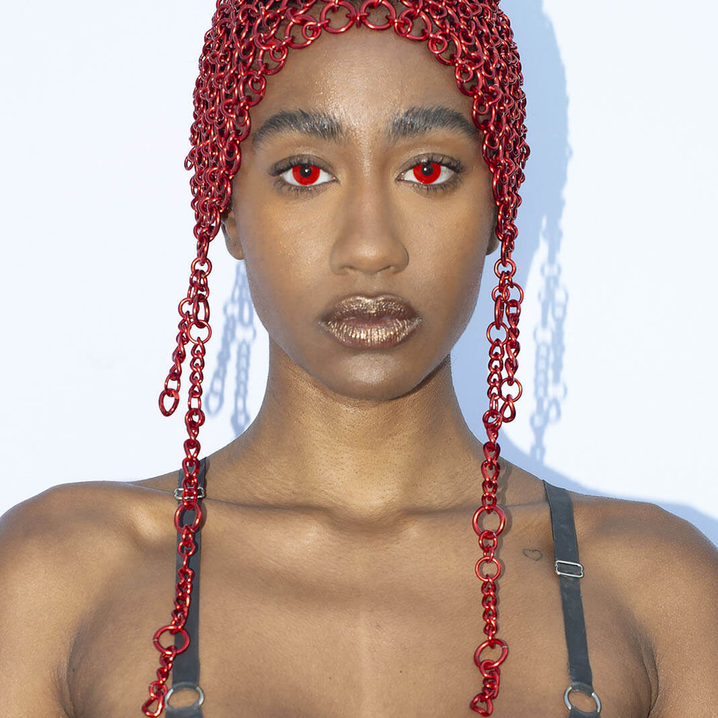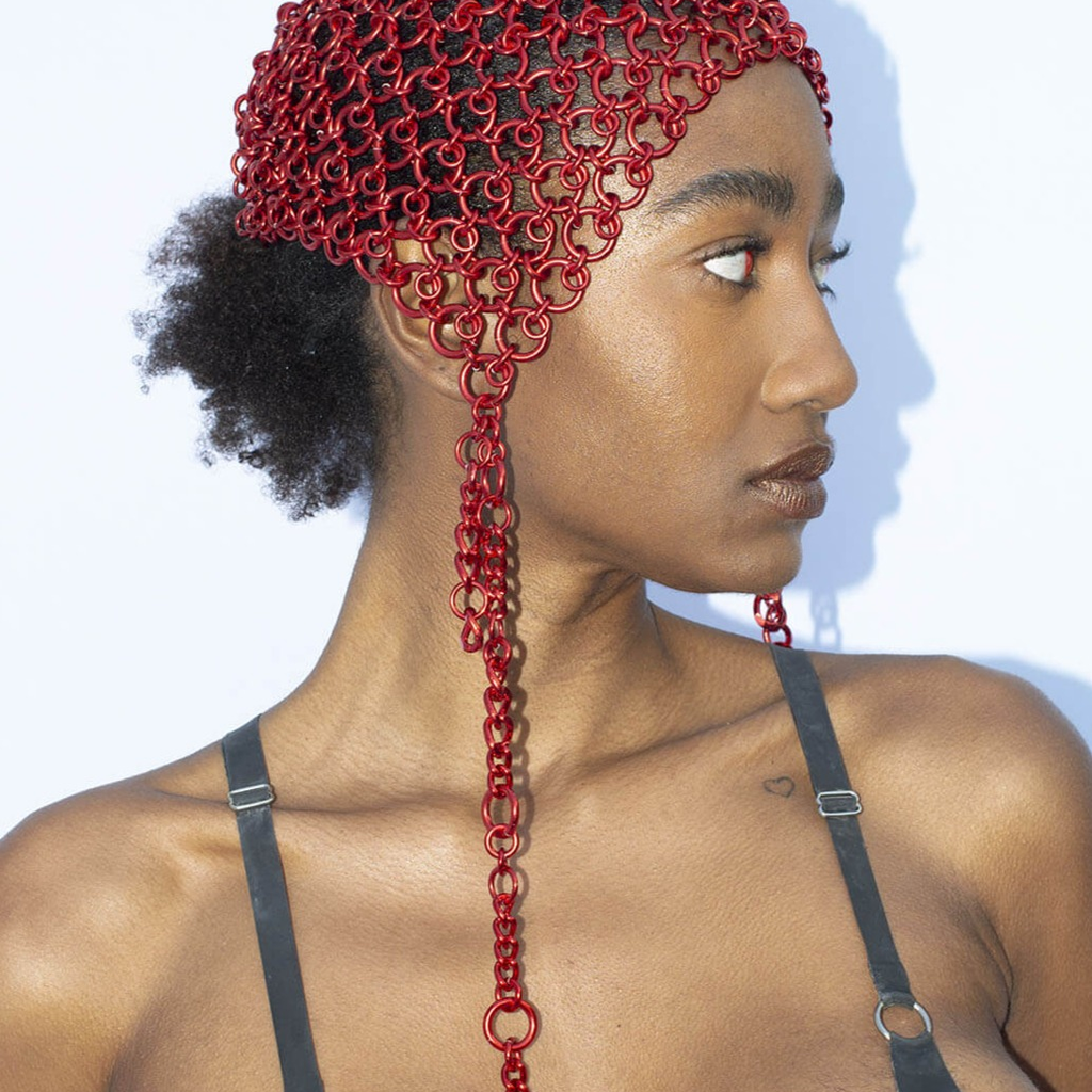 Metal headpiece handmade in São Paulo. All rings are aluminum so the piece is not heavy and is also very resistant. Since it is a mesh construction it adjusts to different heads. It can be washed with water and neutral soap if necessary.