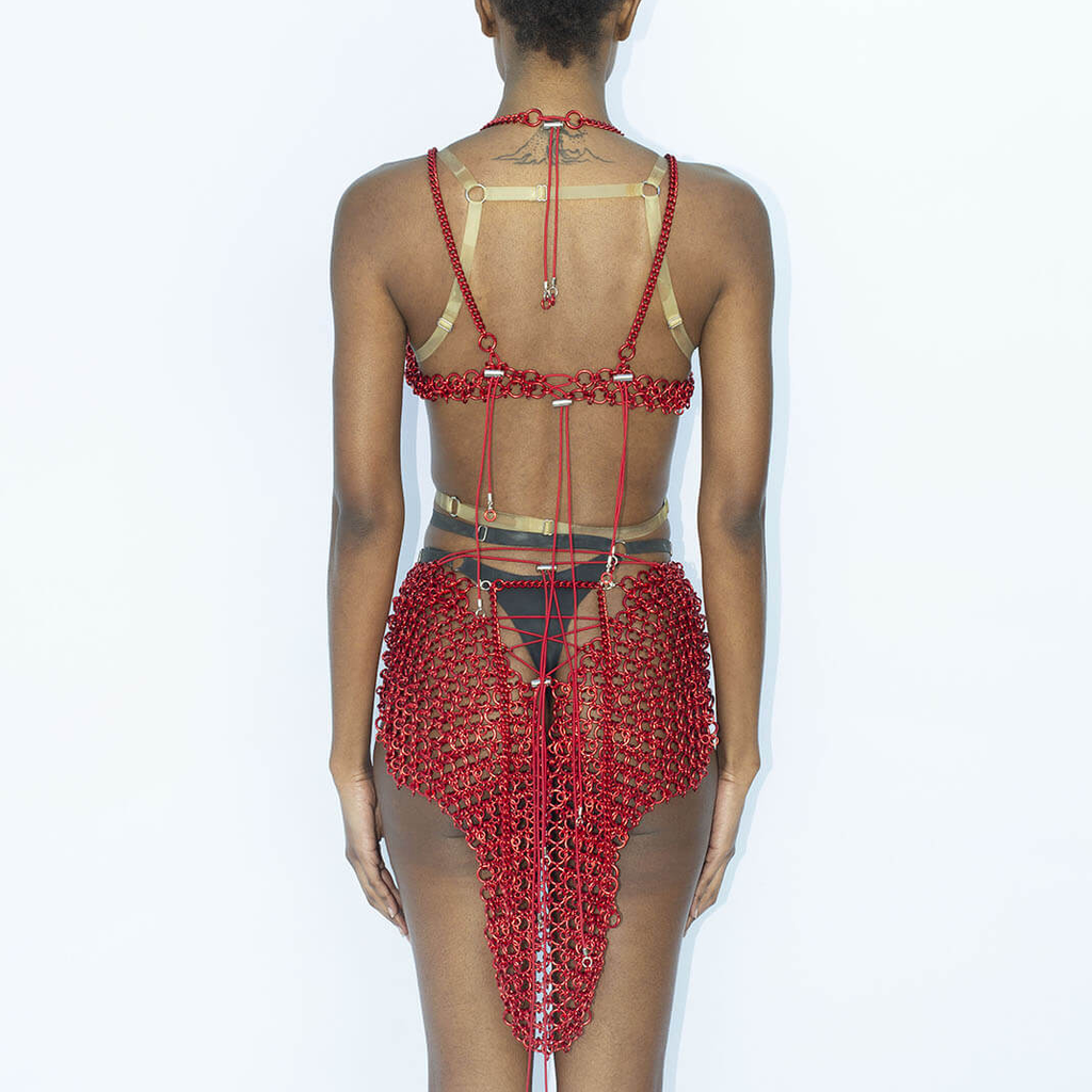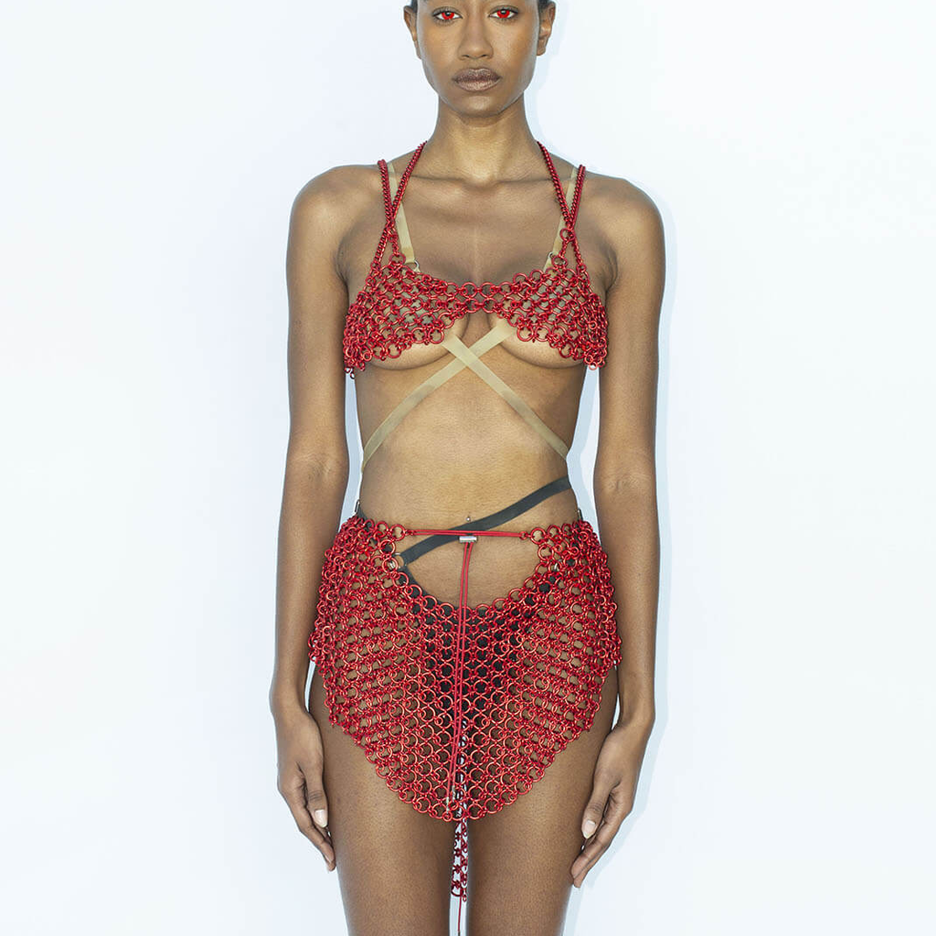 Jalaconda is a multidisciplinary artistic project, focused on the body. The LGBTQIA+ brand researches unconventional materials, such as latex, steel and natural Brazilian stones. They aim to discuss the place of manual work and personal adornment, knowing that clothes are fully political as they are from a country historically full of complexities.