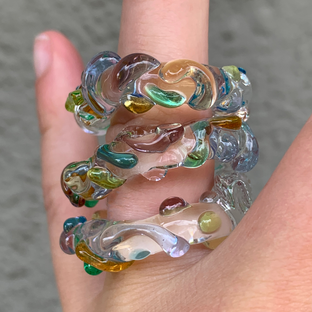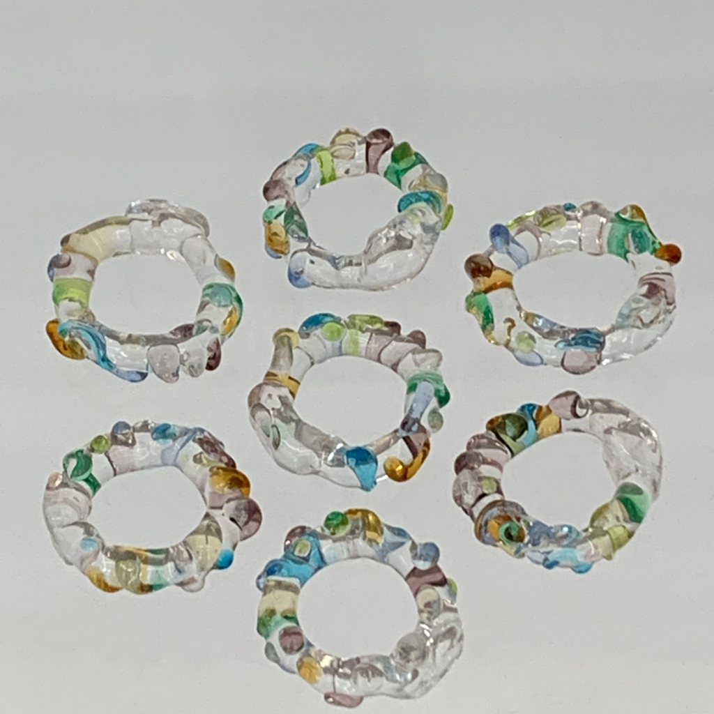 Handmade Murano glass ring with 9 transparent colours. The design of this ring leads to natural inconsistencies in the glass strokes adding character to each piece.