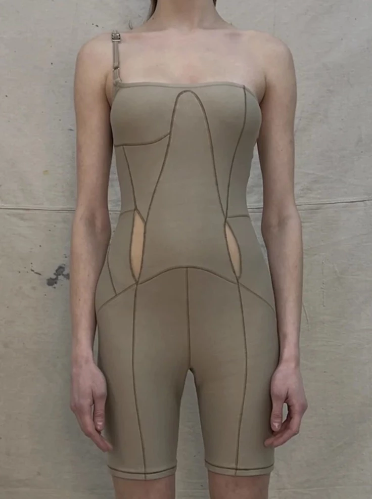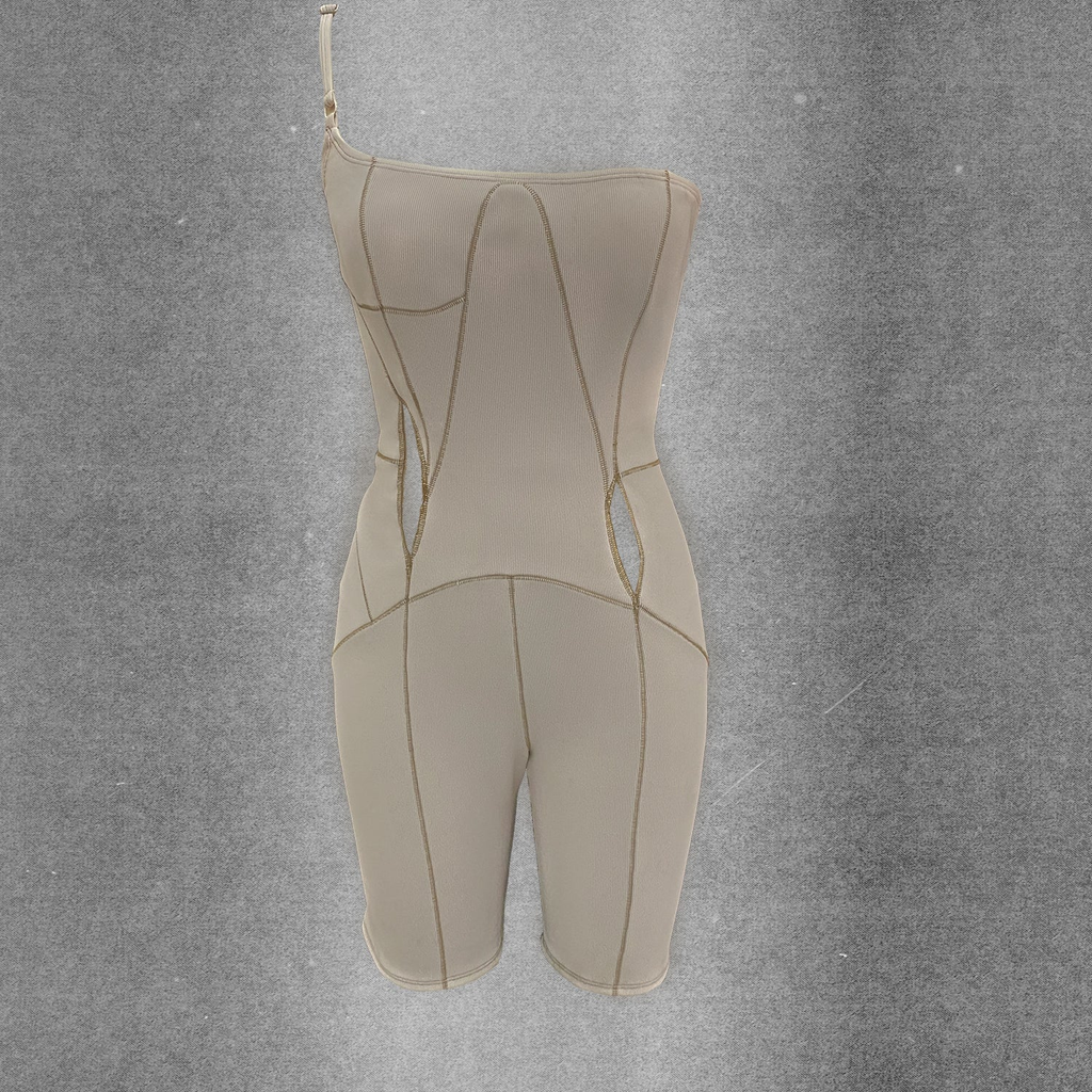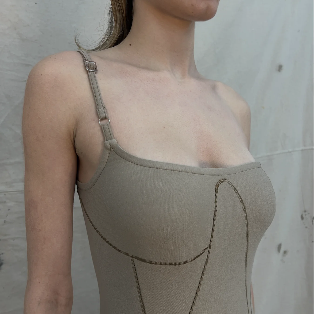 The rib knit jumpsuit in shade ecru is cut in a four-way stretch poly interlock, contrast stitched along lingerie lines in fawn brown. The jumpsuit features a single adjustable shoulder strap, stabilizing gel tape adhesive across the neckline and invisible mesh-lined cutouts.