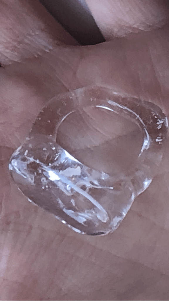 Chunky ring, transparent highly resistant borosilicate glass. Each piece is made by hand and one of a kind, so shape may vary.