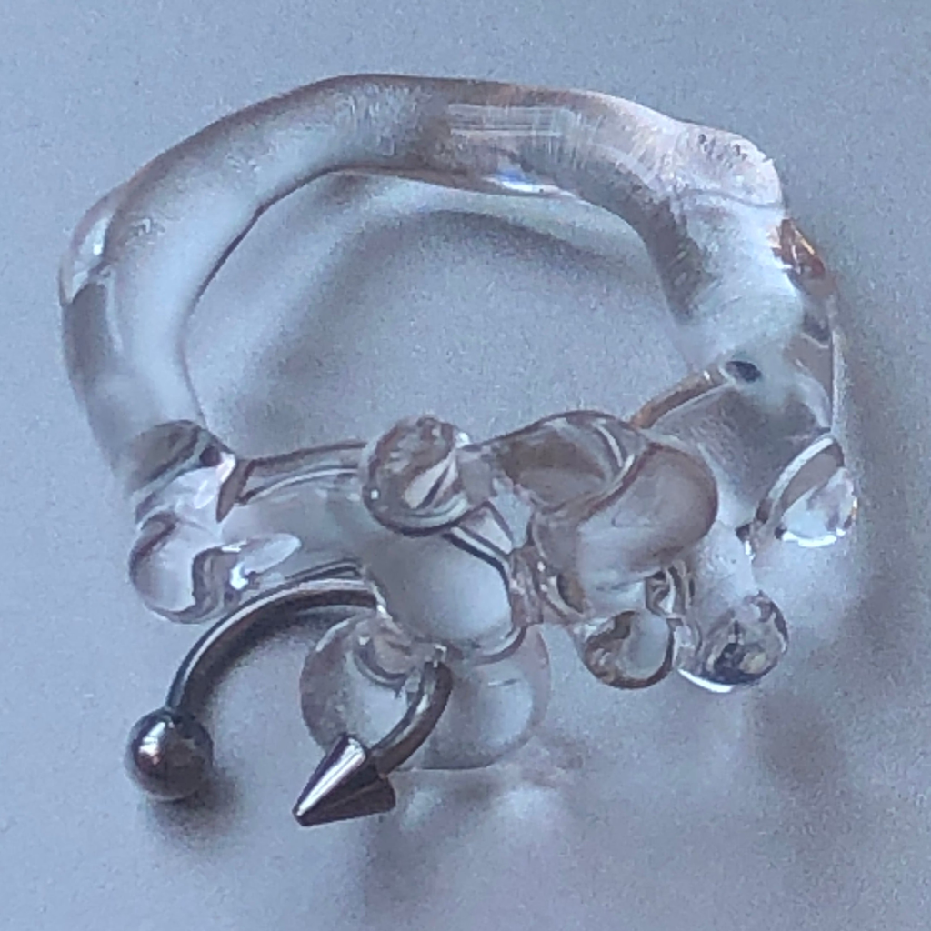 Transparent highly resistant borosilicate glass. Single piercing 100% Steel. Each piece is made by hand and one of a kind, shape may vary.