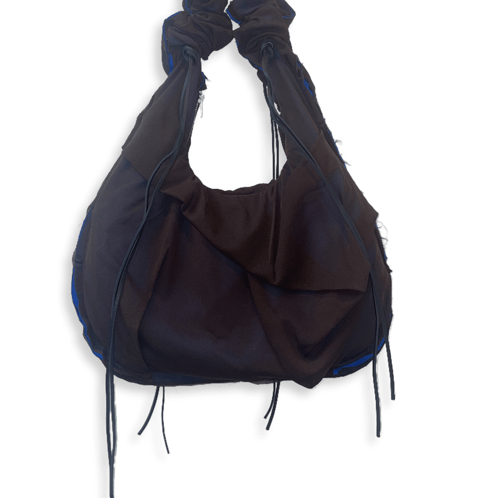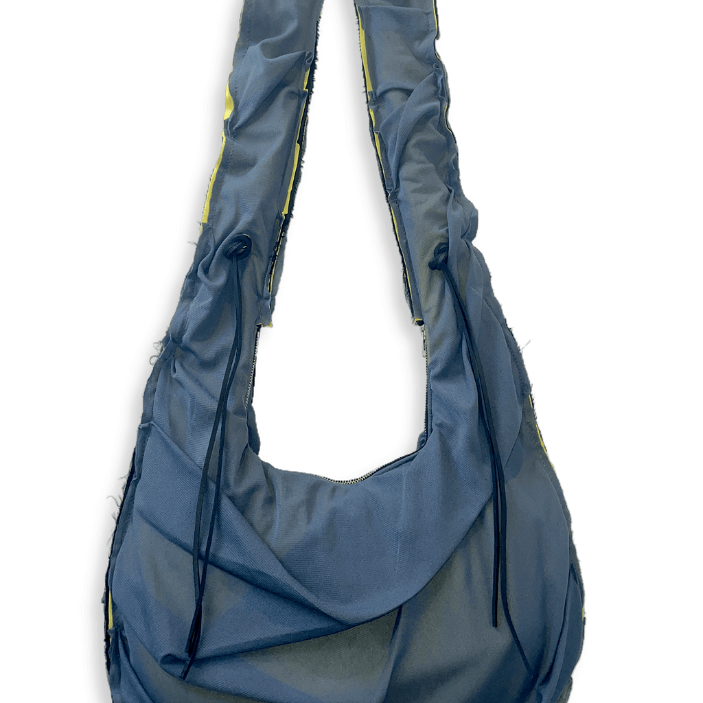 Draped Mesh Bag with Adjustable strap and zipper closure. Exposed edge seams.
