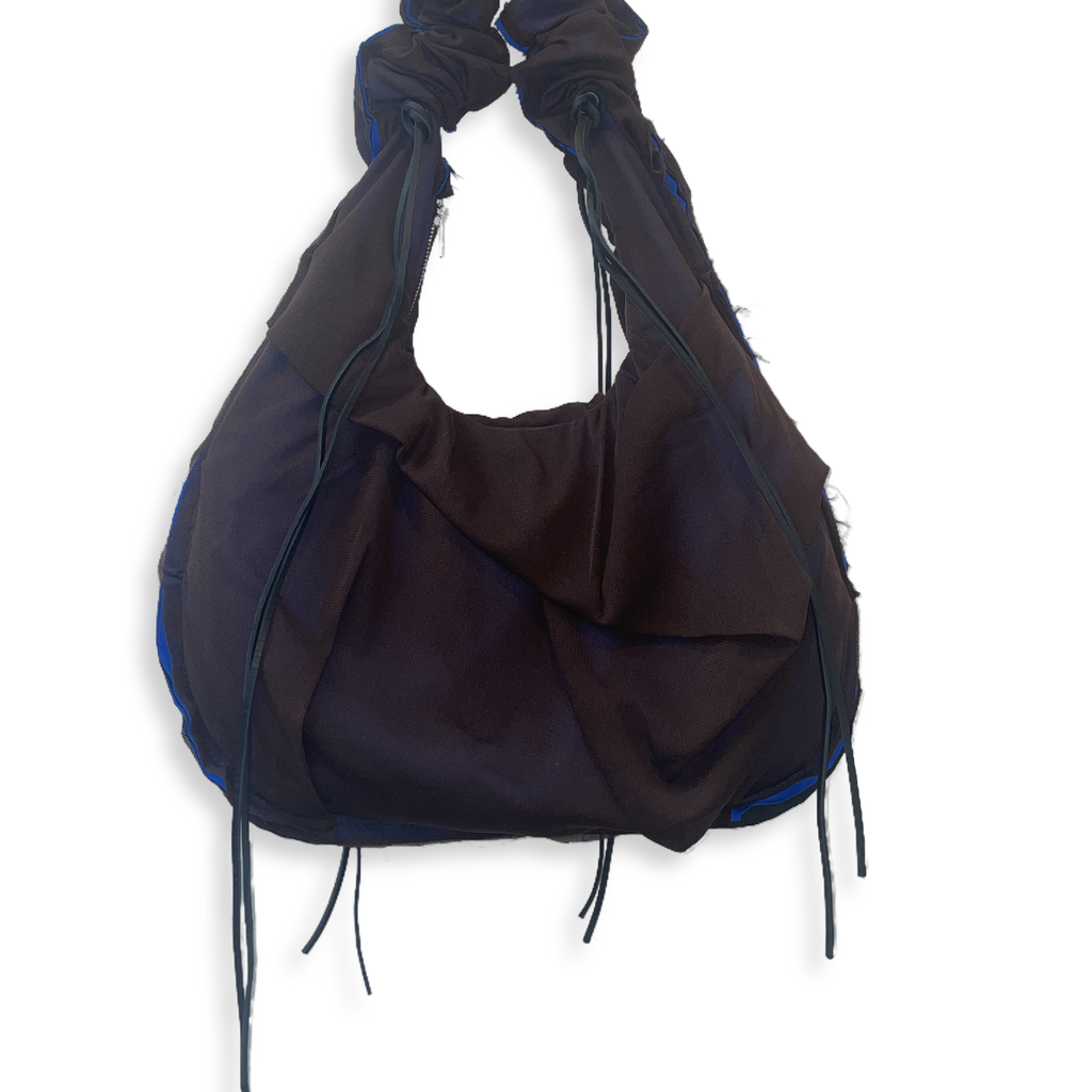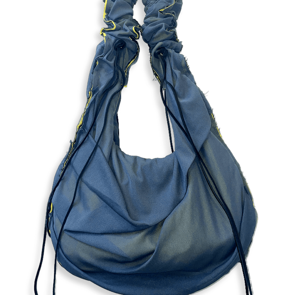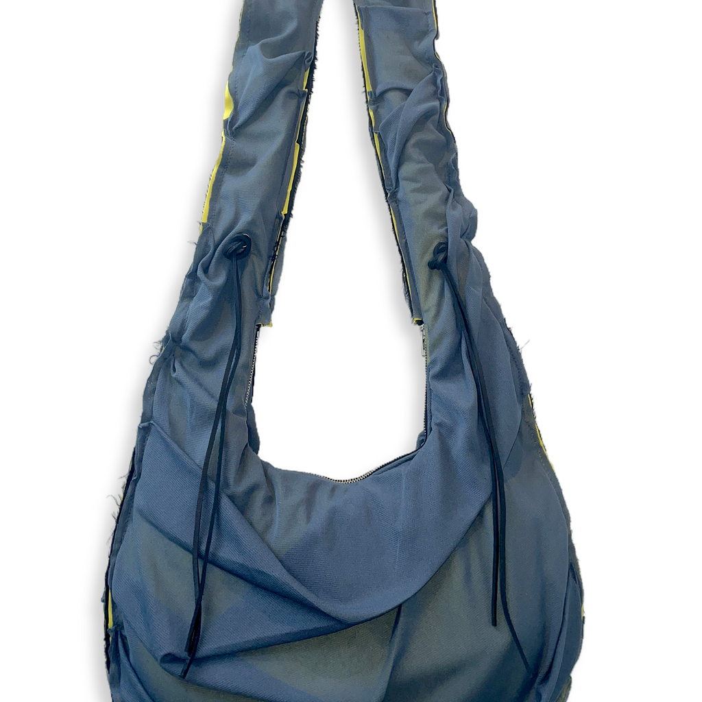 Draped Mesh Bag with Adjustable strap and zipper closure. Exposed edge seams.