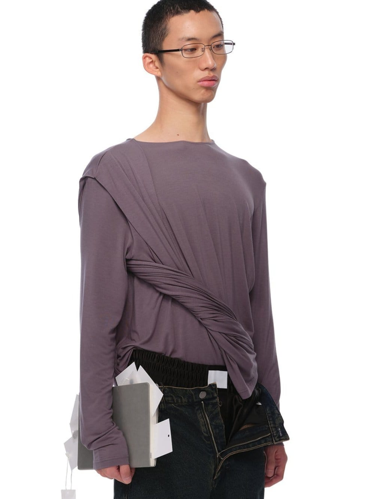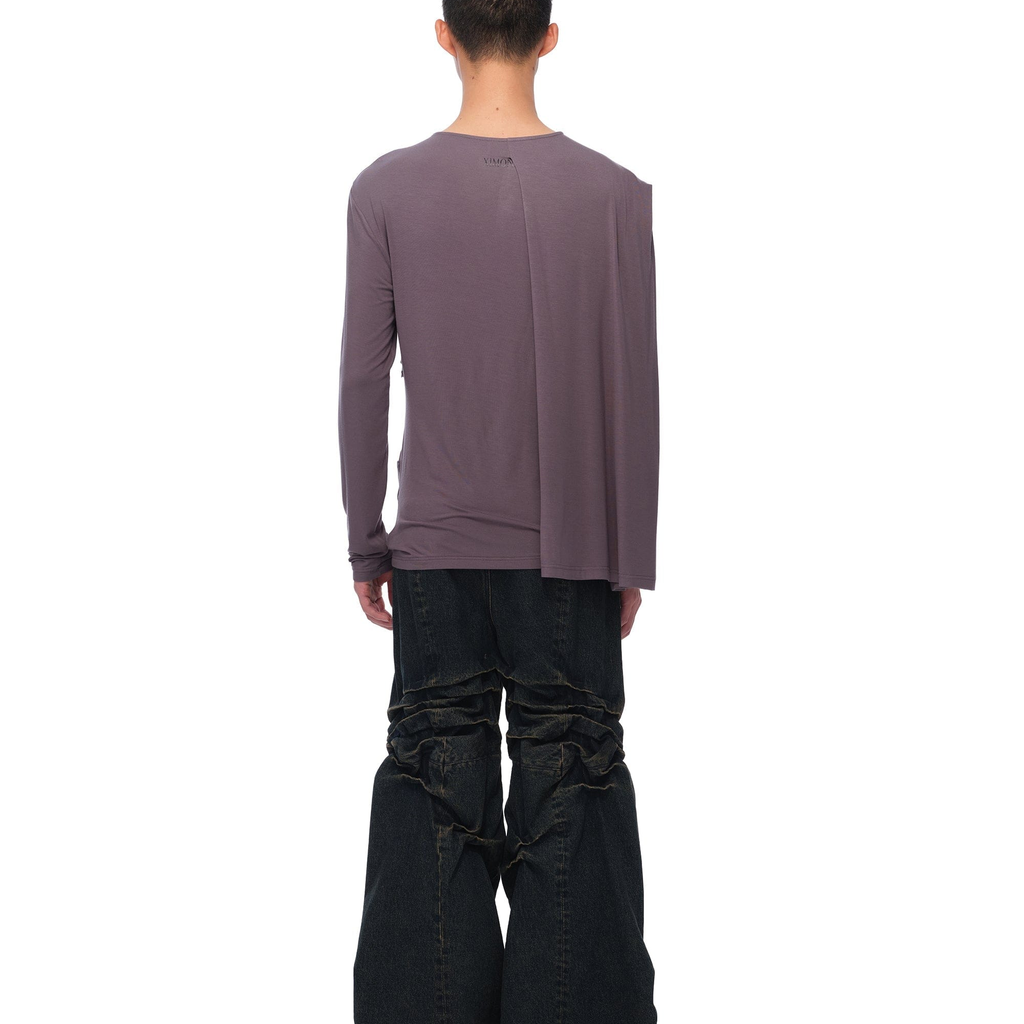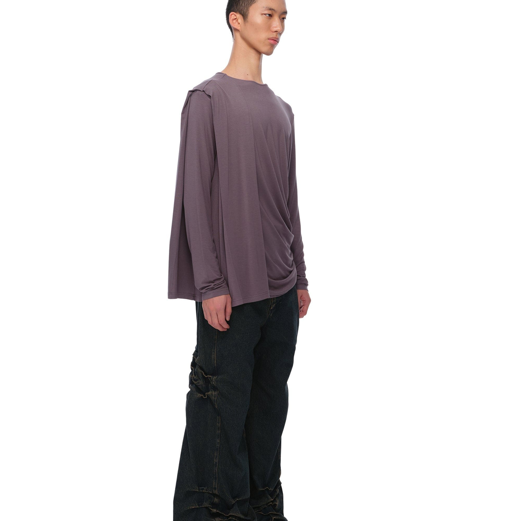 Layer detail on right side. Assymetrical pleats detail. Partially visible brand logo print. Regular fit.