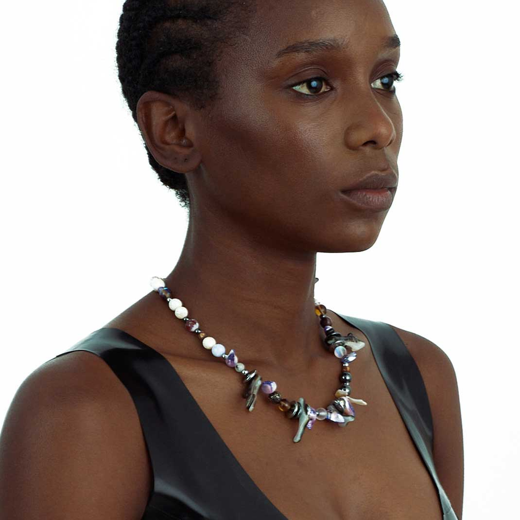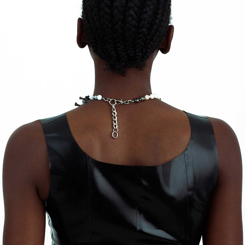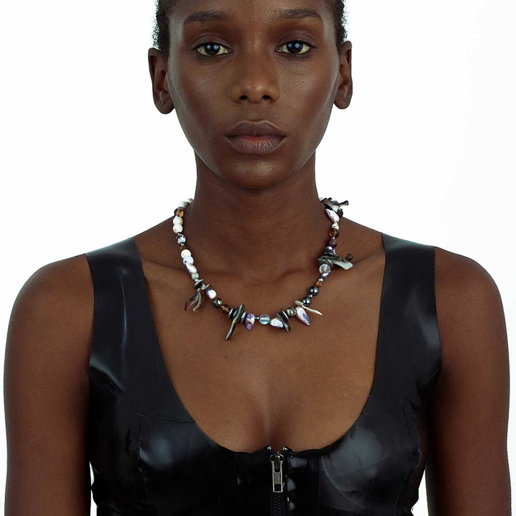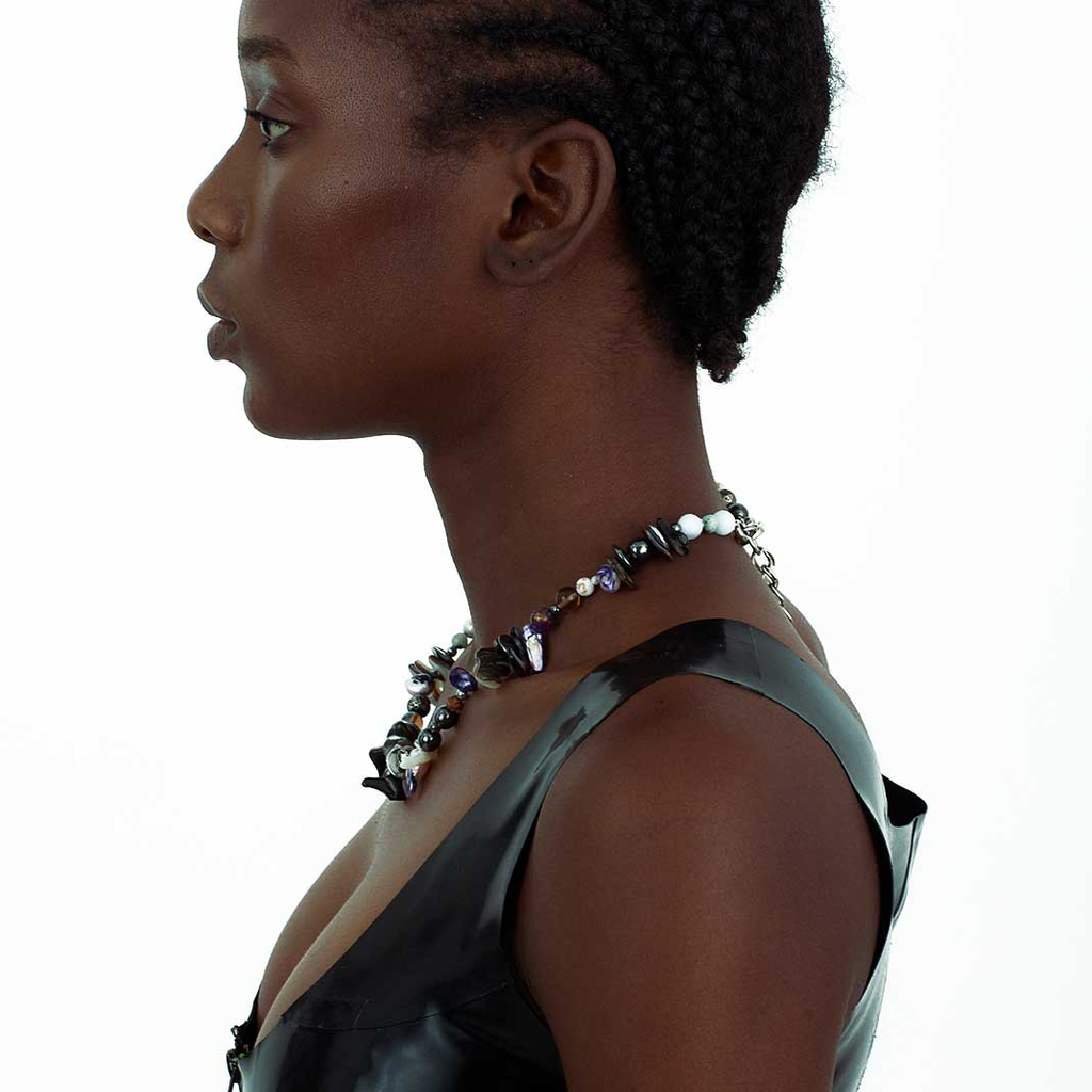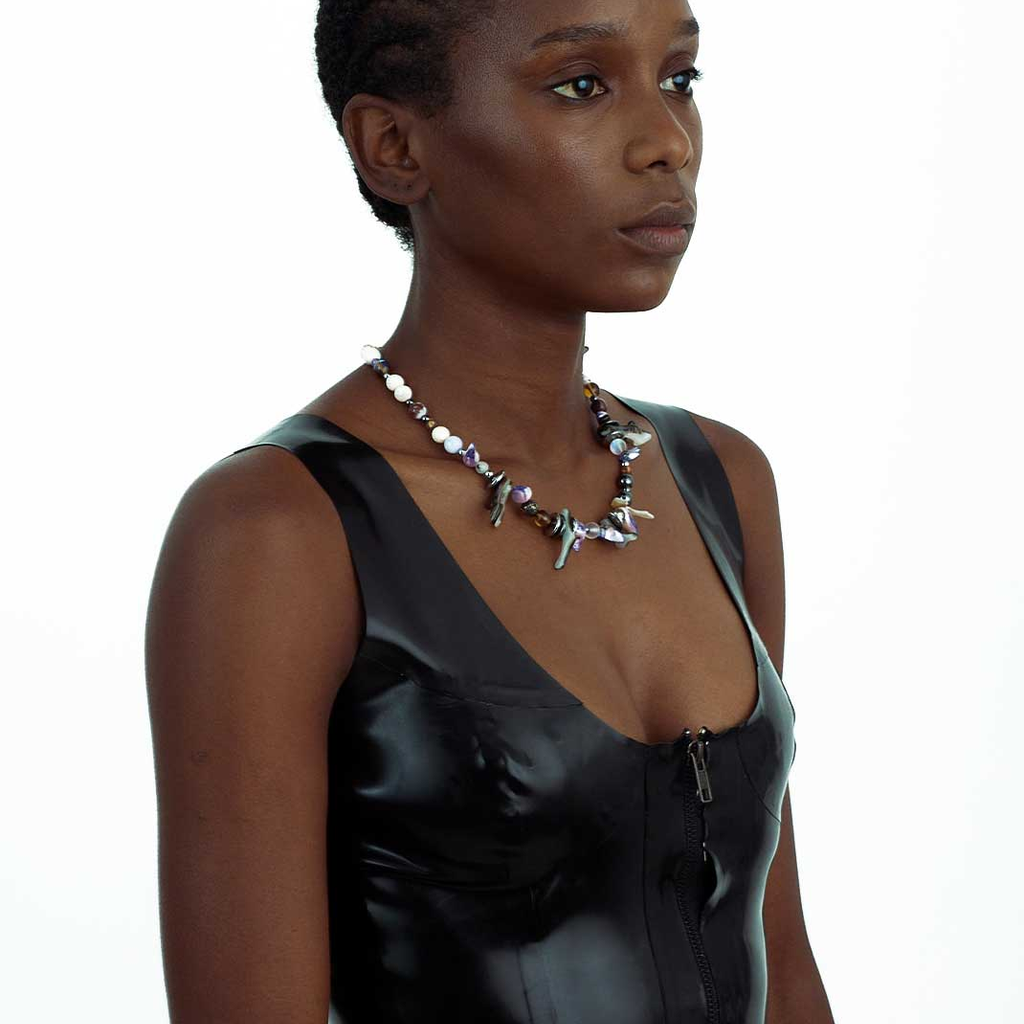 Jalaconda is a multidisciplinary artistic project, focused on the body. The LGBTQIA+ brand researches unconventional materials, such as latex, steel and natural Brazilian stones. They aim to discuss the place of manual work and personal adornment, knowing that clothes are fully political as they are from a country historically full of complexities.