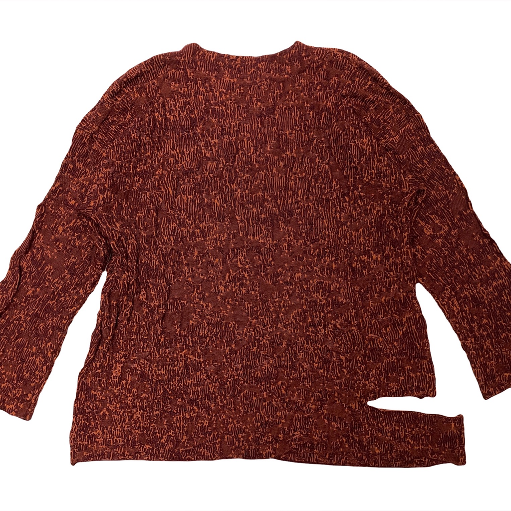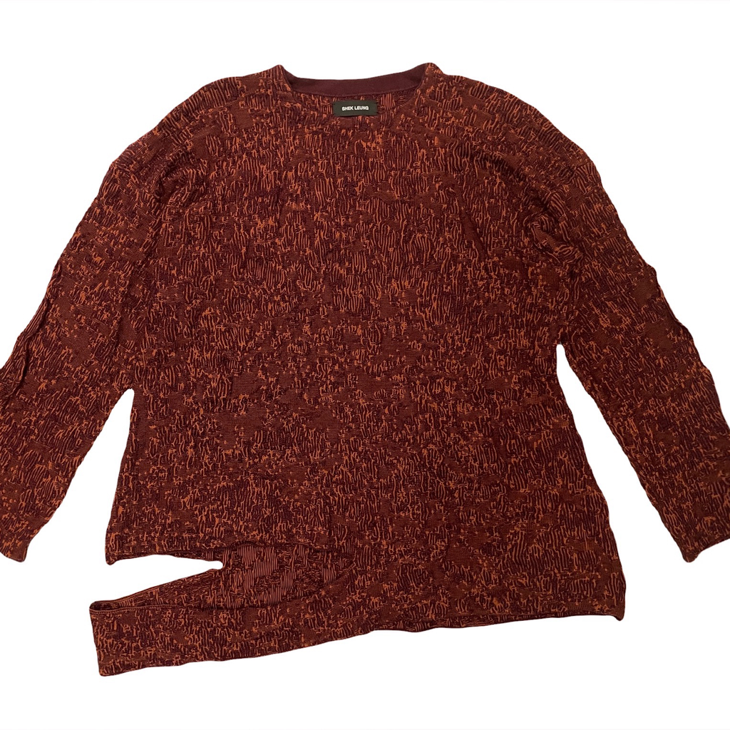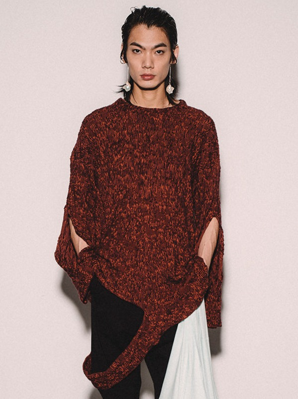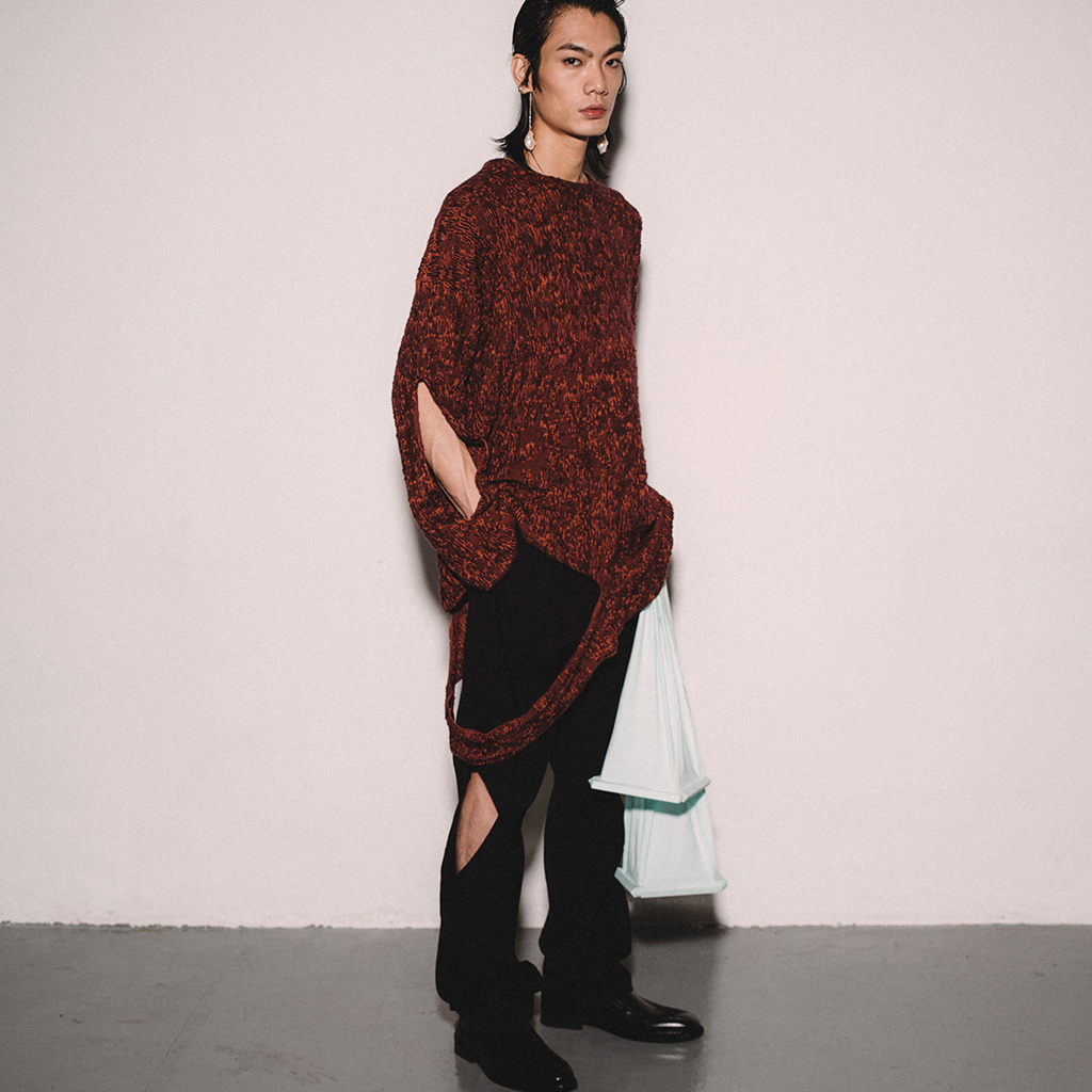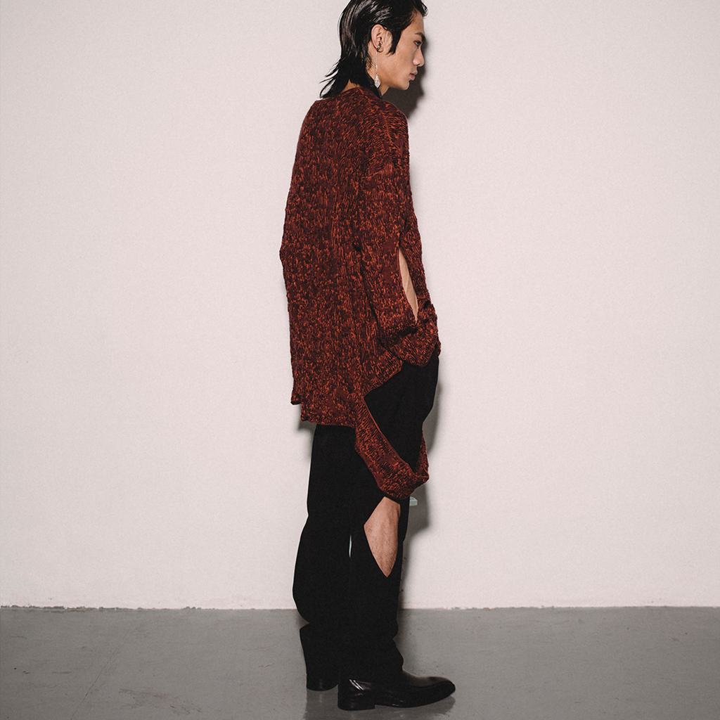 Made in Italy, the visual texture of this incredibly soft merino wool jumper was originally developed from the hand-drawn film noise print across the collection. It was then translate into a textural experience through knitwear, featuring oversize cut out details on the sleeve to reveal part of your arm to create subtle sensuality. It is finished with an asymmetrical cut out along the hem of the body, allowing it to be draped or twisted gently on the side. This jumper pays homage to workers with towel hanging on their body, a development detail from our SS23.