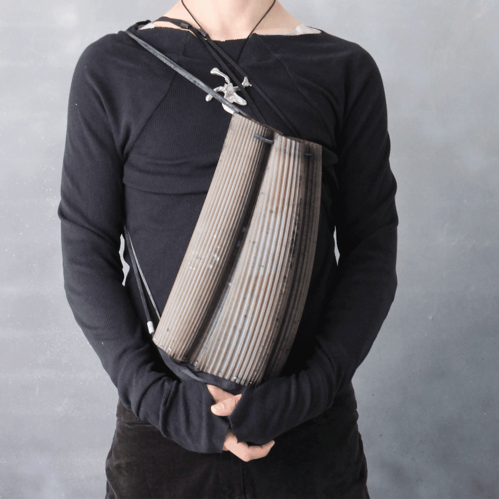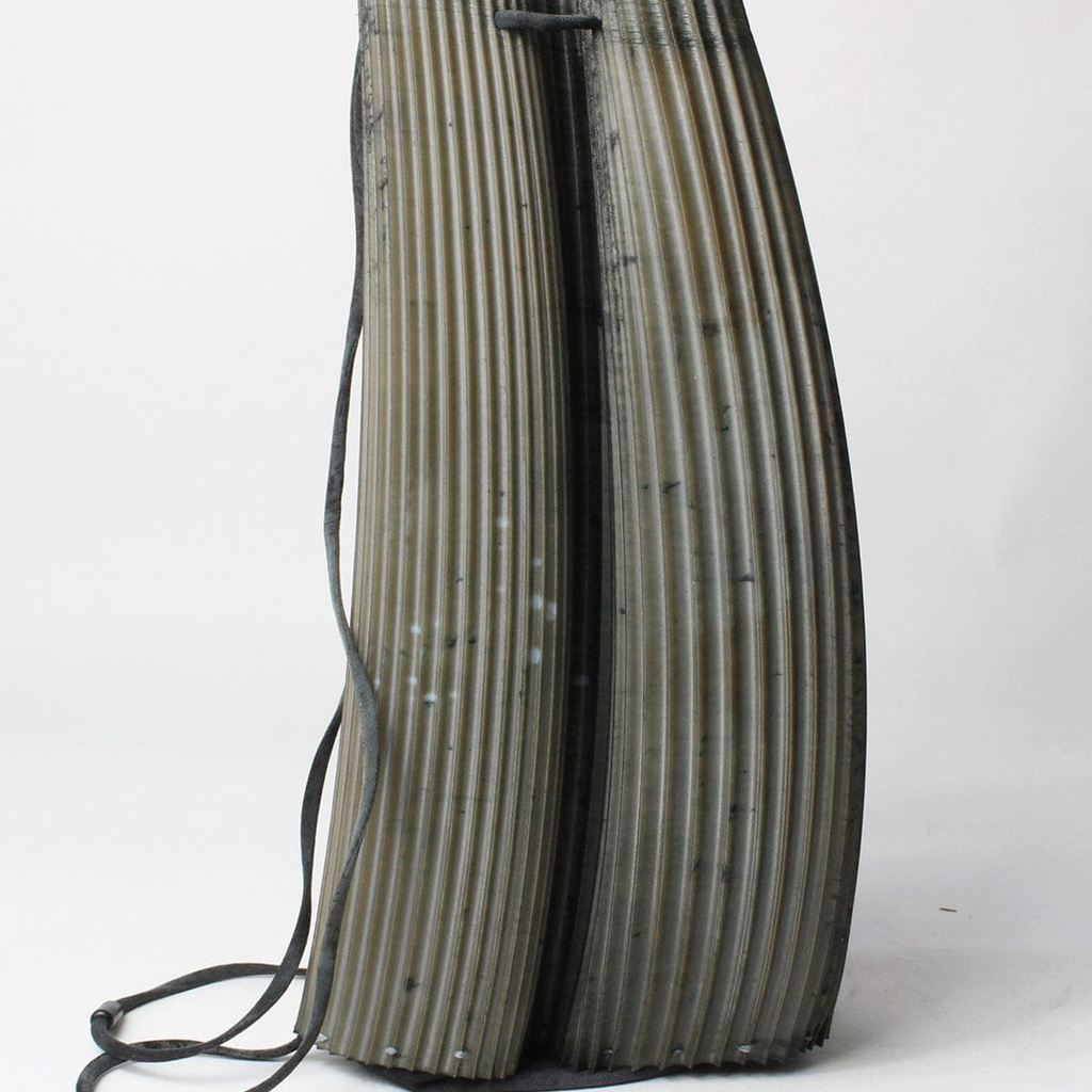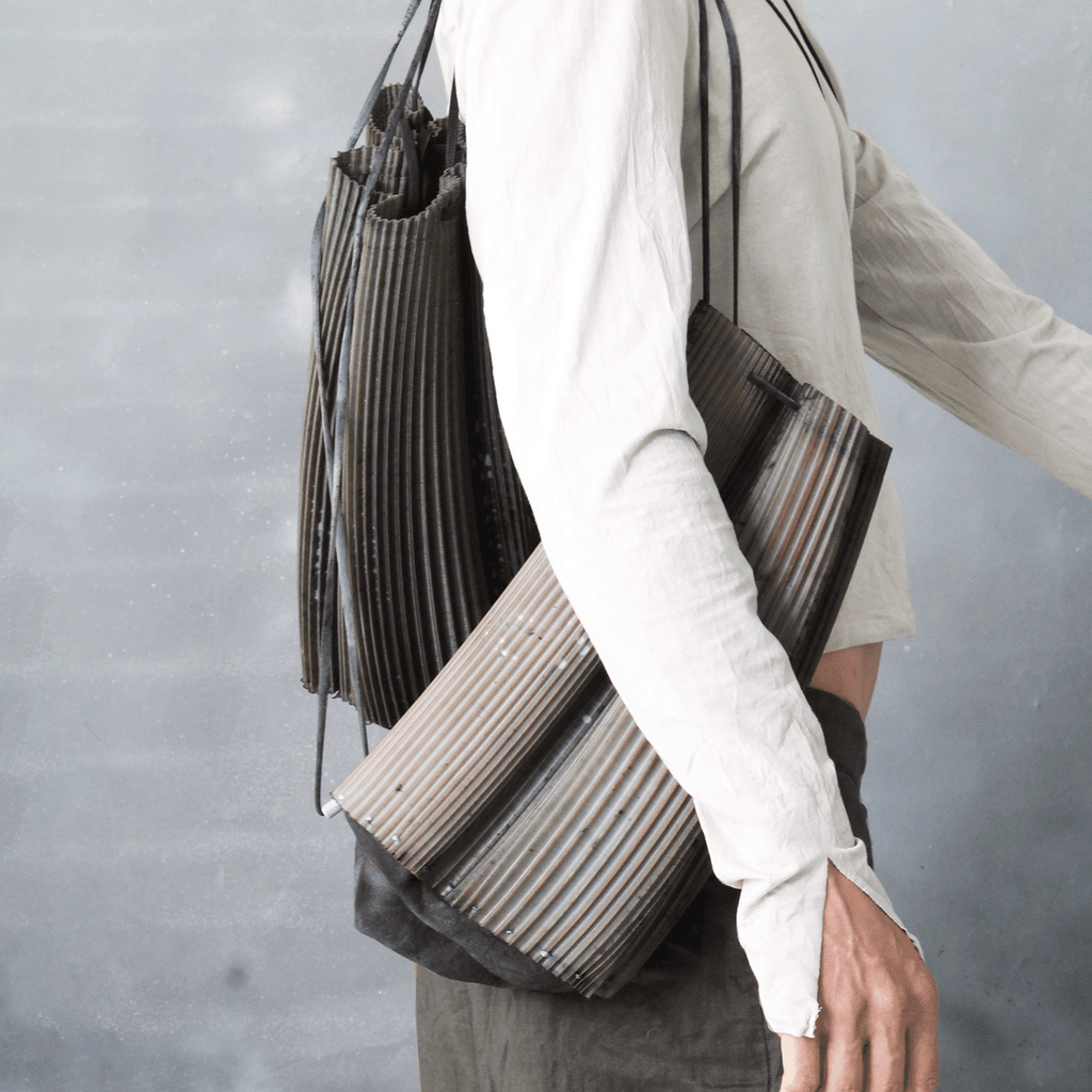 Rubber Bag to be worn as a sling bag, a cross body bag, a shoulder bag or a backpack. Its geometry allows for expandability. The main body of the bag is made from a fully recyclable and highly flexible polyurethane rubber. It is hand-dyed. The bottom of the bag is made from upcycled denim sourced in London. Small deffects and punctuations in the prints are normal and unavoidable when 3D printing, they contribute to the aesthetic of the product. Colour may vary from images due to the hand-dying process.